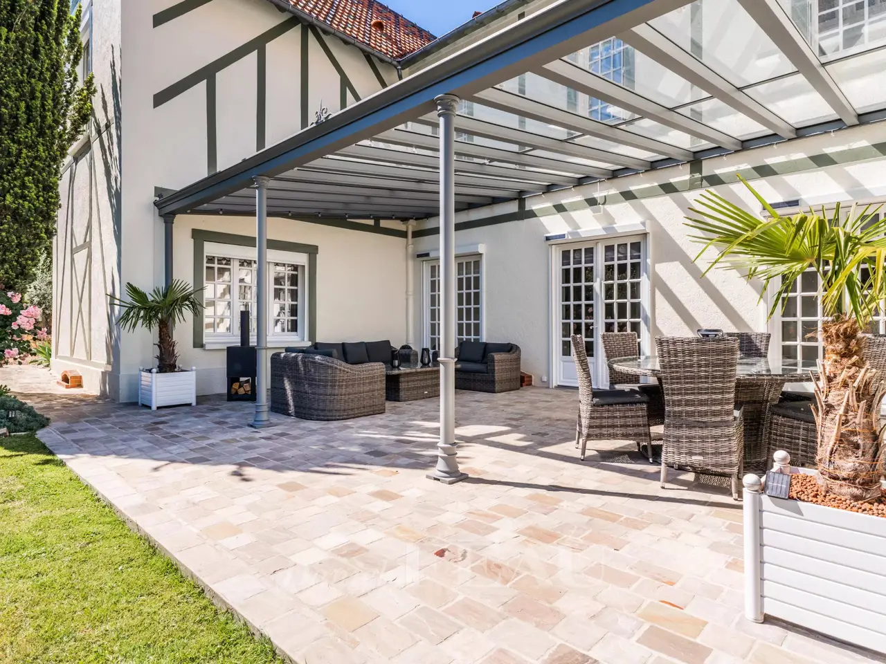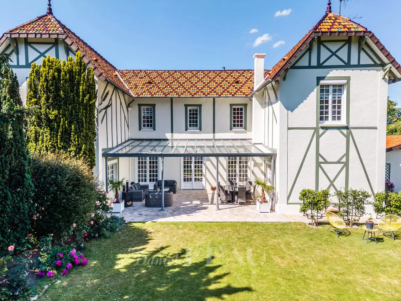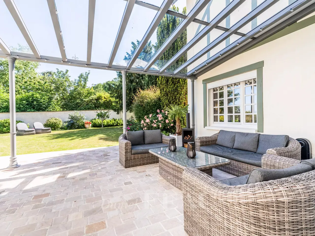 Built in the 19th century on a 985 m² wooded land, this remarkable character house evokes the charm of Belle Époque resort properties. With its painted wooden panels, flat glazed tile roofs and picturesque turret it has retained a lot of character. On the ground floor, a large entrance with dressing room, a lingerie and guest toilet, a small living room (or bedroom), a living room with fireplace opening onto a pergola of 55 m² and the garden with trees and without opposite. Large dining kitchen of 44 m² and adjoining storeroom. Upstairs, two suites and an office, three bedrooms and a bathroom, separate toilet. The total basement offers a magnificent wine cellar, boiler room and storage space. Outside there is a dependence that can be converted, a garage for two vehicles, parking also easy in the outdoor courtyard. Property in perfect condition, the set emits a lot of presence while maintaining a family dimension. Only 5 minutes walk from the station of Villennes Sur Seine, line L for Saint Lazare and future RER E (to come), nursery schools and primary schools and local shops. Bus to the international high school of Saint-Germain-en-Laye and Notre-Dame les Oiseaux in Verneuil Sur Seine. Piscinable ground.