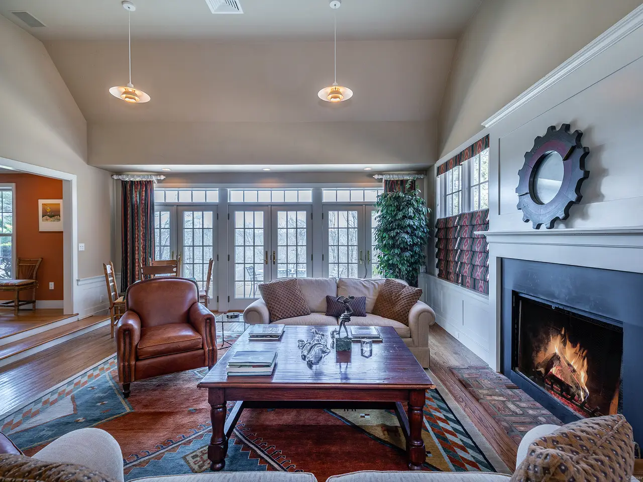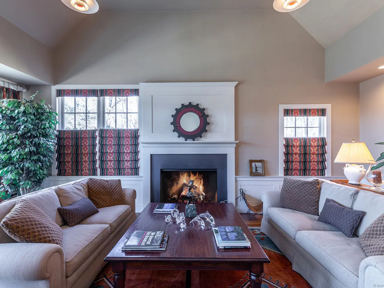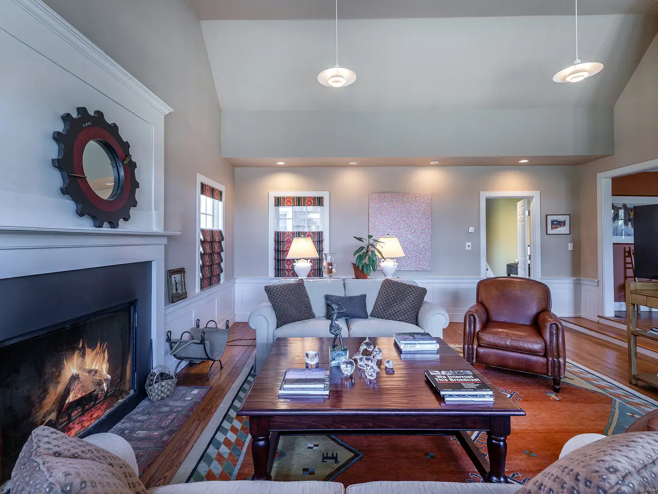 Vaulted living room with 2 fireplaces