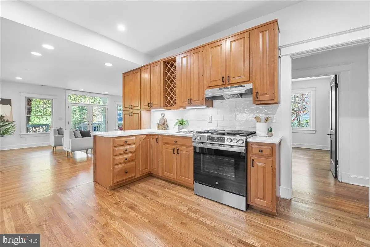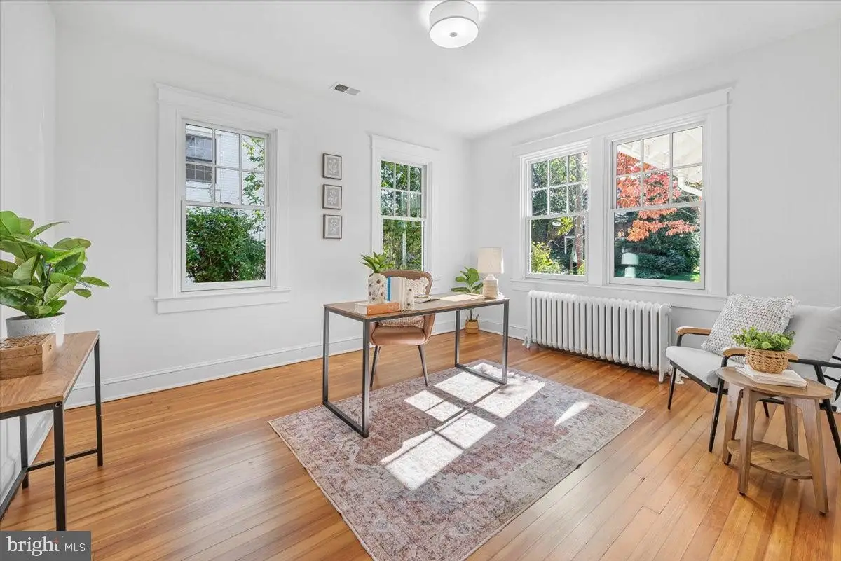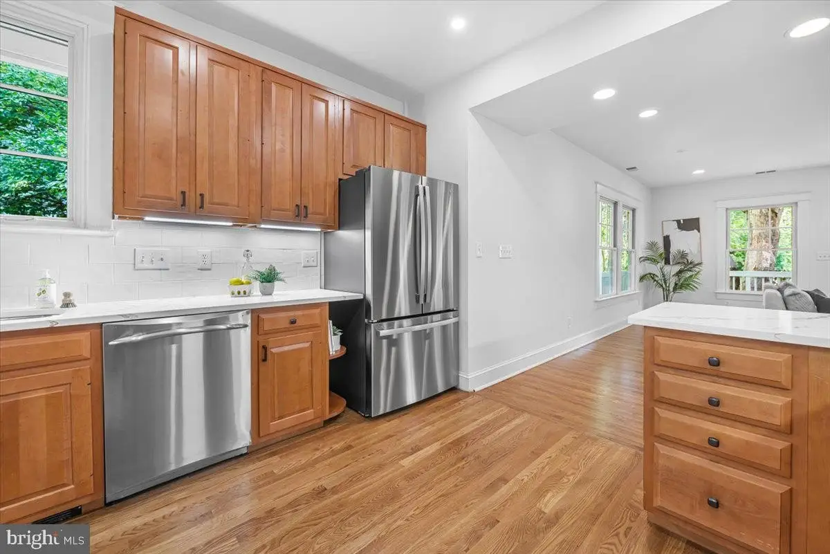 In the highly desirable American University Park neighborhood, this expanded Craftsman-style bungalow seamlessly blends timeless 1920s charm with modern comfort and ample space. Spanning over 2,900 square feet above grade, the home features five bedrooms and three and a half bathrooms, including an upstairs primary suite with stunning treetop views. Sunlight pours into every room through generous windows, highlighting the warmth of the hardwood floors, solid doors, and detailed trim that preserve the home's period character. The renovated kitchen boasts quartz countertops, stainless steel appliances, and ample cabinetry, providing a seamless connection to the dining and living rooms, perfect for daily living and entertaining. A spacious, sunlit family room with French doors opens to a wide deck that overlooks one of the neighborhood's most extraordinary backyards. The double lot, encompassing more than one-third of an acre, feels like a private park, complete with mature trees, gardens, and open lawn areas that invite outdoor gatherings and peaceful evenings. The unfinished lower level offers excellent storage, a laundry area, and a separate entrance, allowing for flexibility in future use. The long driveway and one-car garage provide ample off-street parking, with additional on-street parking available for guests. Updated with new windows (2024) and a new roof (2021), this home combines classic character with modern comfort and efficiency. Situated on a quiet, tree-lined street, this beautifully expanded home reflects the charm of its neighborhood and the convenience of its ideal location-just a few blocks from Turtle Park and Janney Elementary, as well as various local spots like Millie's, Wagshal's, Bluestone Lane, and Starbucks. The Friendship Heights and Tenleytown Metro stations are approximately one mile away. Welcome home.