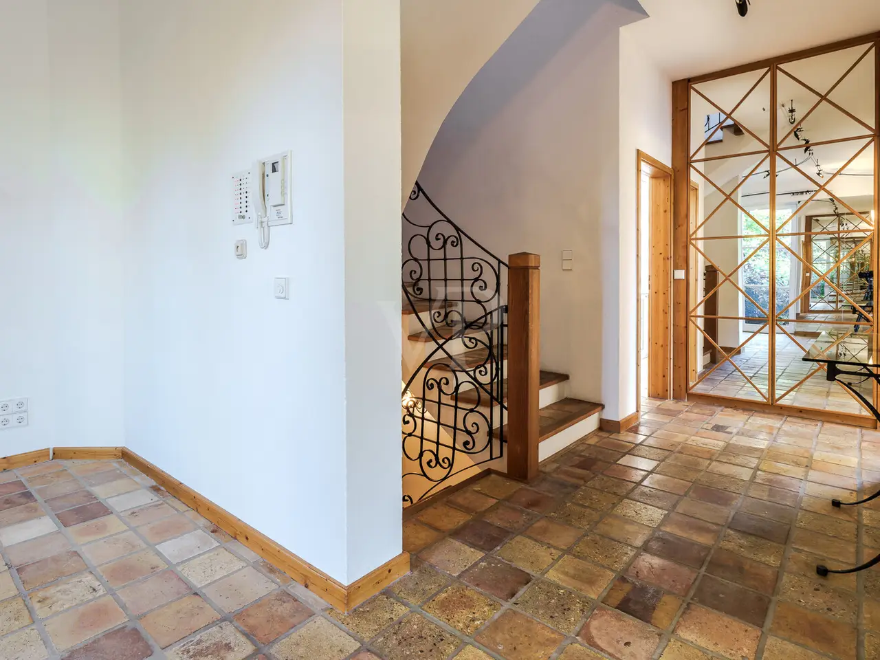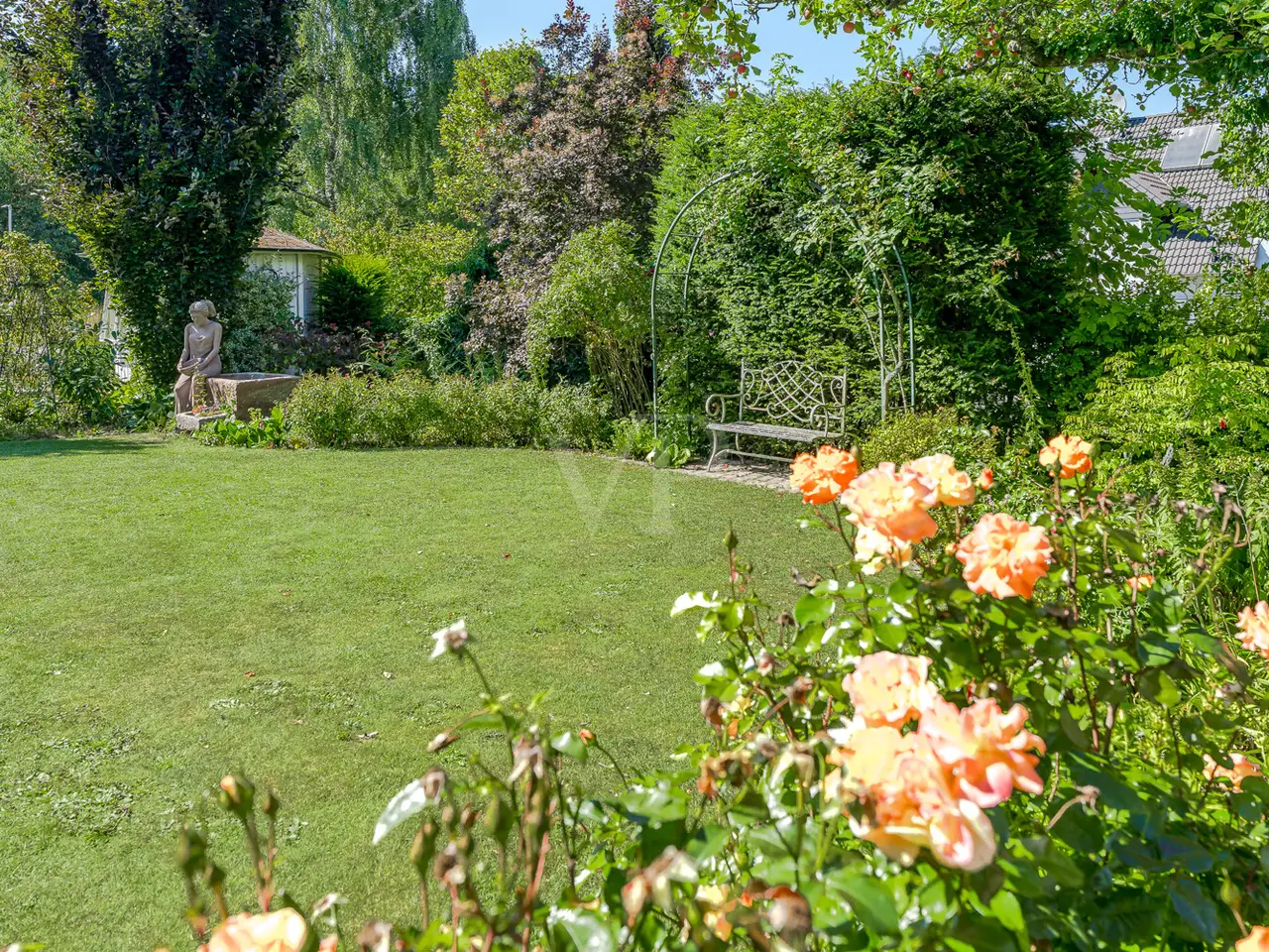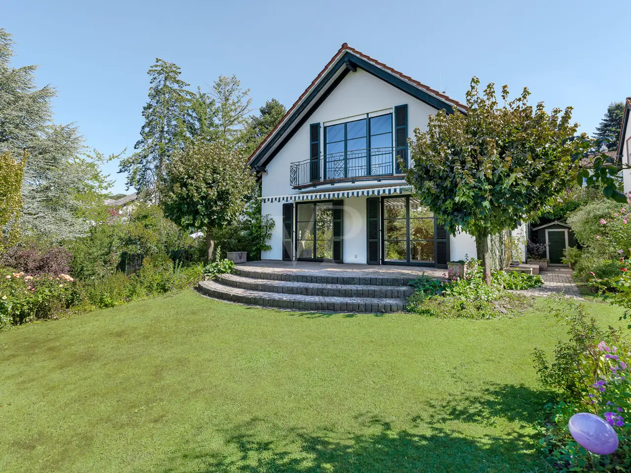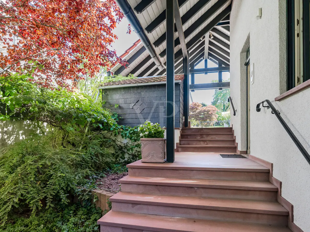 Just a few steps - and you are in the middle of the Taunus forest. Whether hiking, cycling or enjoying nature: here your leisure paradise starts almost on your doorstep. A wide range of leisure activities (such as tennis, horse riding, gliding, etc.) and the short journey time to Bad Homburg or Frankfurt will quickly convince you of Obernhain's location. Here in this sought-after residential area of Wehrheim-Obernhain, in a quiet and family-friendly environment, you will find this very special two-family house, which consists of two separate house halves, each with separate entrances. This results in a variety of possible uses: Living and working under one roof, as a multi-generational house - each for themselves and yet together, or for owner-occupation and partial letting to third parties, which offers attractive financing options. The solidly built house with two storeys and a full basement is in excellent condition with high-quality fittings and selected materials. There are 8 rooms in total, including 4 bedrooms and 2 bathrooms. Floor-to-ceiling window elements and the comfortable ceiling height of 2.93 m ensure light-flooded rooms and a pleasant living ambience and provide views of the romantic garden and the plants around the house from all rooms. A terrace adjoining the living area across the entire width of the house offers ideal conditions for enjoying the garden, which is virtually secluded in summer, as well as peace and privacy. Special features of the garden-side half of the house: The antique, French cotto flooring throughout the first floor exudes a very special charm and is complemented on the upper floor by solid country house floorboards in oiled oak. The light-flooded studio/bedroom is adjoined by a balcony that offers a romantic view of the garden. The daylight bathroom on the upper floor has a shower, bathtub and a double washbasin in Rosso Sardo with a ceiling-high mirror element. The first floor is dominated by the large, open living and dining area with access to the terrace, which can be separated by a sliding door. The current room divider, which can be used as shelving, can easily be removed, allowing for flexible use. Special features of the front building: Here, too, you can expect high-quality fittings with natural stone floors on the first floor (Jura banded), various built-in wardrobes including a mirrored wardrobe and also a room divider between the living and dining area, which can be easily removed. On the upper floor there are two further living/bedrooms, one of which has a dressing room and a daylight bathroom. From the balcony adjoining the bedroom, you have a wonderful view of the greenery. The technical equipment has a lot to offer, such as underfloor heating on all living levels, fiber optic connection, lightning and surge protection, as well as an alarm and water protection system in the garden-side house. Last but not least, the existing lighting with designer lamps reflects the special ambience. The boiler room in the basement is accessible from both houses and secured by lockable fire doors. The overall attractive design is also continued outside. Even the entrance area to the two halves of the house and the garden, in pink sandstone and the folding shutters, give the exterior of this house ensemble a very special flair. The low-maintenance garden behind the house with rose and shrub beds and a unique sandstone sculpture by the fountain invites you to linger and daydream. A spacious double carport with two additional parking spaces rounds off the offer. The property is available immediately. Get in touch with us today. We look forward to your inquiry.
