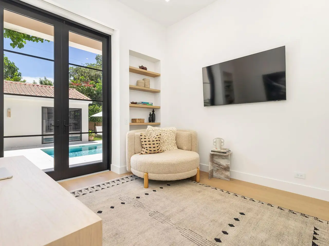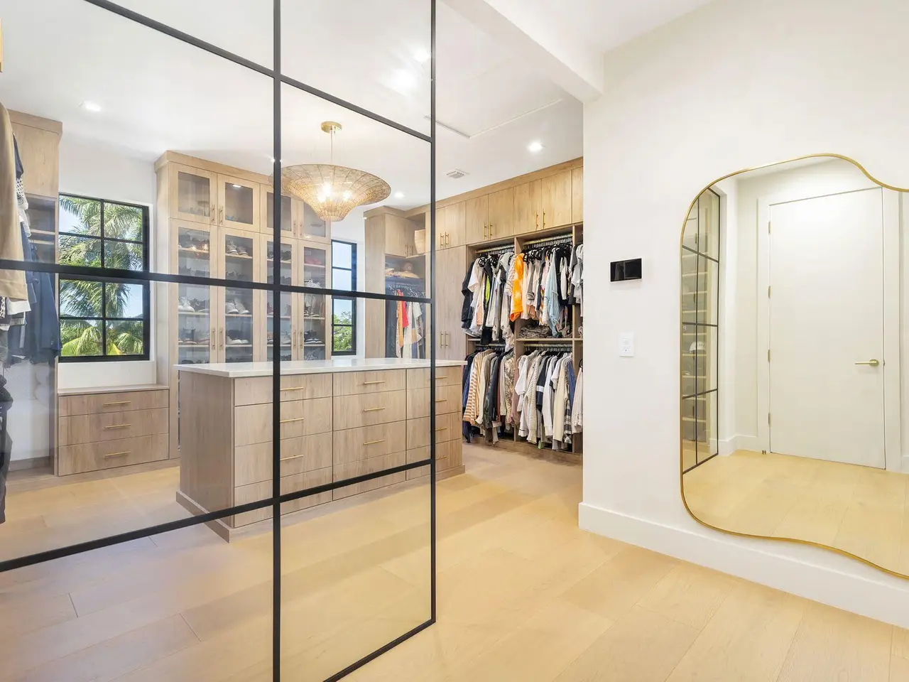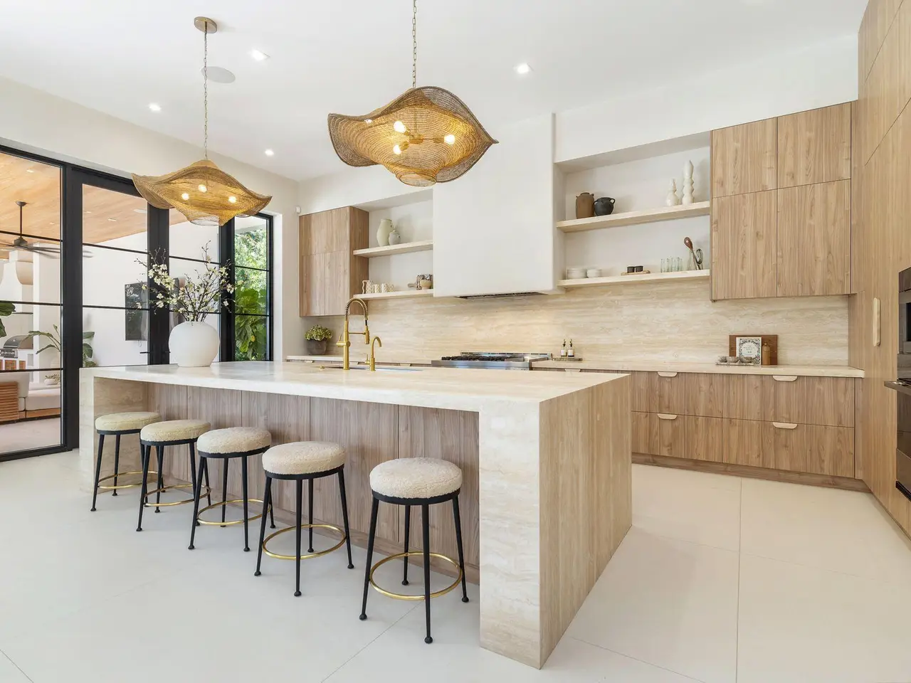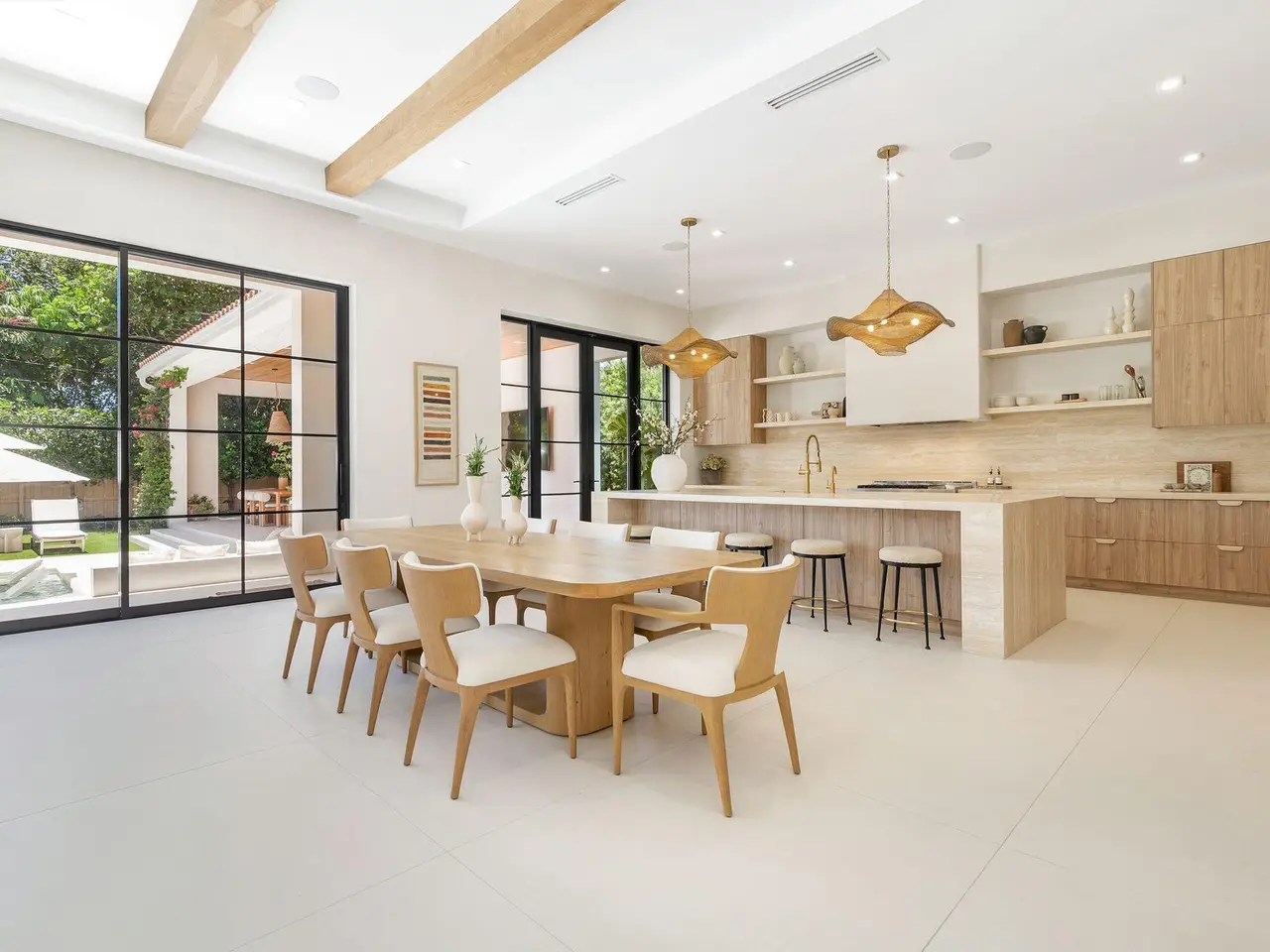 Uber-chic and effortlessly cool, this modern Mediterranean residence combines refined design with a warm, livable feel. Built in 2024 and offered fully furnished, the home features 4 bedrooms, 3 full baths, and 2 powder rooms -- completely turnkey and ready to enjoy. With 12' ceilings on the main level and a dramatic wall of 10' sliding glass doors, the interiors are open, airy, and designed for both everyday living and entertaining. The view from the custom front door carries straight through to the south-facing pool, where a Badu swim jet, covered loggia, summer kitchen, and gym/guest cabana create a true private retreat. Every element of the chef's kitchen has been thoughtfully considered, from the travertine countertops and backsplash to the custom pulls - this kitchen is dreamy!