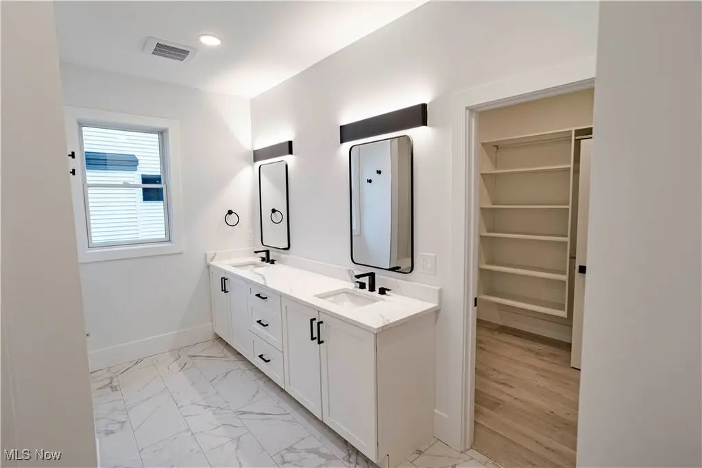 Built by EFG Custom Homes - This grand colonial modern farmhouse-style home in Westlake has something for everyone. The open concept floor plan has a spectacular vaulted Great Room, the perfect venue for entertaining and large family gatherings. This 5,380 square foot home including the finished basement with wet bar, comes with 4/5 bedrooms, 3.5 baths, and also features a formal dining space, a gourmet kitchen, stone counter tops, covered terrace for additional outdoor living space, and a three-car garage. The first floor owners suite is highlighted by a gorgeous en-suite and enormous walk-in closet. There is a flex space on the second level for a game room, plus 3 additional bedrooms. Smart home technology wired for data. Park-like lot backs up to the golf course.