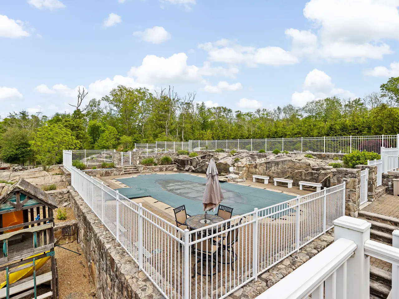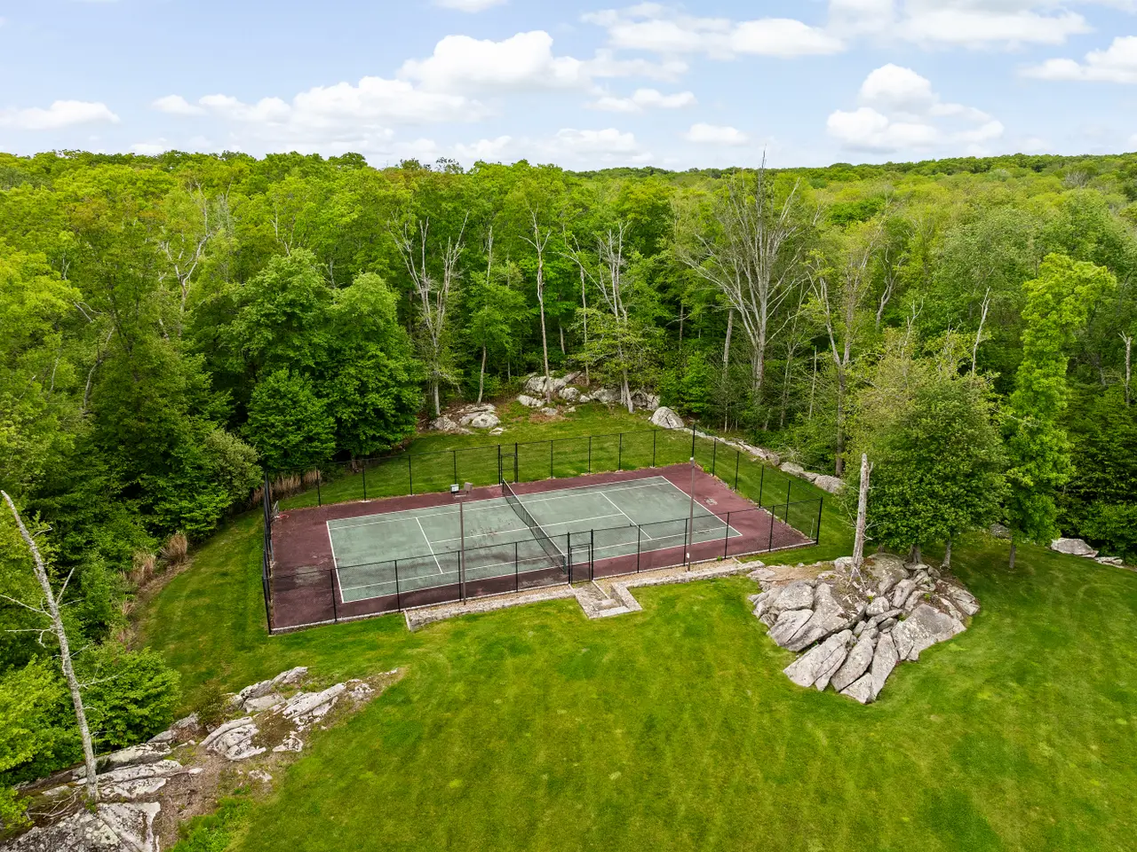 The residence features a variety of elegant living spaces, including a grand foyer, fireplaced living room, formal dining room, chef’s kitchen, and four-season room with indoor grill. A cozy family room opens through French doors to a pergola-covered deck overlooking the lush grounds. The primary suite includes an office, walk-in closet, and spa-inspired bath with jetted tub and tiled shower. A dumbwaiter provides added convenience across levels. The walkout lower level impresses with a theater, gym, playroom, studio, workshop, and garage access. Outdoor amenities include a heated saltwater pool with spillover spa, koi pond, tennis court, and artisanal woodfired grill—offering an exceptional blend of privacy, elegance, and resort-style living.