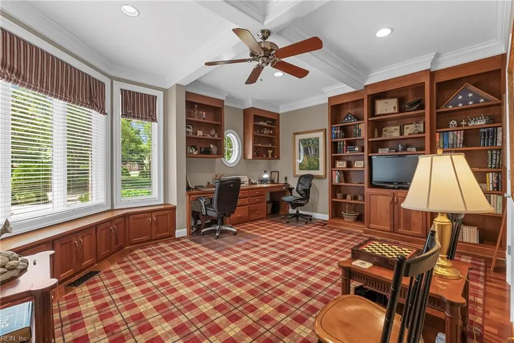 Welcome to Rivers Edge, one of Kingsmill's most coveted low-maintenance communities offering unforgettable pond views and exceptional living. This beautifully designed, mostly one-level home features 3 spacious bedrooms, 3.5 baths, plus a dedicated office with custom built-ins. Gorgeous hardwood floors, stunning trim details, and an elegant two-story family room with built-ins and a cozy fireplace create a warm and inviting atmosphere. Expansive water views grace the main living areas and most windows, providing a truly serene backdrop. Impeccably maintained with superb attention to detail this is the easy, elevated lifestyle you've been waiting for!