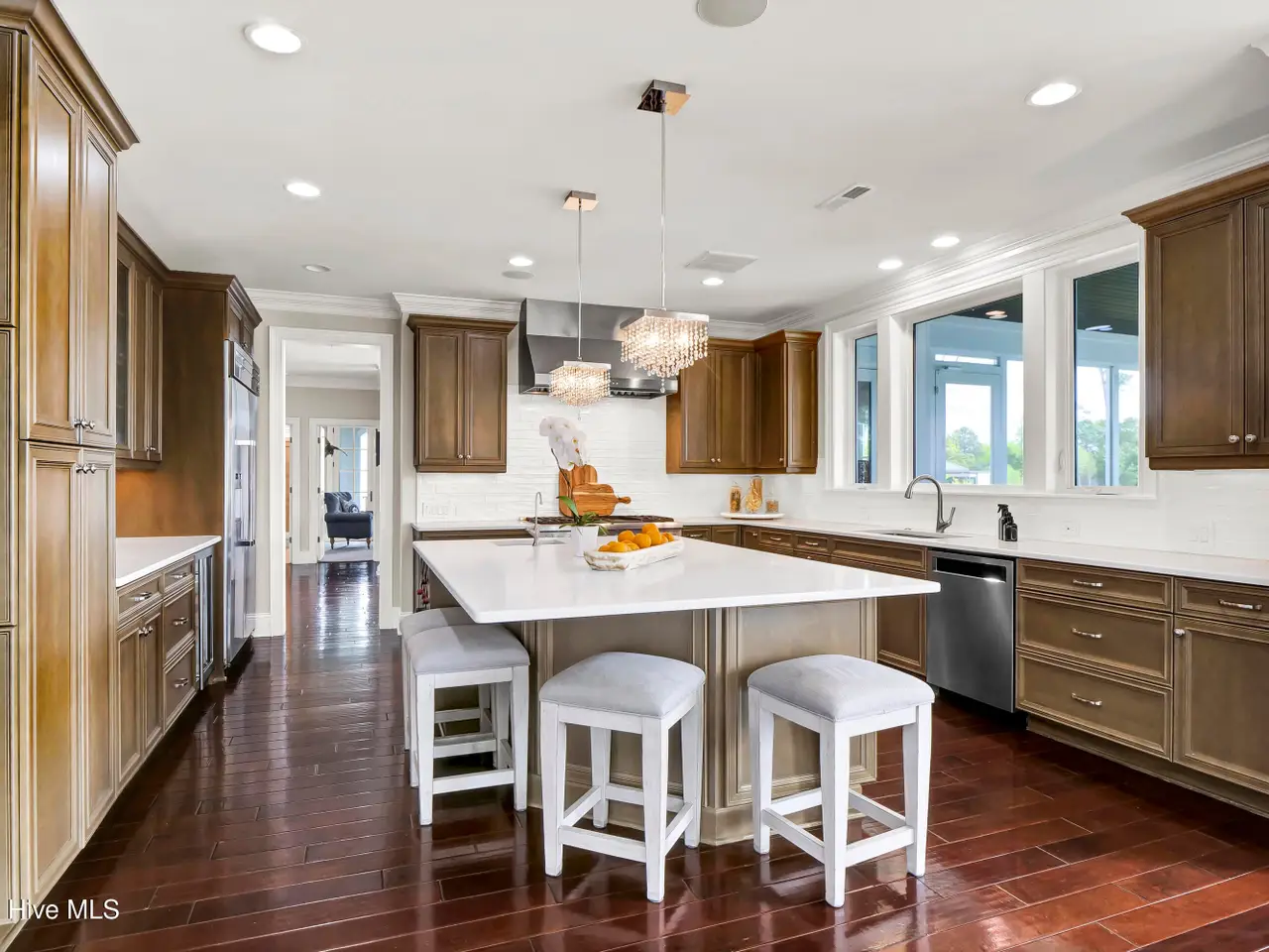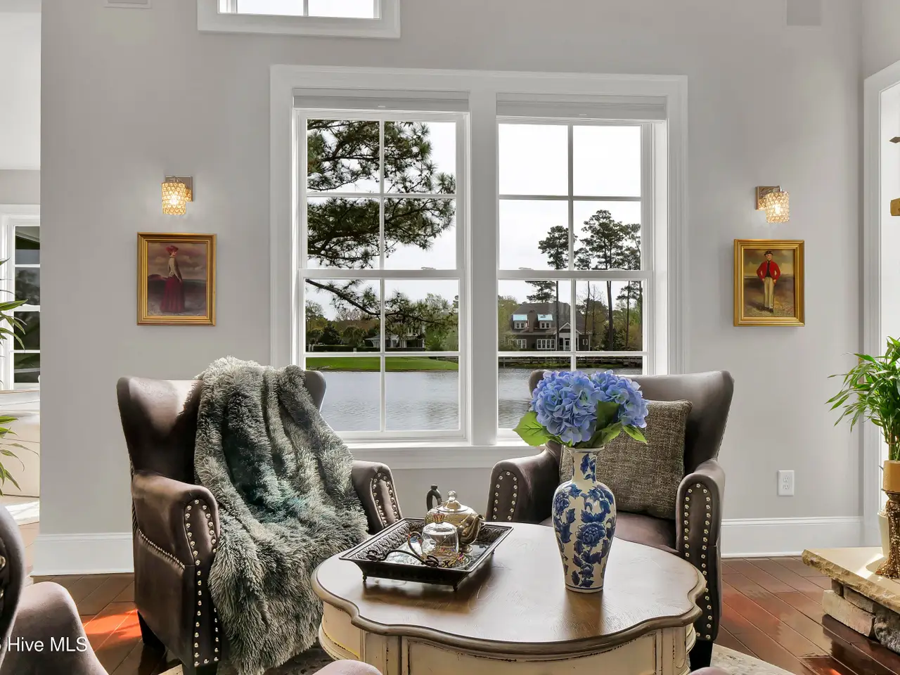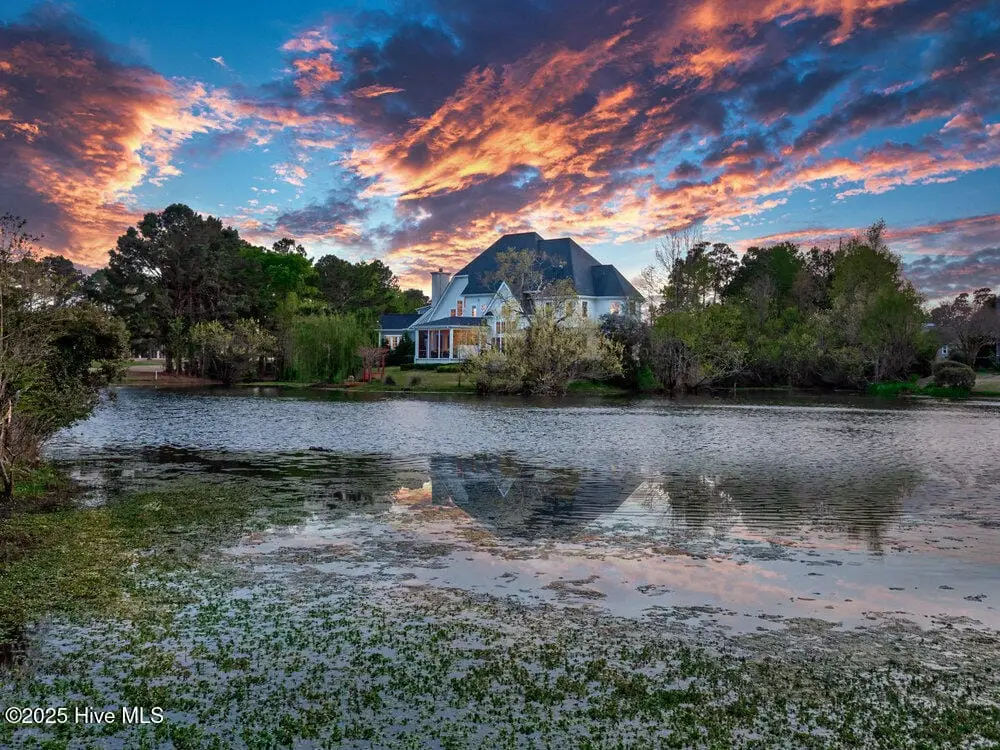 Situated on a quiet, private cul-de-sac in a peaceful peninsula-like setting is where you'll find this lovely lakefront Landfall sanctuary with Marsh #8 golf course views. Let your cares slip away as you gaze at swans gliding across the water, turtles basking in the sun or a variety of birds dancing in the breeze. The interior is equally as serene, as a Koi pond with fountain greets you in the foyer along with wood floors & soft, soothing colors that carry throughout formal and informal areas of this stunning residence. You'll love hosting memorable gatherings with family & friends in your gorgeous gourmet Kitchen complete with beautiful new quartz countertop, a Thermador professional series 6 burner natural gas range & 2 ovens, Thermador refrigerator, new dishwasher new microwave, beverage refrigerator, even reverse osmosis, a prep sink & roll out shelves. The generous Kitchen opens to formal & informal living & dining spaces with a stacked stone natural gas or woodburning fireplace. You'll find 2 offices/bedrooms with adjoining balcony and full bath on the first level; upstairs enjoy 4 bedrooms including the oversized Primary Suite with vaulted ceilings, a reading/exercise/meditation area, spacious walk-in closet, sizable jetted tub AND separate jetted shower. Heaven inside & out. Instantly fall in love with the incredible outdoor space - whether entertaining on your lanai, telling tales around the firepit, or simply sitting under the arbor near the water feeling the sunshine. Other special features of this amazing home include 107 windows including floor to ceiling in the Great Room offering abundant natural light, repainted interior, 2 on-demand hot water systems, whole house water filtration system, irrigation system on a well, efficient geothermal heating & cooling for very low energy bills, Laundry Room with sink & cabinets, wired for sound, oversized 2 car garage and fenced backyard. Wow.