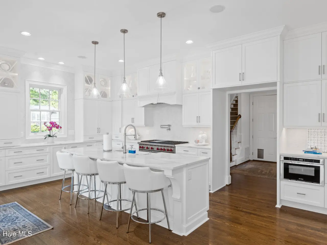 Welcome to 2220 Moreland Drive on the stunning Landfall Lake with breathtaking views. As you pull up to this stately home you will notice the great curb appeal, large driveway, and 3 car garage. As you step inside, your eyes will be drawn straight to the gorgeous view of the lake and even views of the Intracoastal waterway. The open foyer has a formal dining room to the right and a living room to the left complete with a gas fireplace. The family room is center in the house with a wet bar, gas fireplace, and leads to a lovely screened-in porch. The updated kitchen is light and bright with quartz countertops, ceiling-height cabinets, and a Wolfe range. There are two powder rooms downstairs plus a spacious laundry room. The master bedroom is also on the first floor positioned perfectly to wake up to heavenly views. Over the garage is a large bonus room that would be make a great fifth bedroom as it has a huge ensuite bathroom, the bonus room is currently being used as a home gym. There are 3 additional bedrooms upstairs plus a loft/flex space which would make a great playroom, media room, or office. One of the best features of this property is the high elevation of this almost one acre lot complete with a pool, spa, patio, and built-in grilling area just off the kitchen. You can start or end your day with a walk around the idyllic Landfall Lake which is right in your backyard. Whether you want to relax or entertain, this house checks all the boxes.
