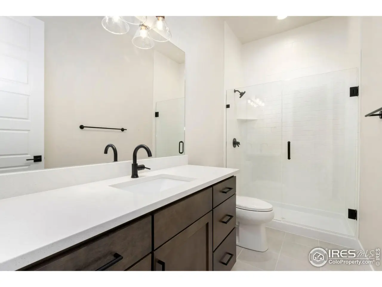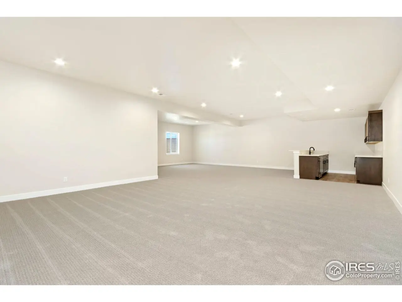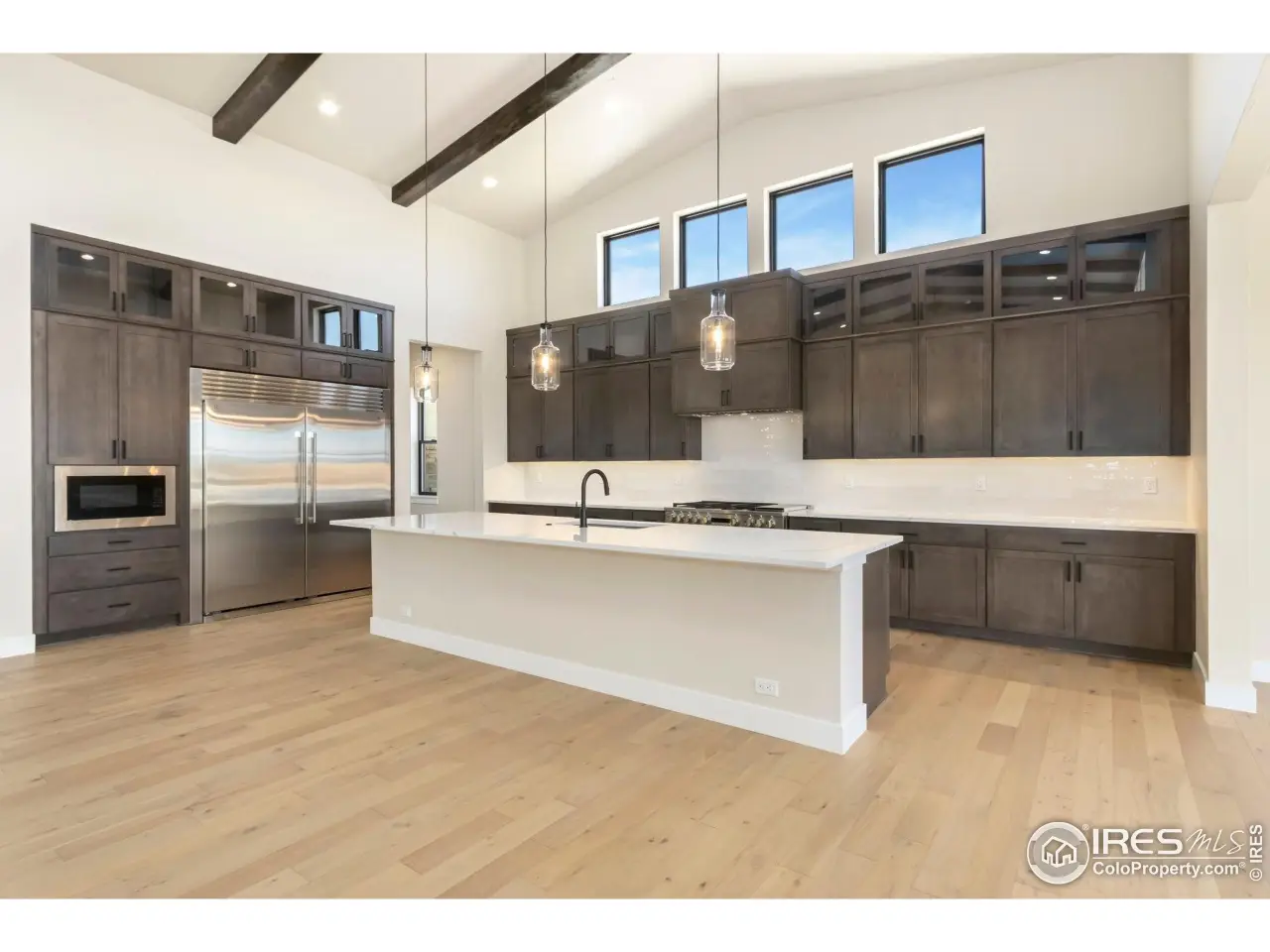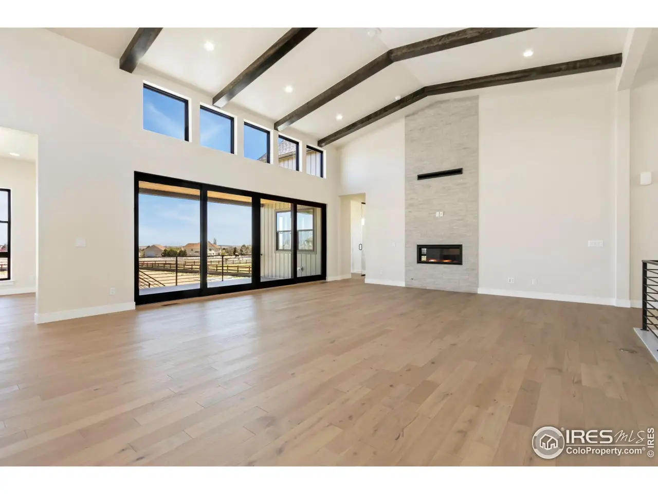 One of the last Alexandra's at Acadia in RainDance by Trumark Homes; a stunning, single-story home offering 4,710 finished sq.ft. with 4 bedrooms and 4.5 baths. Spacious great room with stained ceiling beams and contemporary fireplace with tile detail to the vaulted ceiling. The gourmet kitchen, featuring a walk-in pantry and an oversized center island, perfect for entertaining. The open kitchen includes dusk-stained shaker style with glass stacked cabinetry, Calacatta Classique quartz countertops with subway tile backsplash, Monogram/Electrolux stainless steel appliance package, and decorative matte black fixtures. A center-meet sliding glass door connects the light-filled dining room and great room to the covered outdoor east facing deck which features cedar tongue & groove ceiling detail. A dedicated office with a glass wall and door overlooks the covered deck. The primary suite features ample windows, a luxurious bathroom, walk-in shower, and an elegant freestanding tub. An oversized walk-in closet completes the primary suite. On the other side of the home, you'll find a large laundry, flex room, and two secondary bedrooms, both with ensuite bathrooms. Finished basement includes a rec room with wet bar, a fourth bedroom and full bath. The home comes with extensive 5" plank natural stained engineered wood flooring throughout the majority of the main floor, black interior windows, hand trowel drywall finish, luxurious carpet in bedrooms, spacious 10-foot ceilings throughout the main level and basement, eight-foot interior doors, 3-car side-load garage with insulated steel doors, tankless water heater, AC, and more. Beautiful 1-acre home site close to neighborhood park & RainDance National Golf Club. Optional Raindance pool amenity. Don't miss your chance to live at this remarkable master-planned community in Windsor, CO!