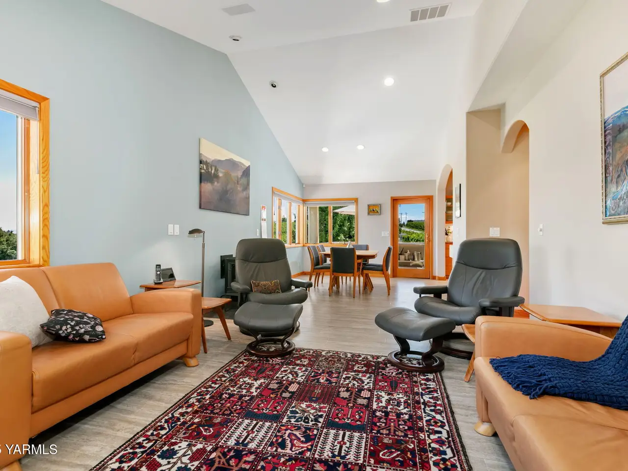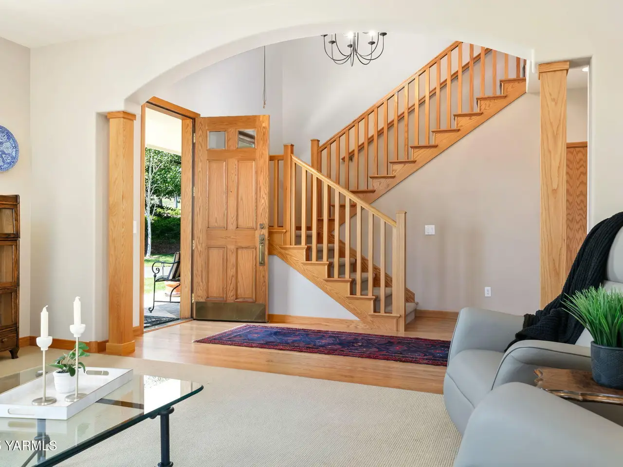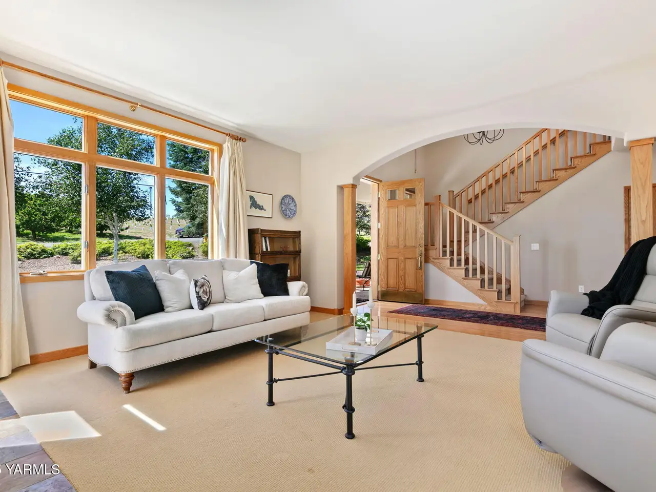 This architecturally designed one owner, custom built home crafted by Jim Sevigny and Artisan Construction, is tucked in on a private lane and set on an acre of rural scenic heaven with close and distant views from Scenic Ridge yet minutes to city life and services. It can best be described as an estate setting! You arrive on a gently curving, tree shaded driveway to the front door. Stepping inside you will be impressed by gleaming hardwood floors, graceful arches and a grand staircase that leads to the primary ensuite, 2 additional bedrooms and a conveniently located laundry room. The living room is defined by high ceilings, light-filled windows and a gas fireplace framed by a pair of window paned doors that allow direct access to entertaining and relaxing on the patio and pool area. Follow the main hallway past what is currently a very spacious two-person office/study that provides an option to repurpose for your own use and enjoyment if desired. Nearby is an ensuite bedroom designed with curb-less shower and wall hung sink which can be used by all family members and guests. The dining area is generous and can accommodate many diners comfortably. The heart of this home is the spacious gathering room with high ceilings warmed by a gas fire stove in the informal eating area and a chef's kitchen with high end counter tops and cabinetry, newer appliances including an induction range, pantry cabinet and direct access to the patio and deck. Meal prep is enhanced by soothing views of orchards and hills beyond. Step outside onto the patio for relaxation and entertaining which is enhanced by the retractable awning, wood burning fireplace, availability of natural gas for barbecues and hot tub overlooking the sparkling inground swimming pool with powered retractable cover and adjoining cabana all overlooking, in cool comfort, the sweeping views of manicured lawn and flower gardens.