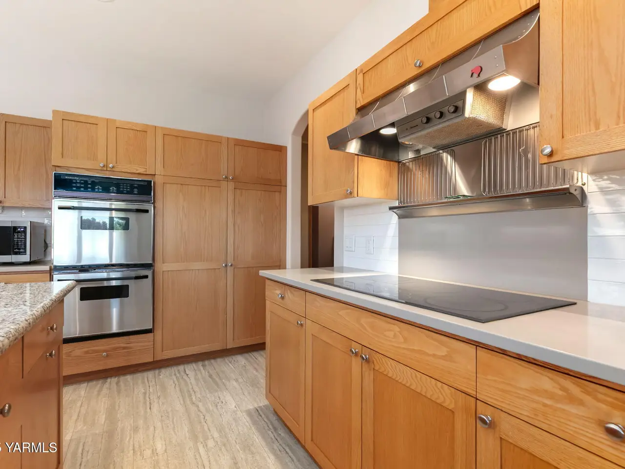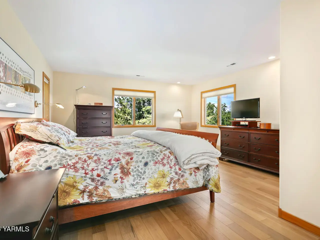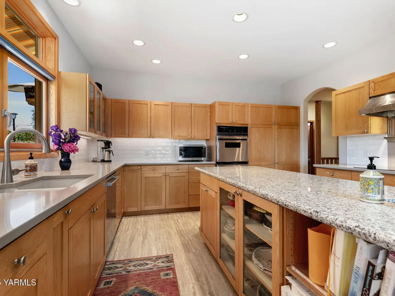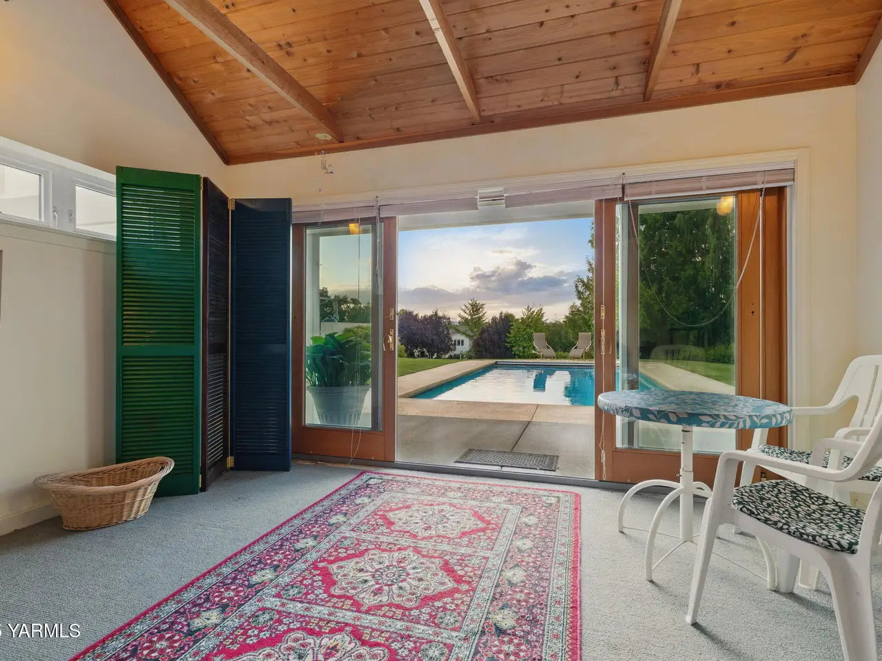 This architecturally designed one owner, custom built home crafted by Jim Sevigny and Artisan Construction, is tucked in on a private lane and set on an acre of rural scenic heaven with close and distant views from Scenic Ridge yet minutes to city life and services. It can best be described as an estate setting! You arrive on a gently curving, tree shaded driveway to the front door. Stepping inside you will be impressed by gleaming hardwood floors, graceful arches and a grand staircase that leads to the primary ensuite, 2 additional bedrooms and a conveniently located laundry room. The living room is defined by high ceilings, light-filled windows and a gas fireplace framed by a pair of window paned doors that allow direct access to entertaining and relaxing on the patio and pool area. Follow the main hallway past what is currently a very spacious two-person office/study that provides an option to repurpose for your own use and enjoyment if desired. Nearby is an ensuite bedroom designed with curb-less shower and wall hung sink which can be used by all family members and guests. The dining area is generous and can accommodate many diners comfortably. The heart of this home is the spacious gathering room with high ceilings warmed by a gas fire stove in the informal eating area and a chef's kitchen with high end counter tops and cabinetry, newer appliances including an induction range, pantry cabinet and direct access to the patio and deck. Meal prep is enhanced by soothing views of orchards and hills beyond. Step outside onto the patio for relaxation and entertaining which is enhanced by the retractable awning, wood burning fireplace, availability of natural gas for barbecues and hot tub overlooking the sparkling inground swimming pool with powered retractable cover and adjoining cabana all overlooking, in cool comfort, the sweeping views of manicured lawn and flower gardens.
