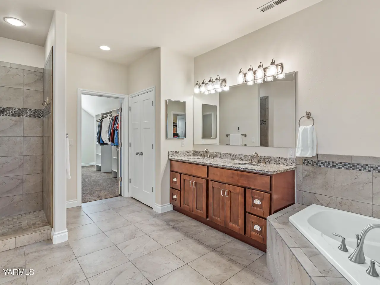 Heated tile floors and jacuzzi tub in primary suite