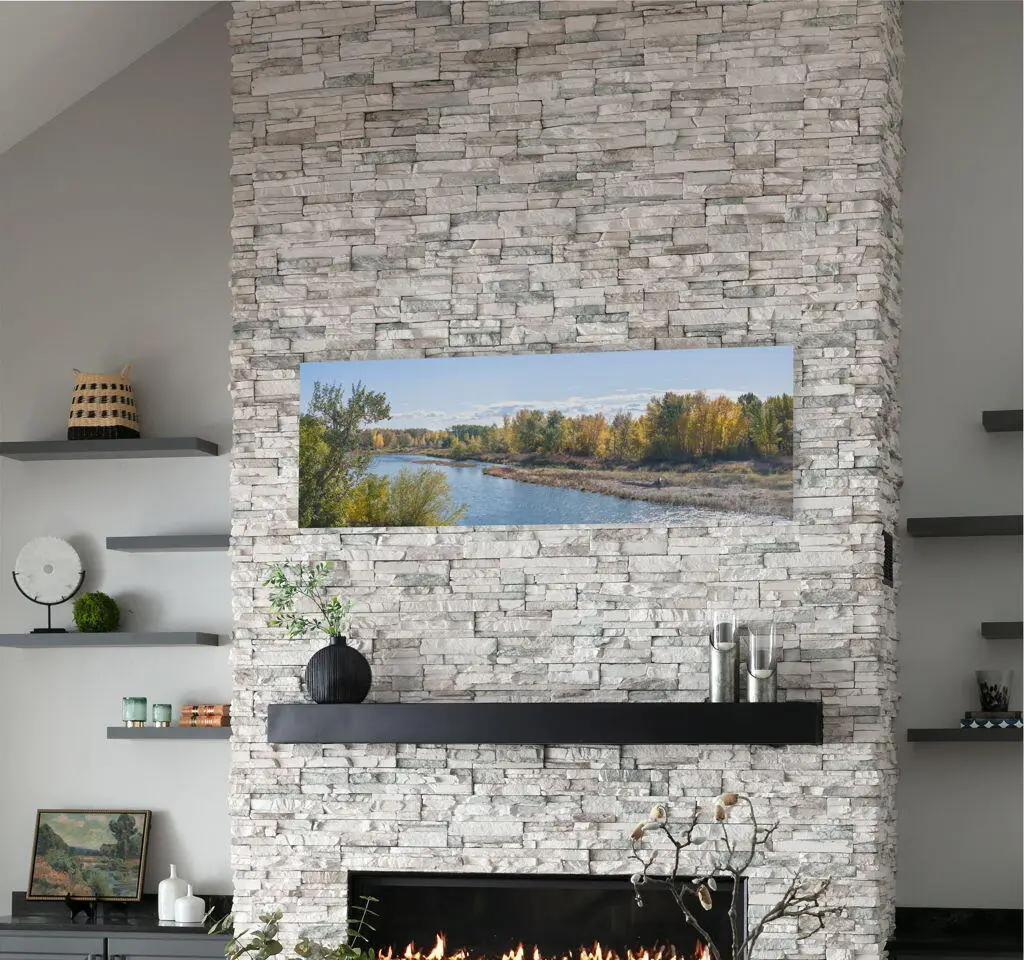 Vaulted foyer with stunning floor-to-ceiling gas fireplace