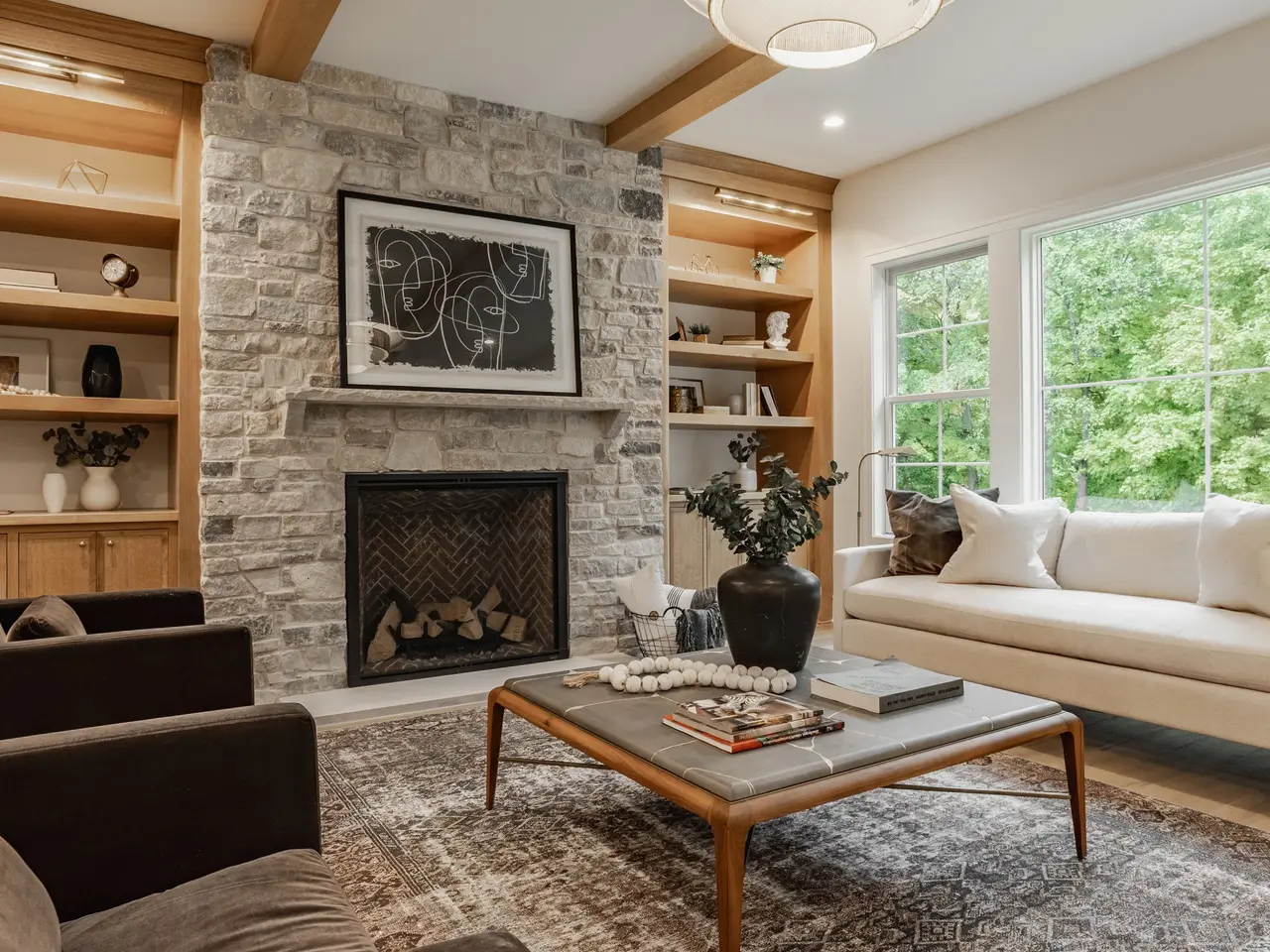 Meticulous design and quality craftsmanship define this new residence by Ett Hem Properties. Situated on one of the neighborhood's most desirable lots, every detail has been carefully considered, from the warmth of custom, white oak finishes and hardwood floors to built-ins, designer lighting, and hand-selected tile. Ten-foot ceilings and expansive windows fill the open plan with natural light, balancing architectural sophistication with everyday comfort. The gourmet kitchen showcases custom cabinetry, Taj Mahal stone, premium appliances, and an oversized island-perfect for entertaining or daily family life. The main-level primary suite offers a serene retreat with a fireplace framed in soapstone, a spa-inspired bath with walk-in shower, separate soaking tub, dual vanities and a custom walk-in closet, while a secondary main-floor bedroom provides flexible space for guests or a home office. Upstairs, generously proportioned bedrooms, a versatile loft, and a spacious bonus room continue the theme of thoughtful design with hardwoods throughout and carefully chosen tile and stone. The finished lower level expands living and entertaining options with a wet bar, guest suite, and open areas ideal for a theater, game room, or fitness space. Modern systems-including multi-zone HVAC, on-demand water, and two conveniently located laundry rooms-ensure comfort and practicality year-round. Outdoors, a covered porch and private backyard framed by mature trees provide a quiet retreat. With six bedrooms, 5 full baths, and a location just minutes from Zionsville's shops and restaurants, this home combines thoughtful design, quality finishes, and timeless appeal. Welcome home!