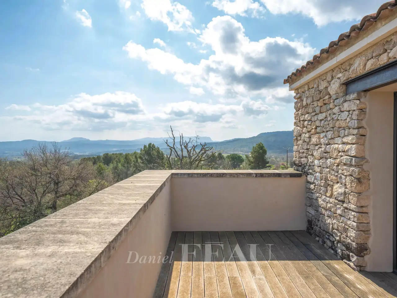 Sole Agent. This superb property is located 15 minutes from Aix en Provence in an elevated setting commanding breathtaking views of the iconic Saint Victoire Mountain and the Luberon countryside. Offering 470 sqm of living space, it is set In 6 hectares of peaceful grounds (two hectares of which are enclosed and feature a 15 x 5 metre overflow swimming pool). Allying stone, steel and extensive glazing, the beautifully appointed and tastefully decorated main house includes a spacious entrance hall, a living/reception room and dining room and open-plan kitchen with wide patio windows opening onto 250 sqm timber-decked terraces, a study, and a suite with a bathroom and dressing room. Upstairs are a study/library area, and two suites including a 70 sqm master with a terrace overlooking the surrounding countryside. The garden level comprises a sitting room with a bar, two bedrooms including a suite, technical premises, a home cinema, a sauna, and a heated 10 x 4 metre swimming pool. There is also a further independent bedroom. With a car port for five vehicles. Water is provided by the Canal de Provence. Unique.