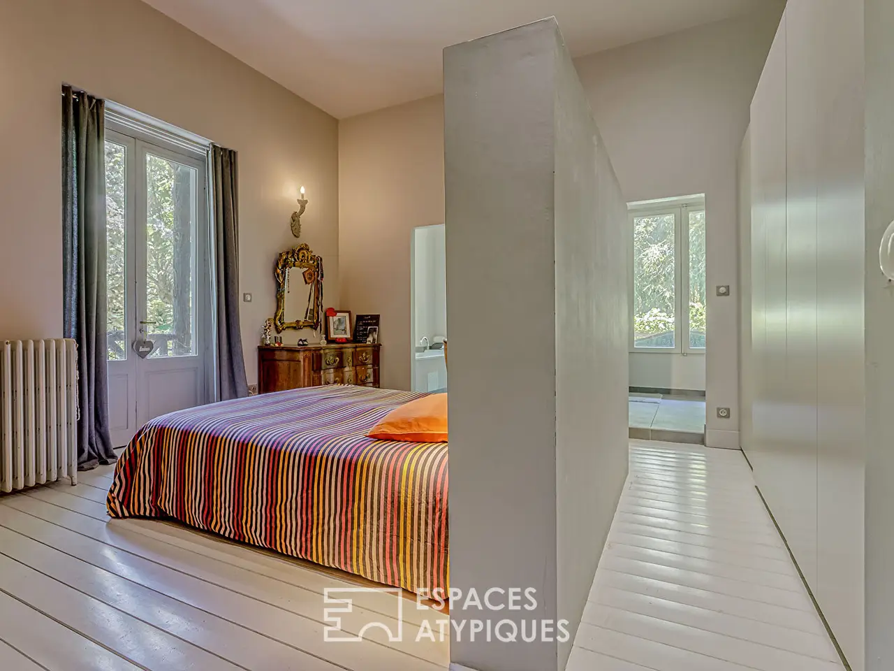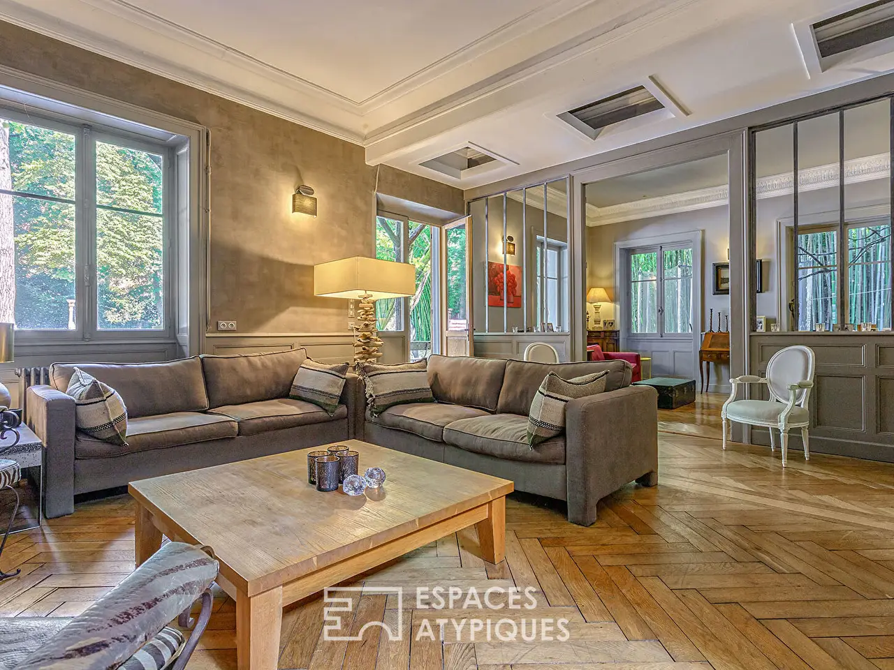 Nestled in the heart of a landscaped park of 2,100 sqm, this historic 238 sqm residence stands as a rare address in the very center of Aix-les-Bains.Sheltered by century-old trees, it combines the charm of preserved heritage with the comfort of a prestigious villa. An elegant swimming pool extends the serene atmosphere of this private estate.Inside, generous volumes and a harmonious layout are revealed. From the entrance, the double living room with herringbone parquet flooring and period moldings expresses the full authenticity of the property. The adjoining dining room, ideal for entertaining, echoes the contemporary kitchen set within a glass extension offering panoramic views over the garden.Upstairs, two bedrooms are arranged, including a master suite with its bathroom, a shower room, and a gallery-style balcony overlooking the park and pool. The converted attic space, with its exposed beams, hosts two additional bedrooms with unique character.Outdoors, the landscaped garden creates an intimate setting where lush greenery, terraces, and relaxation areas blend seamlessly. The long, refined swimming pool becomes the centerpiece of this haven of greenery. An independent caretaker's house enhances the potential of the property, further complemented by a covered garage and spacious cellars.Its privileged location, just steps away from shops, schools, cultural facilities, and the lake, makes it truly unique. This historic residence, rare on the Aix-les-Bains real estate market, will appeal to lovers of character and authenticity.Energy class: D / Climate class: DEstimated annual energy costs (standard use, 2023 prices): between €2,890 and €3,970.REF. 2027EAAdditional information* 15 rooms* 4 bedrooms* 2 bathrooms* 1 bathroom* 2 floors in the building* Outdoor space : 2100 SQM* Parking : 3 parking spaces* Property tax : 2 649 €Energy Performance CertificatePrimary energy consumptiond : 197 kWh/m2.yearHigh performance housing*A*B*C*197kWh/m2.year42*kg CO2/m2.yearD*E*F*GExtremely poor housing performance* Of which greenhouse gas emissionsd : 42 kg CO2/m2.yearLow CO2 emissions*A*B*C*42kg CO2/m2.yearD*E*F*GVery high CO2 emissionsEstimated average amount of annual energy expenditure for standard use, established from energy prices for the year 2021 : between 2890 € and 3970 €Agency feesThe fees include VAT and are payable by the vendorMediatorMediation Franchise-Consommateurswww.mediation-franchise.com29 Boulevard de Courcelles 75008 ParisInformation on the risks to which this property is exposed is available on the Geohazards website : www.georisques.gouv.fr