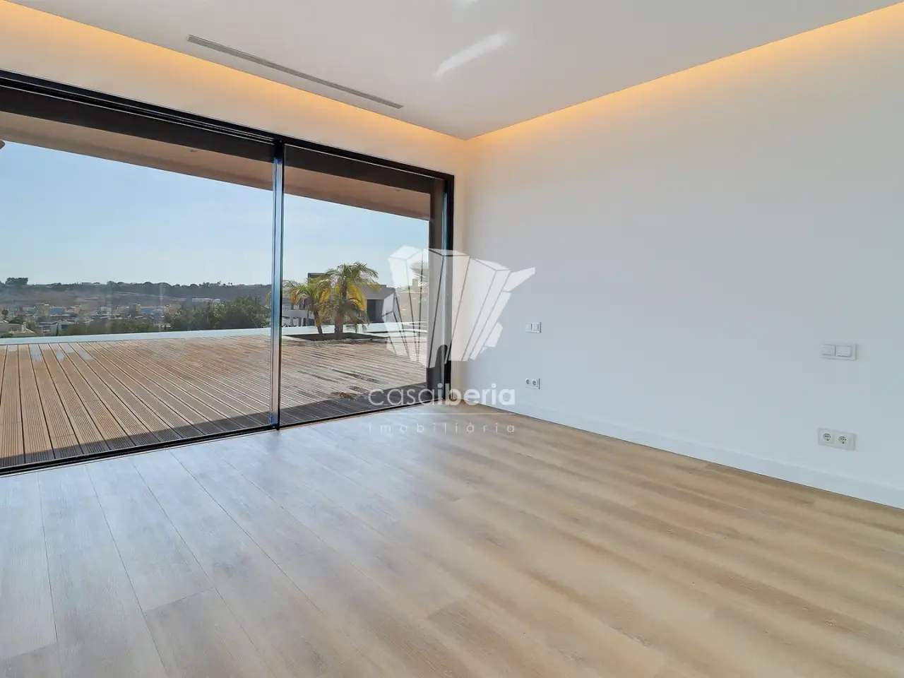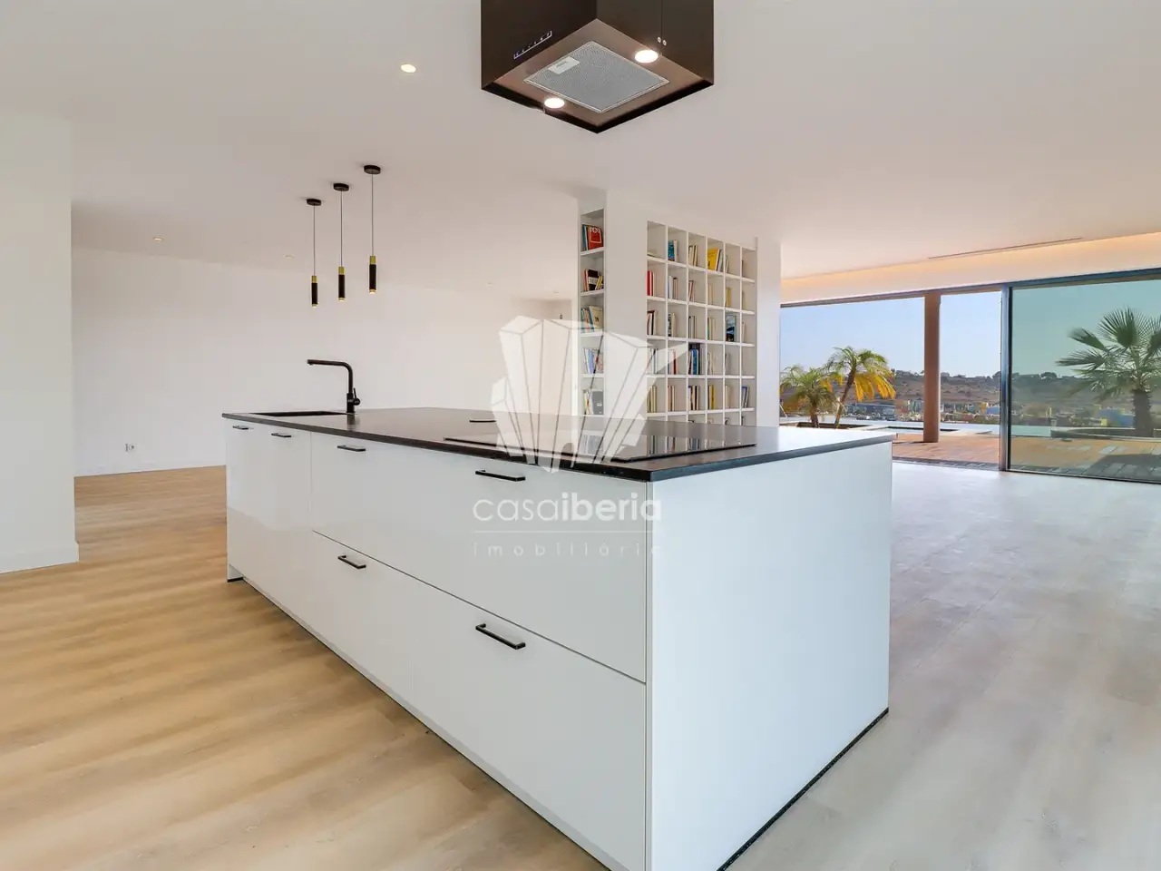 It has an imposing entrance to the social area, with a living and dining room and kitchen equipped with an open-plan island, very spacious, with natural light thanks to the glass windows that extend from floor to ceiling, thus offering a panoramic view over the sea and the tropical garden, eliminating any barrier between the interior and the exterior. This perfect fusion between the spaces allows for a continuous experience, where the huge terrace, the pool and the jacuzzi become a natural extension of the interior area of the house.