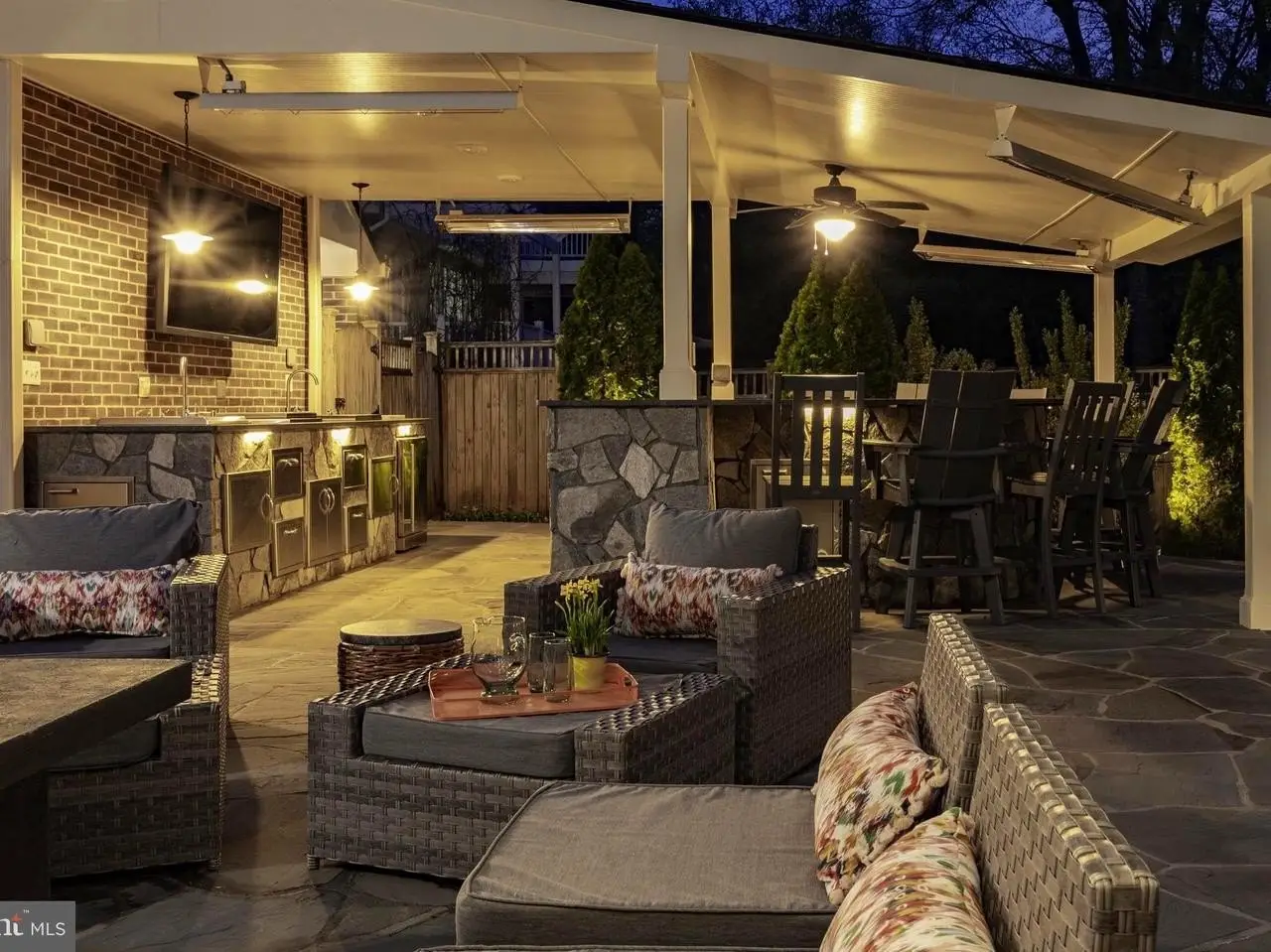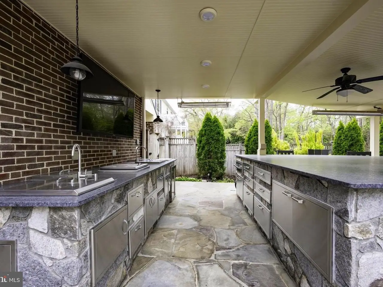 - Custom outdoor kitchen with granite counters and stainless steel appliances