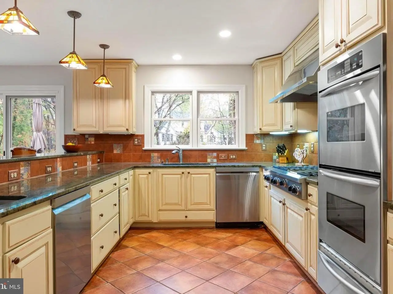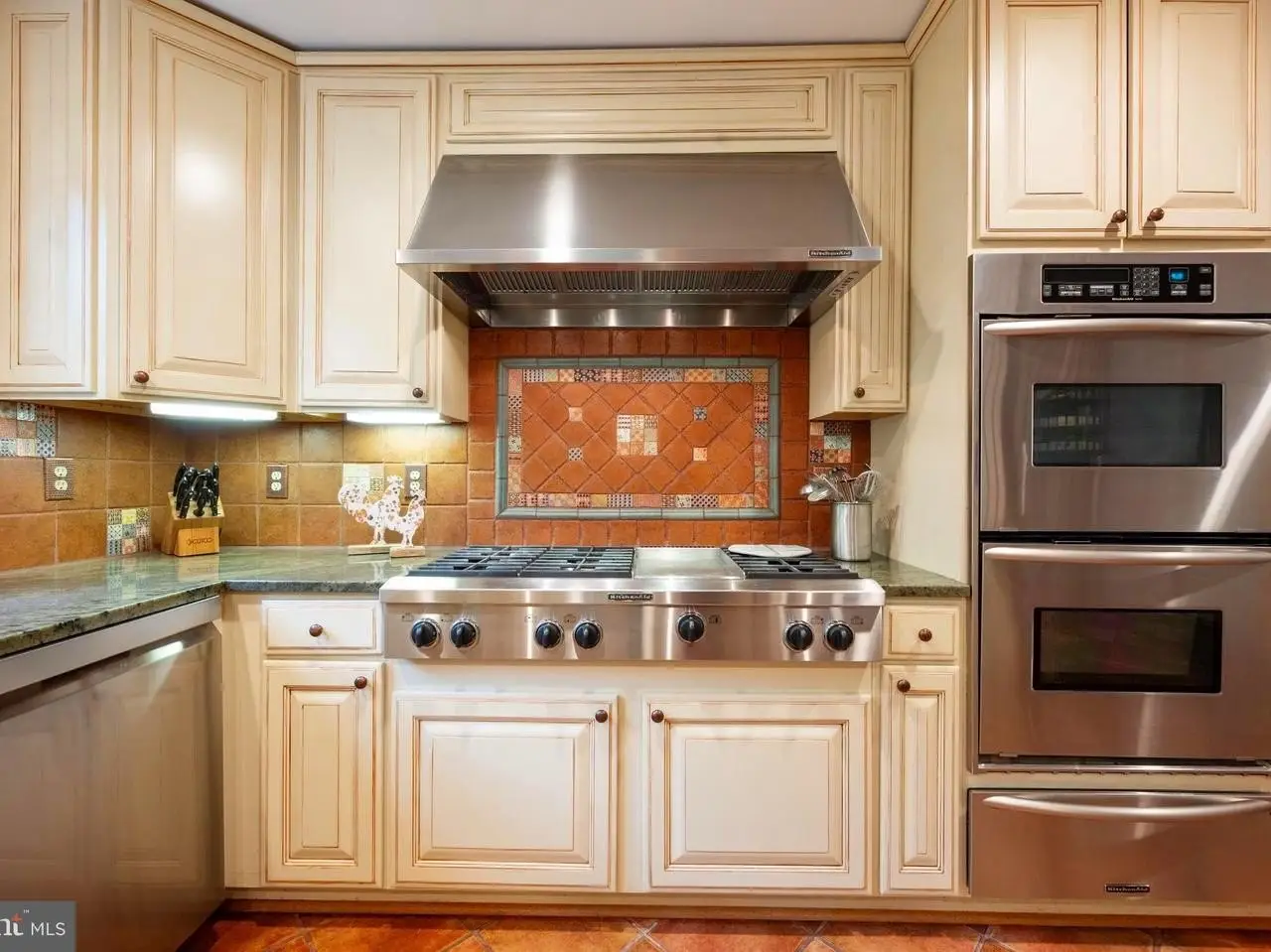- High-end kitchen with double ovens, warming drawer, and 6-burner gas range