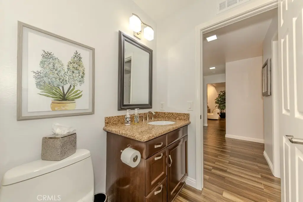 Single-story 3-bedroom 2-bath view home at 581 S Paseo Carmel in Anaheim Hills offers city lights and mountain vistas along with a spacious primary suite and a backyard retreat built for entertaining. The property begins with great curb appeal, wood siding with brick accents, and a landscaped approach. A covered entry functions as a front patio seating area and sets a welcoming tone. Inside, wood-look tile flooring runs throughout with no interior steps. The main living area opens under vaulted wood beam ceilings with abundant natural light, creating a bright and open feel that blends into the dining area. A hallway with a double-door storage closet leads toward the family room, where vaulted ceilings continue above a tall whitewashed brick fireplace wall. The family room flows into a kitchen nook finished with wainscoting and wood accents, positioned beside large windows for natural light. The kitchen is anchored by a peninsula counter and finished with granite countertops, a herringbone marble mosaic backsplash, recessed lighting, and a deep sink. A garden bay window offers extra display space. Appliances include a gas cooktop, oven, dishwasher, and trash compactor. Pull-out drawers add convenience, and the adjacent dining space accommodates a full table. The primary suite features double door entry, vaulted ceilings with a ceiling fan, dual mirrored wardrobes, and French doors with operable side windows. Its en suite bath offers dual granite vanities, a walk-in shower with seating bench, a private water closet, and large travertine tile finishes. The second bedroom, also with double-door entry, is used as an office with ceiling fan and mirrored closet, while the third bedroom includes the same. The guest bath is a full bath with granite vanity and large travertine tile shower surround. The laundry room is inside with overhead cabinetry. The attached two-car garage provides direct access, storage cabinets, and overhead racks. The backyard is designed as an entertainer's retreat, featuring a large Luminwood patio cover with recessed lighting and dual ceiling fans, paver hardscape, built-in barbecue with bar seating, a decorative glass gas fireplace, turf, and a putting green. Mature trees along the rear add privacy while framing the city lights and mountain views. Located minutes from shopping, dining, and parks with nearby access to freeways and award-winning schools, this property offers a single-level lifestyle with outdoor amenities and relaxing views