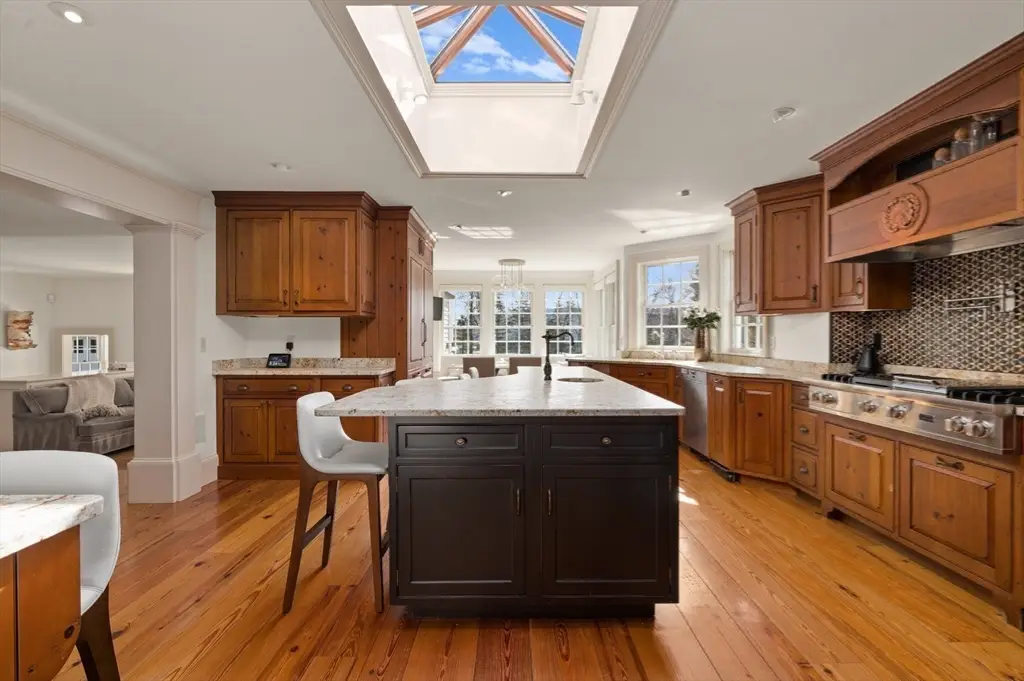 Nestled in desirable location and mere steps to Philips Academy, this stunning home exudes elegance. Custom kitchen, with upgraded appliances, center island, and unique copper skylight bathes the space in natural light. Elegant living/family room with gas fireplace, built-ins, and a wet bar, perfect for entertaining. Dining room, perfect for gathering, while dedicated office offers a quiet retreat for work or study. Fireplaced sitting room, convenient half bath, pantry, sun-drenched sunroom and mudroom enhance the functionality of the first floor. The second floor has four generously bedrooms, including primary suite that provides a private oasis. Additional two full baths service other bedrooms, ensuring comfort for all. Impressive new breezeway connects main house to a newly constructed four-stall garage with finished loft, featuring kitchenette, exercise room, full bath, laundry, ideal for guests or personal retreat. This timeless beauty with modern conveniences make it a rare find.