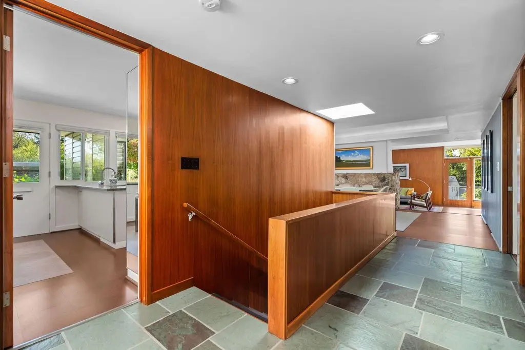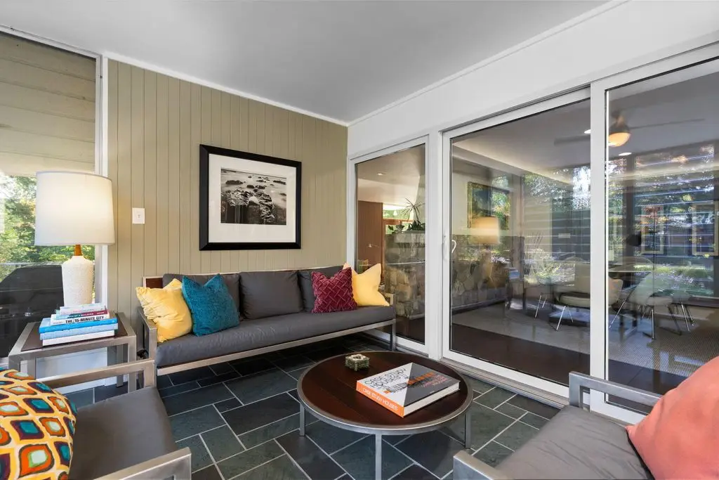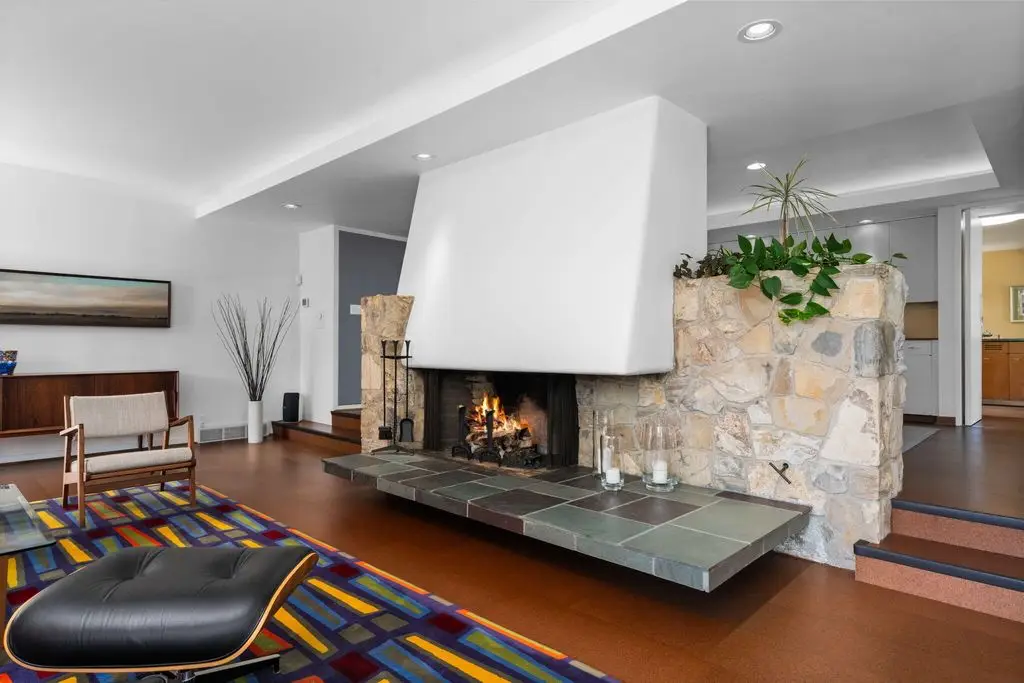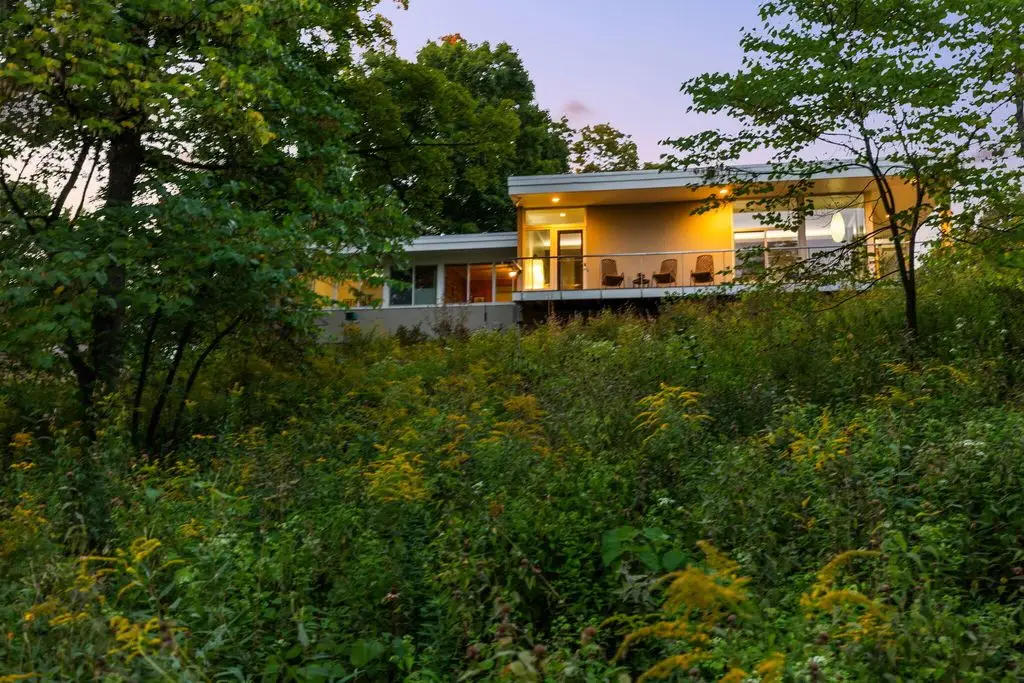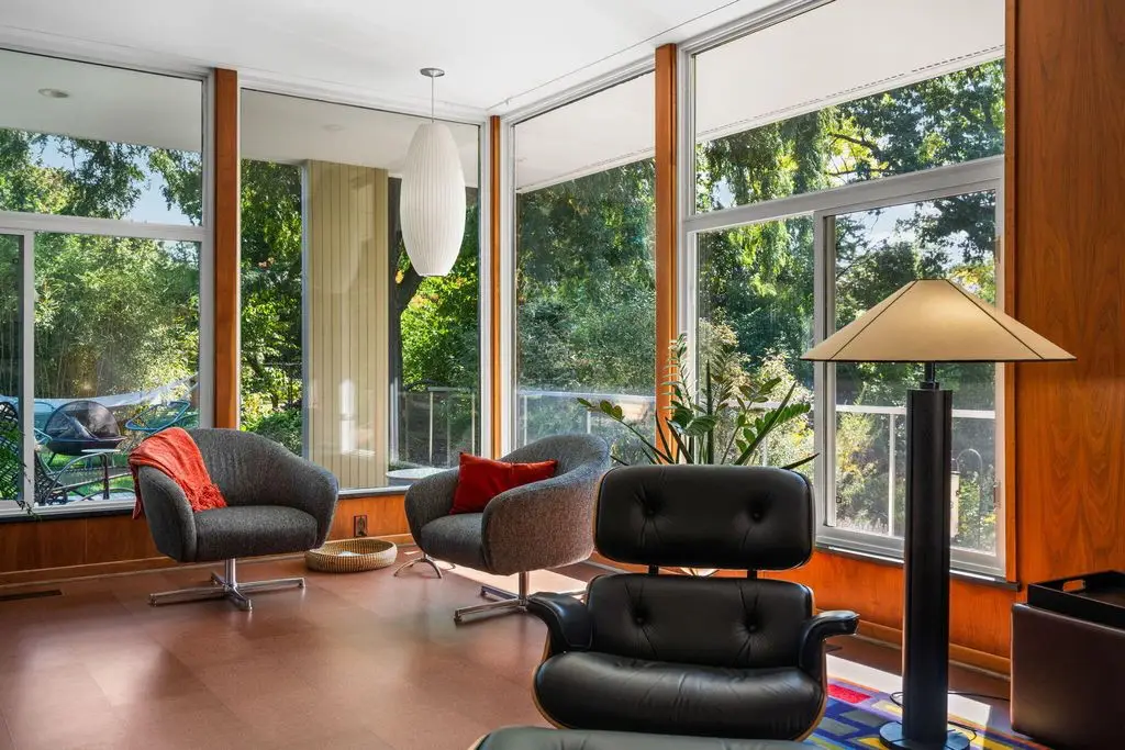 Designated by A2Modern as one of Ann Arbor's most notable Mid-Century Modern residences, this gracious home is a timeless example of the movement's enduring appeal. Its flat roof, cantilevered eaves, and private entry tucked into a breezeway embody the geometric simplicity and strong connection to nature that define the era. Expansive windows and skylights flood the interior with natural light, framing treetop and meadow views. A Florida room with jalousie windows and a full-width balcony create seamless transitions between indoors and out, while landscaped grounds enhance the home's natural hillside setting. In keeping with the owners' commitment to sustainability, the property features a small orchard of fruit trees, raised vegetable gardens and a pollinator garden. The exceptional property was featured in the Ann Arbor Garden Tour. Inside, organic materials including slate tile, cork flooring, and walnut paneling are paired with a dramatic stone wall that divides the living and dining rooms, featuring a built-in planter and cantilevered hearth. Cove lighting accents the tall ceilings, while horizontal flow brings warmth and intimacy to the open floor plan. The eat-in kitchen blends stainless steel finishes and high-end appliances with carefully preserved original cabinetry. On the main level, three bedrooms and two baths include a primary suite with treetop views and a renovated bath featuring a level-entry shower, while the third bedroom has been converted into a paneled study. The lower level offers a cozy sitting area, laundry and exercise space, and well-organized storage. One-level living is easily possible by relocating the laundry to the spacious primary closet.Thoughtful renovations have elevated this residence into a net-zero, all-electric retreat powered by a 15kW solar arraya rare union of architectural heritage and sustainable living. At once a faithful restoration and a forward-looking sanctuary, 505 Burson Place offers the elegance of mid-century design harmoniously reimagined for today's eco-conscious lifestyle.Tucked away on a private cul-de-sac in Ann Arbor Hills, this home provides unparalleled access to the best of Ann Arbor: stroll through Nichols Arboretum, picnic at Gallup Park, bike or jog to the U-M main campus, medical center, or new U-M fitness center. Designed by James Livingston in 1956, it remains one of the city's most admired Mid-Century Modern retreats.