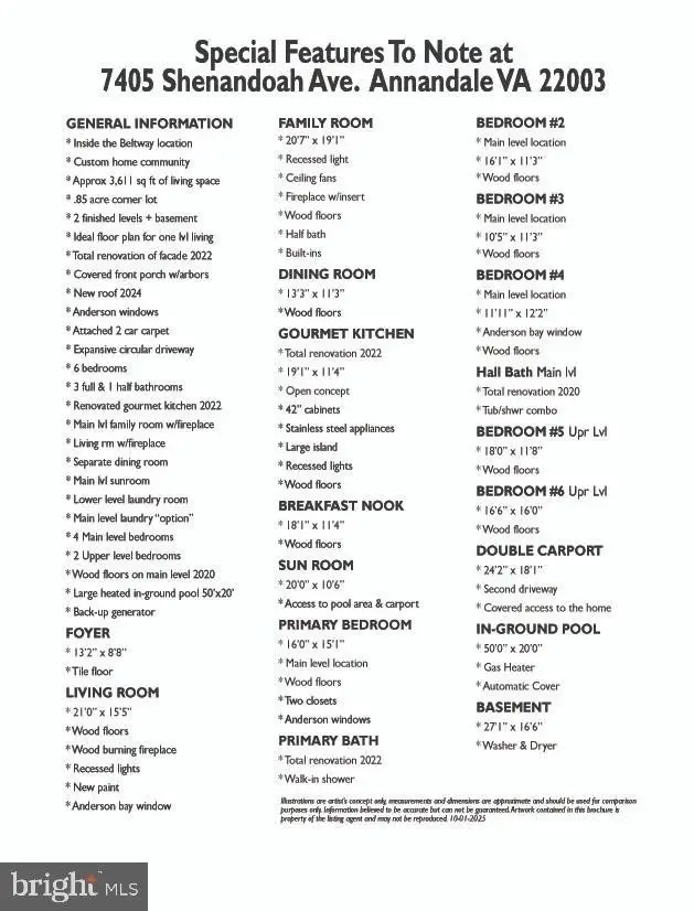Welcome to this beautifully updated 6-bedroom, 3.5-bath, 2.5-level rambler nestled on a secluded 0.85-acre lot in sought-after Brook Hills Estates, an enclave of custom homes on large lots. This custom home offers the rare option of "one-level living." The huge main level (with no steps) features four spacious bedrooms and 2.5 bathrooms, a large family room with a cozy fireplace, a formal living room with its own fireplace, and a separate dining room. The expansive kitchen-completely renovated in 2022-includes a sunny eat-in area and offers both style and functionality. The upper level offers two additional bedrooms, a renovated full bath, as well as generous closet and storage space. The lower level includes laundry, utility, and storage areas. Outside, enjoy a quiet street, a large circular driveway, a side-load double carport, the Sun Room leads to a massive 50' x 20' heated in-ground pool-perfect for entertaining. The charming facade and covered front porch was added in 2022 & features a metal roof an arbor and sitting areas, adding to the home's curb appeal. Recent updates include: *Kitchen renovation (2022) *All bathrooms renovated (2020) *New roof (2024). Conveniently located just inside the Beltway off Braddock Road, with easy access to I-495, I-395, and I-95. Only minutes from Tysons Corner, Fairfax Hospital, and the two new INOVA facilities. Please see photos, floor plans & survey/plat in photos and document sections!