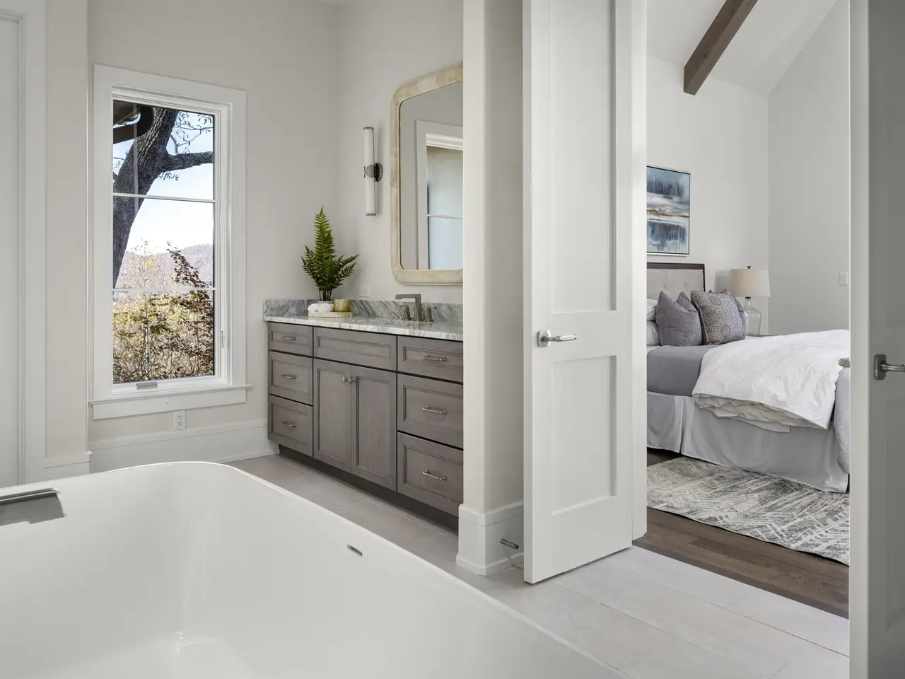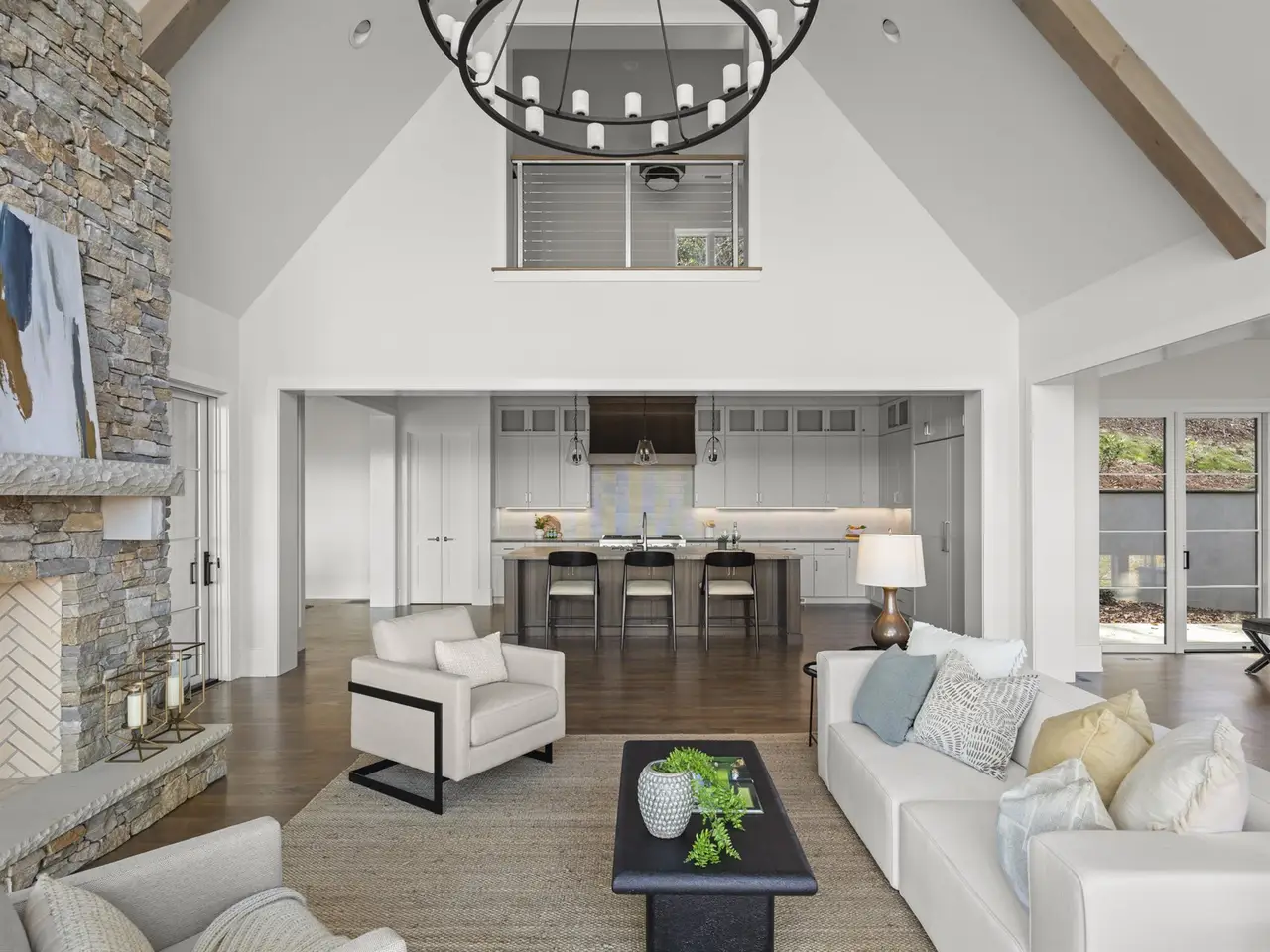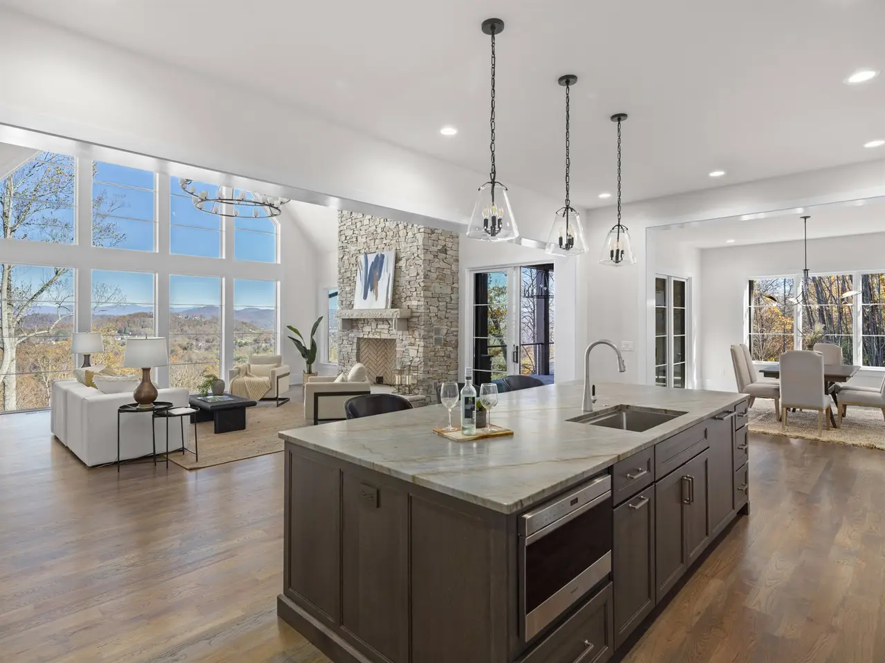 Perched on one of the highest ridges in Walnut Cove, this brand-new 2025 modern mountain masterpiece delivers the rarest commodity in Western North Carolina: unobstructed, 180-degree panoramic views that stretch from the glowing skyline of downtown Asheville all the way to the ancient spine of the Blue Ridge. On a clear day you can pick out the spire of the Jackson Building and the neon glow of the Battery Park Hotel at twilight. In fall, the entire valley ignites in crimson and gold, framing the city like a living postcard. In winter, the lights of Asheville shimmer below while snow dusts the distant peaks. This is not a view; it's a front-row seat to the seasons.Step inside and the drama continues. Soaring gable windows flood the open great room with natural light, framing the stone fireplace that rises like a sculptural monument. White-oak beams float overhead, and wide-plank European oak floors flow seamlessly to the expansive glass doors, merging the interior with the large covered veranda. A second outdoor fireplace and built in grill make this space usable for morning coffee with the sunrise over Pisgah or evening cocktails as the city lights flicker on below.The heart of the home is a chef's kitchen that belongs in a design magazine. Custom cabinetry climbs to the ceiling, complemented by a massive island with seating and additional storage. A full appliance suite, and a massive walk-in pantry make entertaining effortless.The primary suite is a private retreat on the main level, opening directly to a private terrace and those endless views. Two walk-in closets, and a spa bath with freestanding soaking tub and private laundry create a sanctuary you'll never want to leave.Upstairs, a generous guest suite and bonus room/office each claim their own wing, sharing a lofted space overlooking the great room. Descend the floating staircase (or take the elevator) to the lower level, where entertainment reaches new heights. A bonus room with wet bar can be a theater, game room, or gym. Two guest suites with en-suite baths, lots of storage, and a massive 3-car garage with additional storage and workshop area.Outside, native stone walls cascade down the hillside, blending the architecture into the mountain itself. The paver motor court and copper-accented entry echo the timeless craftsman details that make Walnut Cove homes so coveted.Located just minutes from downtown Asheville yet worlds away from the ordinary, 222 Secluded Hills Lane is more than a home?it's the ultimate expression of mountain modern living. Jack Nicklaus golf, wellness center, tavern, and 24-hour gated security all come with your Cliffs membership.Some homes have views. This one owns the horizon as the cable-rail decks never obstruct the view. Come see why the photos don't do it justice. The view has to be experienced in person.