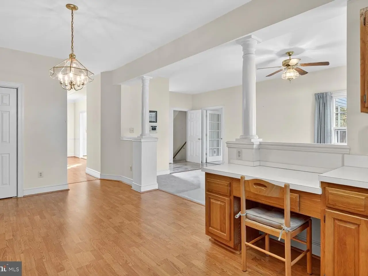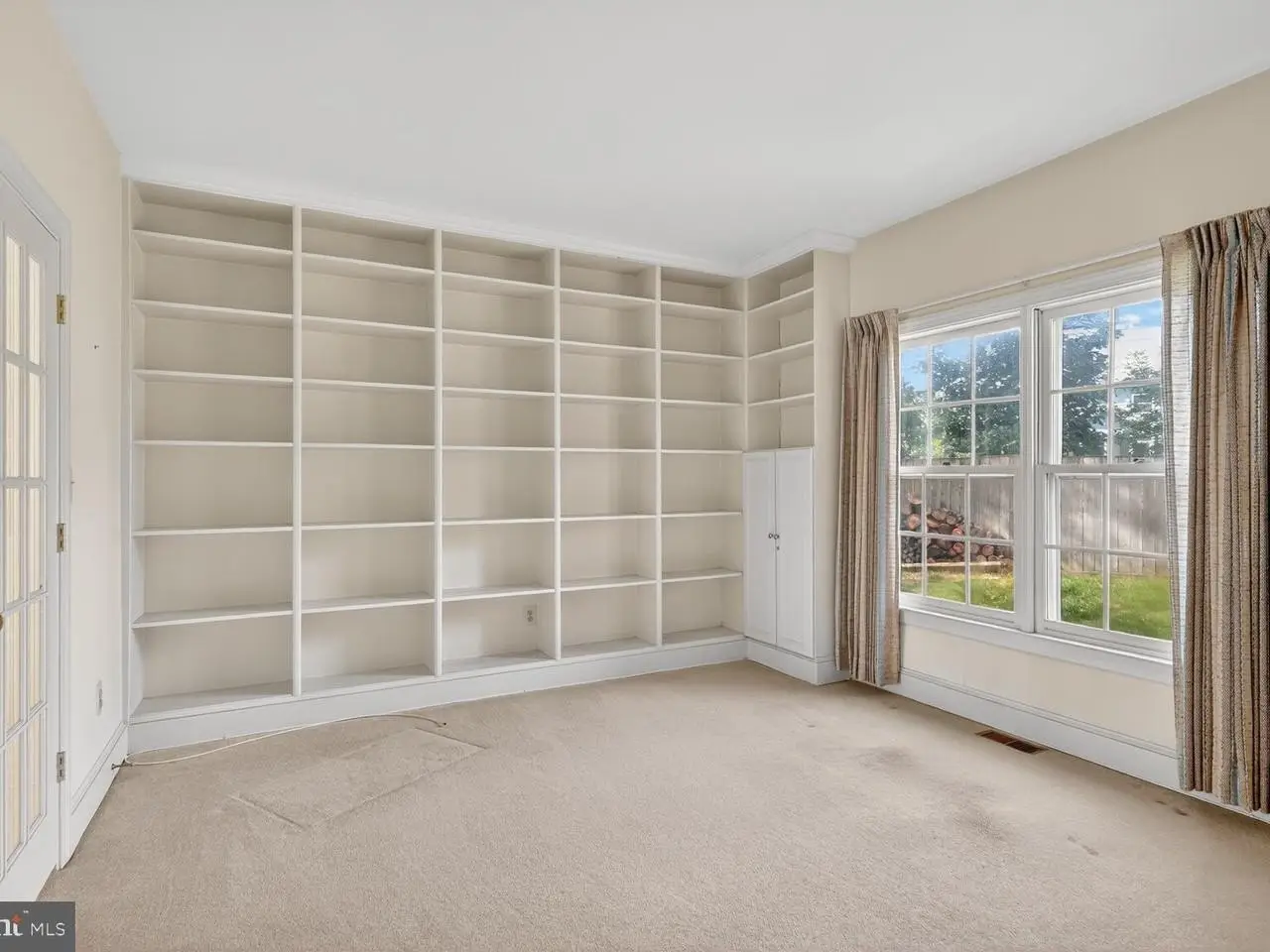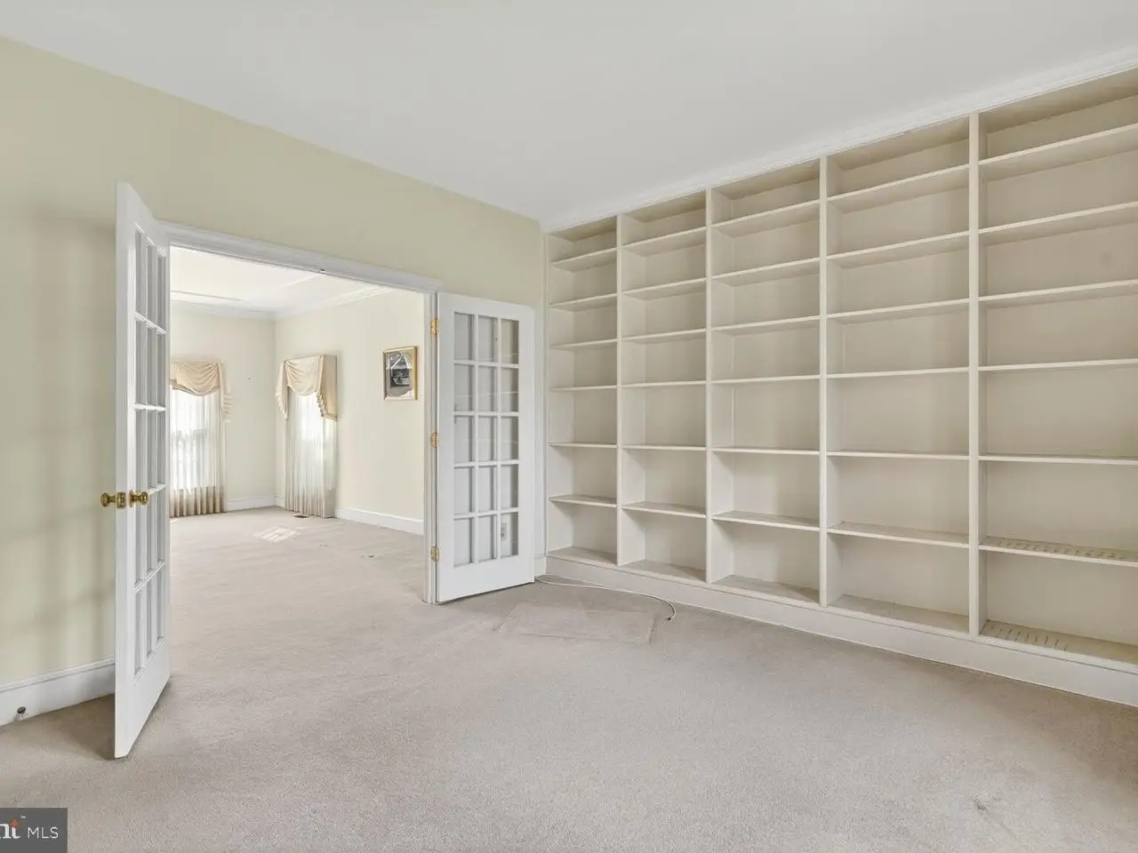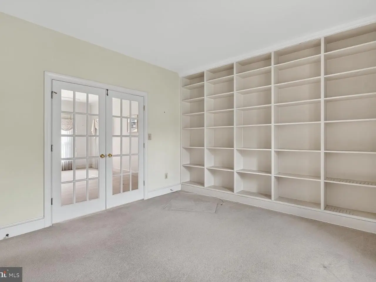 Stainless steel appliances French doors leading to office with built-in shelving