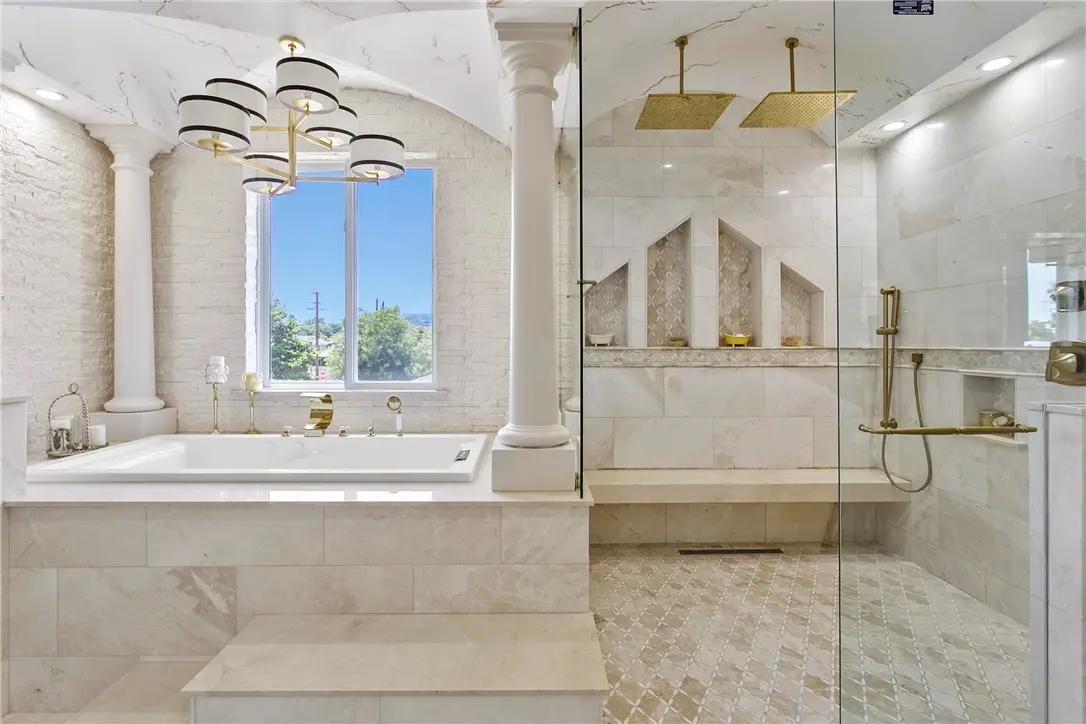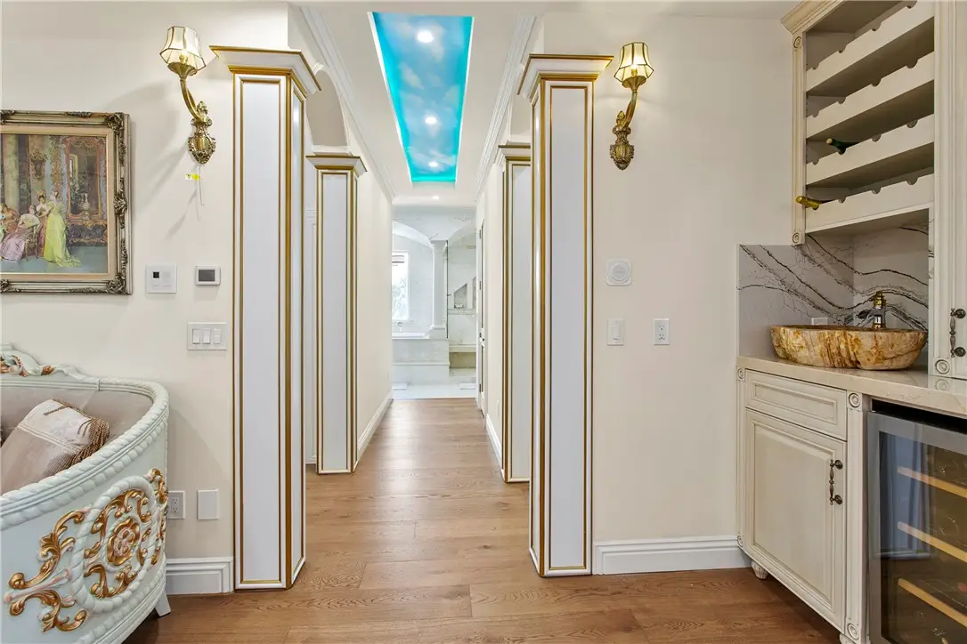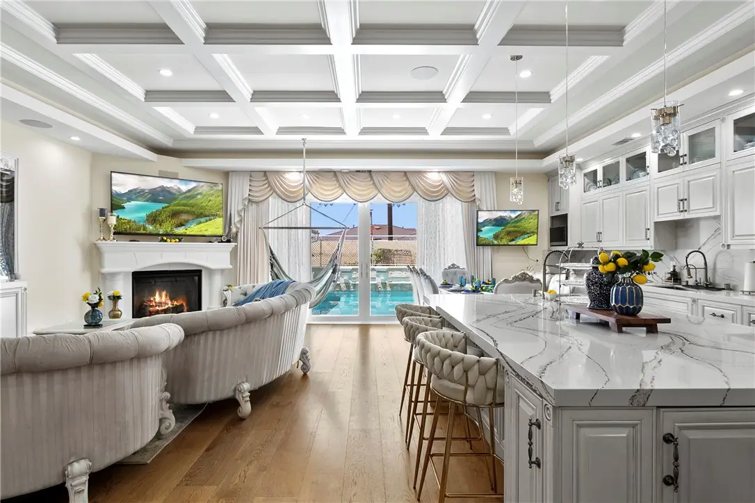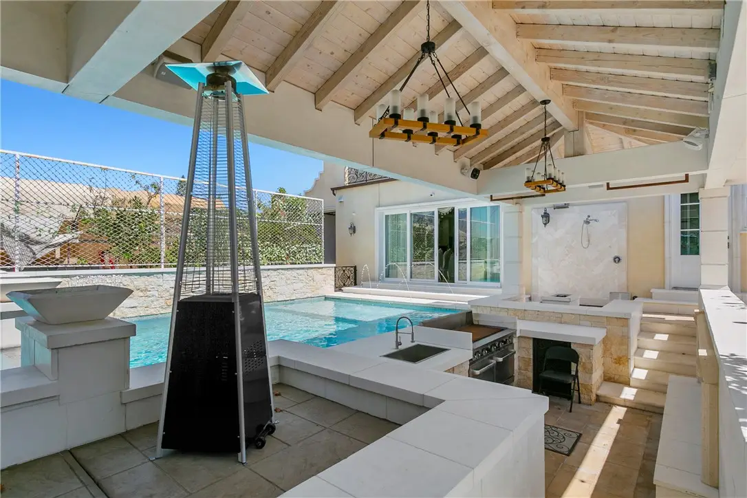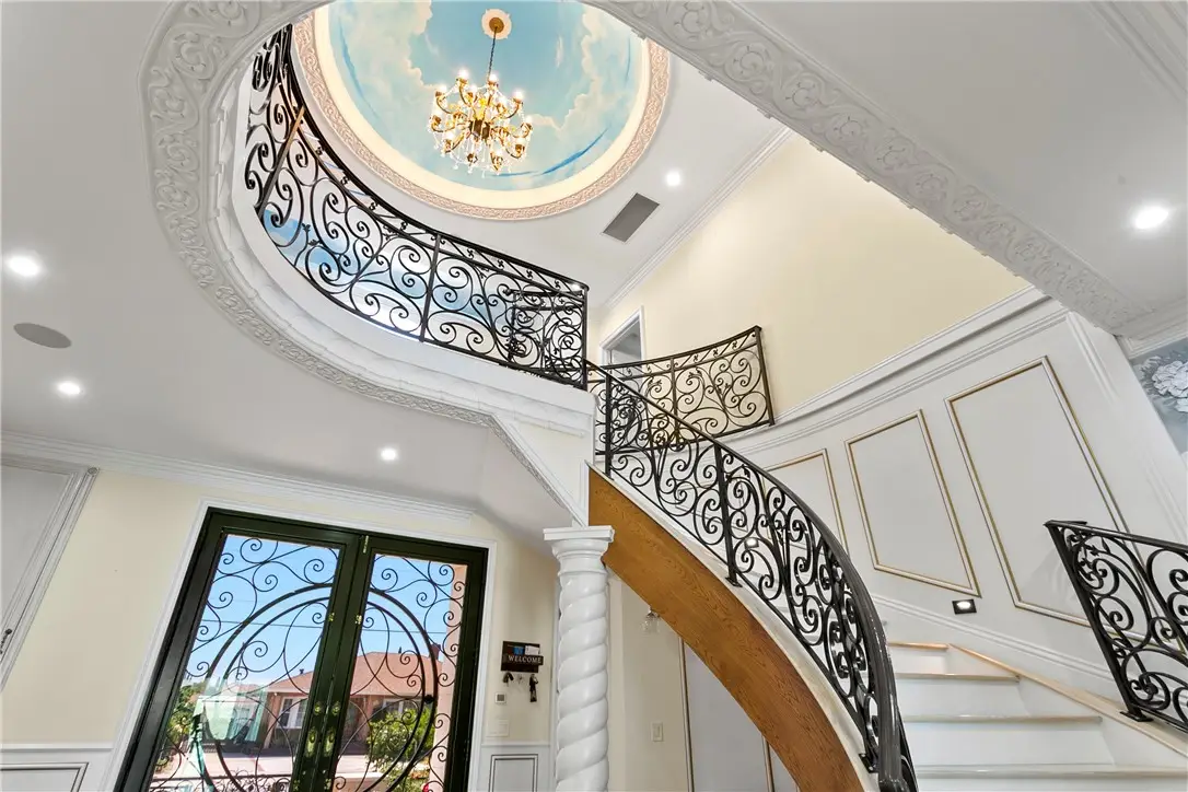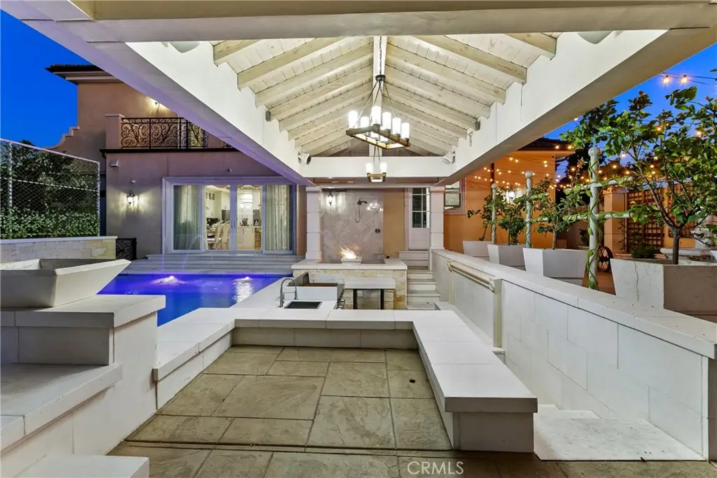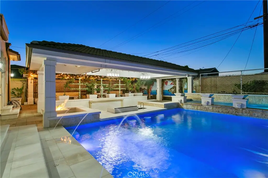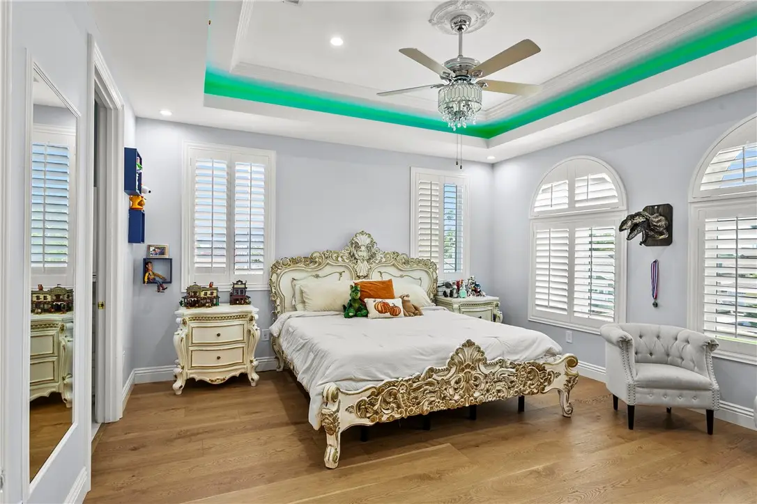 Stunning Mediterranean-Style Luxury Smart Home, Custom Built by Loving Father for Family. This extraordinary custom-built home blends top-tier craftsmanship with unparalleled comfort, style, and functionality, offering a fully integrated Smart Home experience and every amenity imaginable for modern luxury living. Every inch of this home was built with meticulous care and loving devotion. Inside, you'll find solid-core 8 ft tall wood doors, dual-pane fiberglass windows, high-end wood & stone flooring, coffered 10 ft tall ceilings, custom-built crown moldings, golden accents, and an intercom system throughout rooms. In Living Room built into wall is Custom See-Through Salt Water Fish Tank with Exotic fish! Upon entering is wonderful Art Wall depicting landscape and concrete branch design with molded flowers-- A Delightful Artistic Touch. All Bedrooms are Master Bedrooms, featuring en-suite baths, free standing tubs in showers, wet room, Crema Merfil bathroom counters, decorative soffits, walk-in closets, chandeliers, LED remote controlled ceiling lights, bluetooth speakers, and casement double-pane windows with shutter blinds. Upstairs Master Suite features two walk-in closets, gas fireplace, jacuzzi tub, balcony overlooking Oasis, and the Most Enchanting Custom-Design Ceiling Decor! Ceiling above Master Suite jacuzzi is beautiful Venetian Plaster with Golden Veins. Gorgeous Gourmet kitchen with expensive Quartz counters, high-end stove with pot filler and hood, beautiful built-in cabinets in Antique White, spice drawers, eating bar, and thick, durable glass sliding pocket doors overlooking the pool. Enjoy a lush salt-system pool and adjacent jacuuzzi all year long, with water-heating system and waterworks all controlled via phone-- including waterfall, water jets, and underwater LED color-changing lights. Beneath the cabana held up by custom murals is a built-in BBQ with mini fridge, installed bluetooth speakers, and Baja with built in bar stools. Elaborate Smart Home System nestled out of sight, yet easily accessible, manages all features of the home, which YOU can easily control via cell phone! 3 Car Garage includes RV hook ups and Electric Car Charger. A Variety of fruit trees are planted in large pots-- already giving fruit! Access to Bonus Room is in upstairs laundry room. And to wrap it all up, an Underground Lock Safe is nestled below 8 inches of concrete for secure, personal use. This House has it all. Truly, a One-of-a-Kind Home.