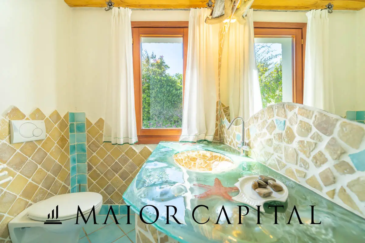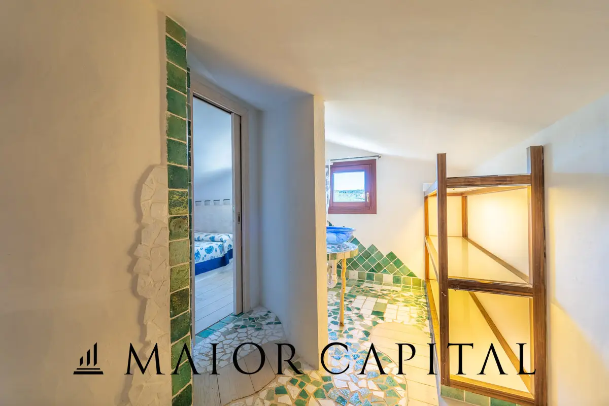 Inside, the villa features handcrafted commissioned finishes and furniture details that make it unique and elegant. Each room is distinguished by a different detail, such as the granite fireplace, the wrought iron and juniper staircase recalling Sardinian tradition, or the emerald-green Cera Sarda bathroom with starfish recalling sea life.