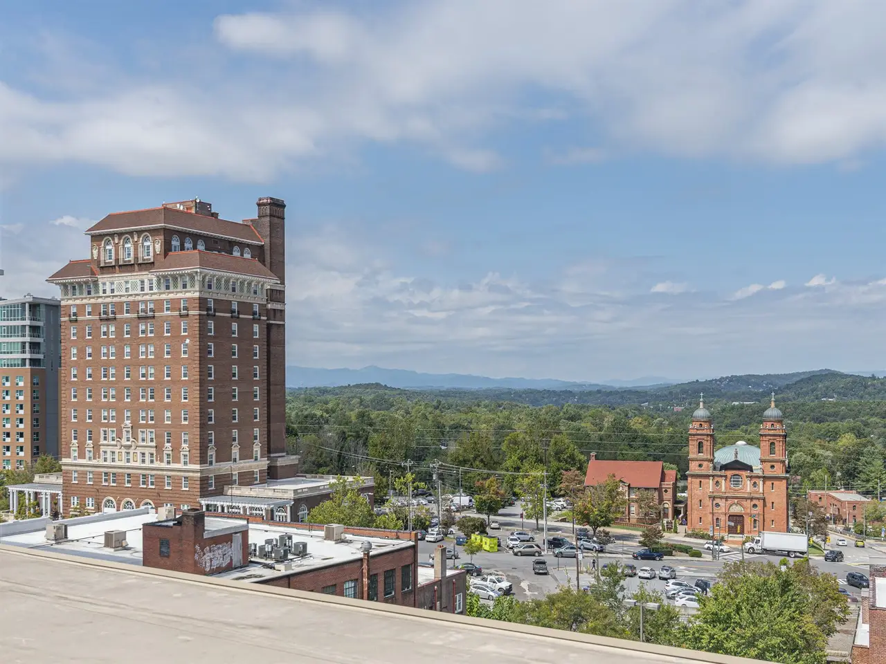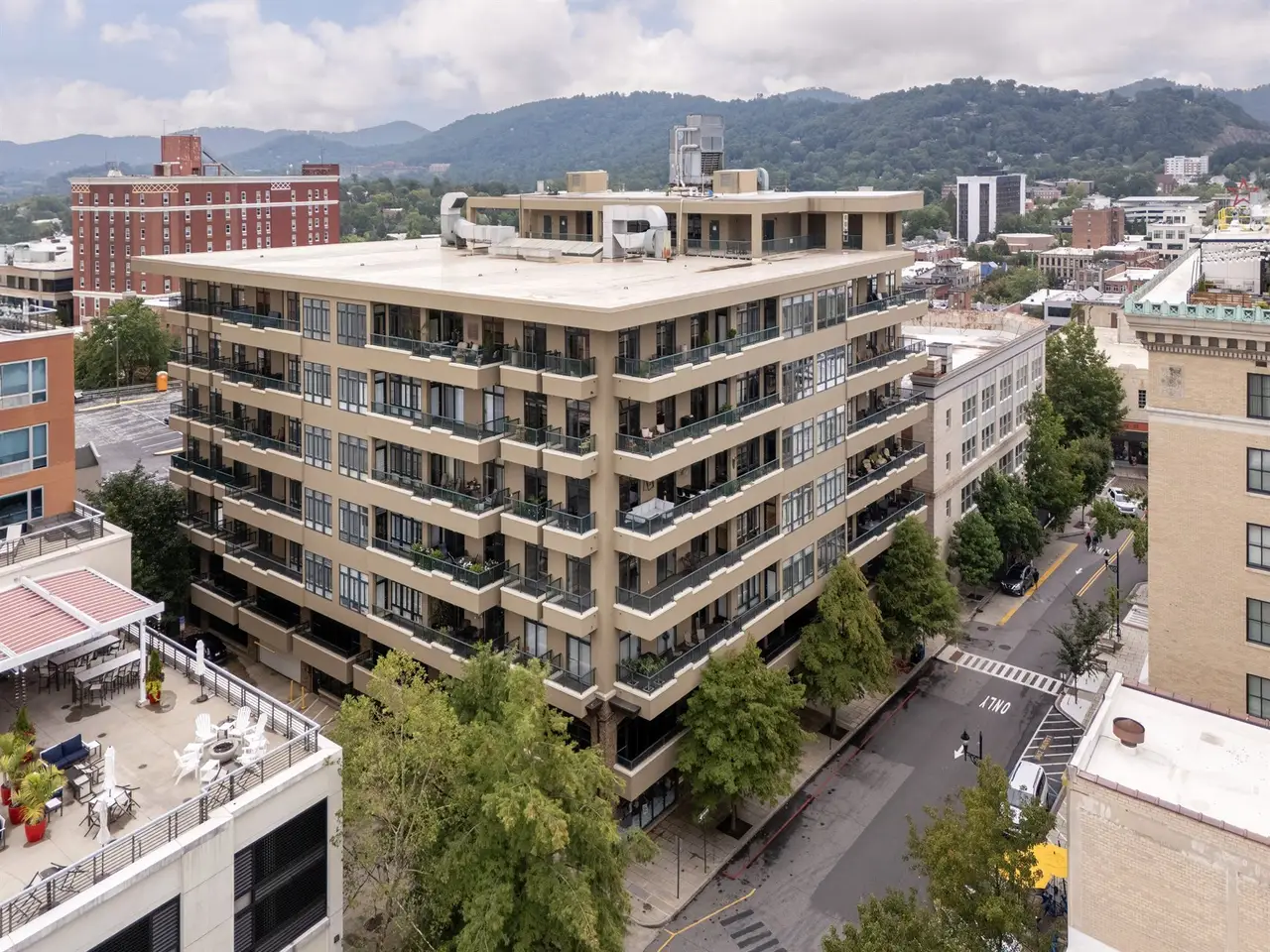 Enjoy living in the heart of Downtown Asheville in this light-filled, well-designed condo with views of the mountains and historic buildings. This spacious corner condo has its entrance off a multi-story atrium, elegantly furnished and inviting. The rooms are generously sized and open onto three balconies and a covered patio. The decor is neutral and will complement any style of furniture. In addition to ample storage within the unit, there is a separate large, lockable storage room that is heated and cooled. Owners have access to the rooftop with outdoor and indoor entertaining areas, an exercise room, and stunning views in all directions. The condo includes two secure parking spaces. This ideal location allows you to walk to numerous fine restaurants, eclectic shops, and entertainment venues. Experience urban living at its finest and discover why Asheville consistently ranks on so many lists of the best places to live.