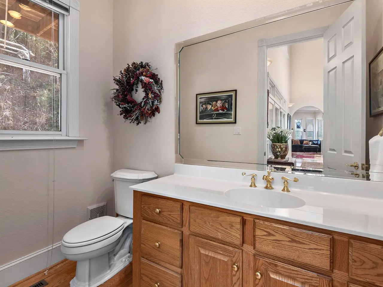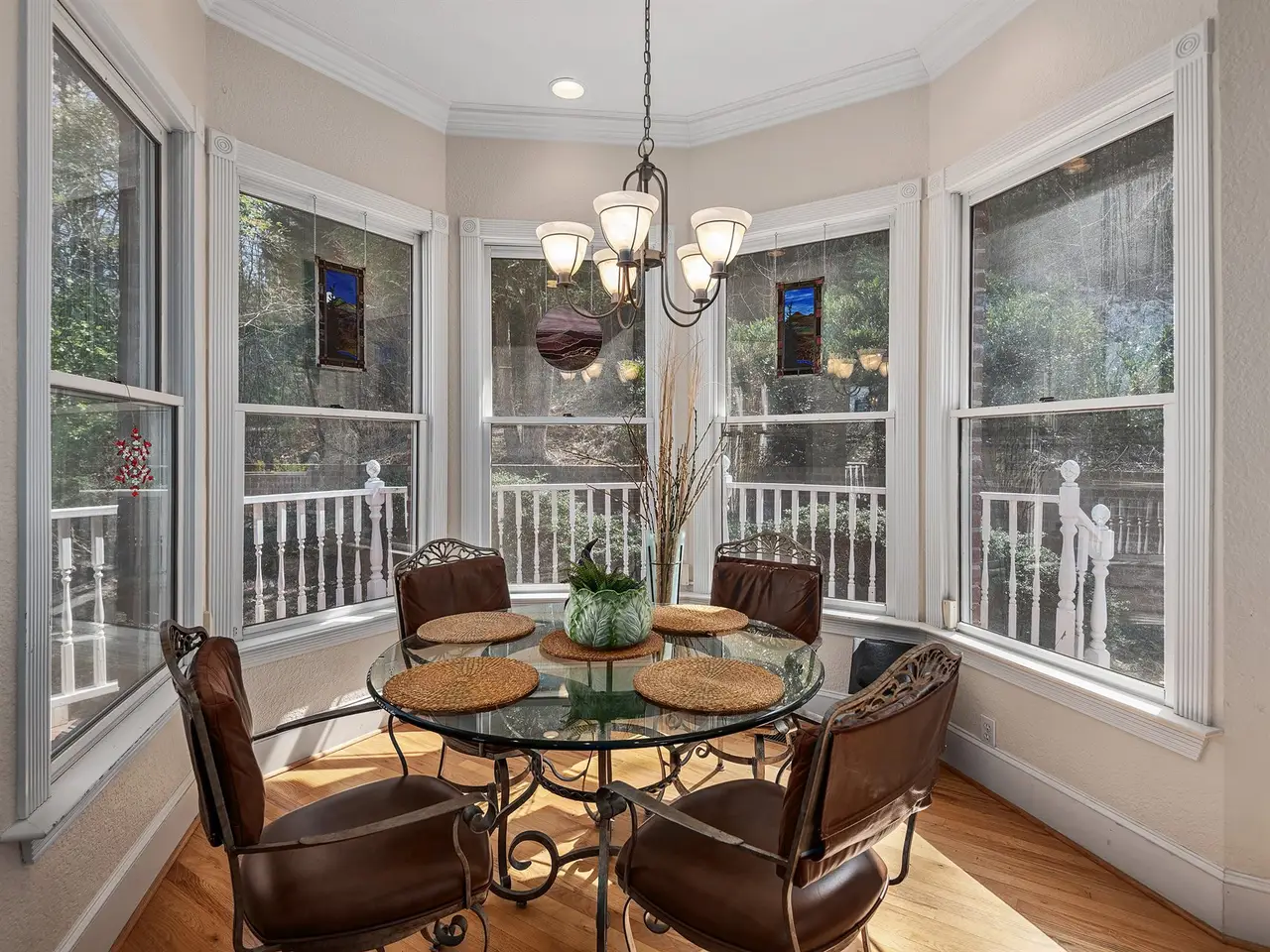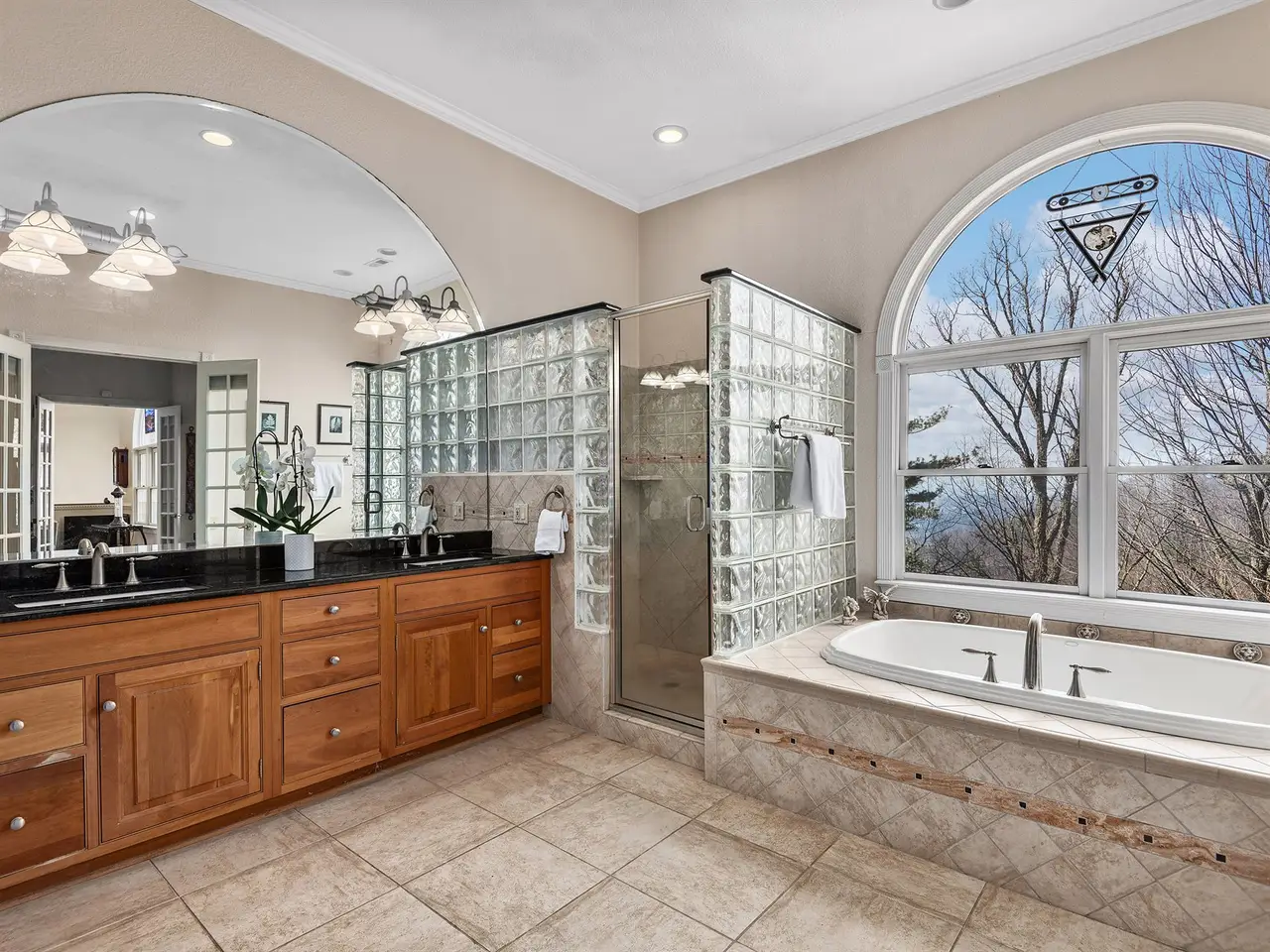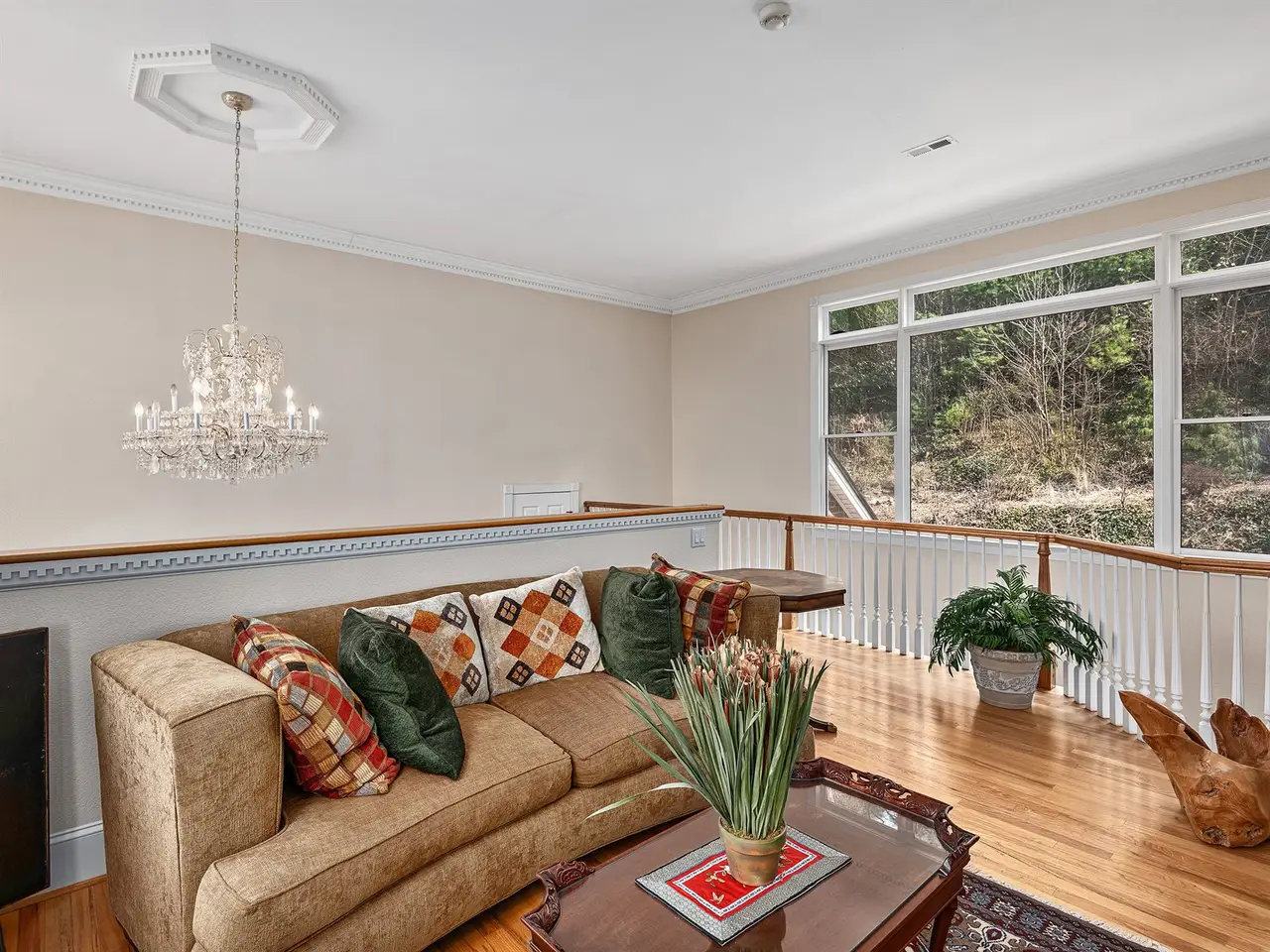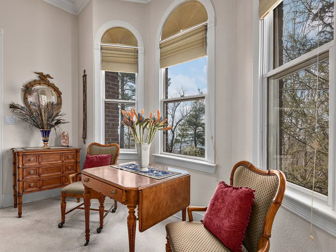 Grand estate on 7+ private acres with views of Beaver Lake and surrounding mountains. Towering high over Grove Park and Beaverdam Valley, this one-of-a-kind property gives the illusion of seclusion with its gates and pristine wooded setting while downtown Asheville is just down below. You are welcomed by a climbing driveway, brick terraced walls & walkways, and an elevated brick entryway. Inside, refined spaces & intimate nooks beckon entertaining & relaxation. Beyond the living room with sweeping views, you'll find a kitchen with cherry cabinetry, island, eat-in nook, keeping room & access to the open wraparound deck & gazebo w/ hot tub. The primary suite stretches across the upper floor & features a double sided fireplace, sitting room and bedroom w/ access to a covered porch & elevated footbridge to the rear. Two main level BRs & a finished walk-out basement add versatile space for play, work & overnight guests. Separate, self-contained apartment with long-range mountain views.