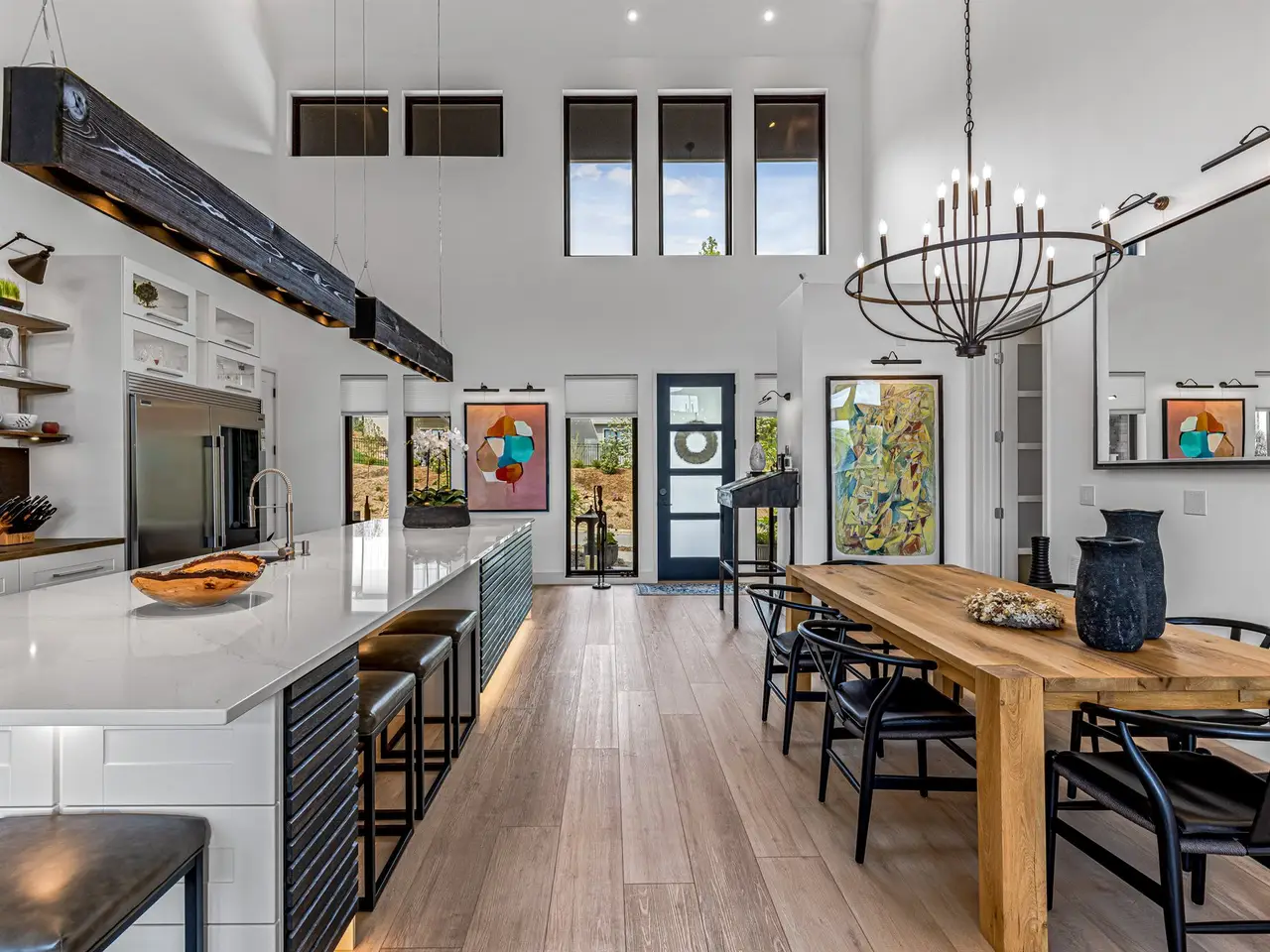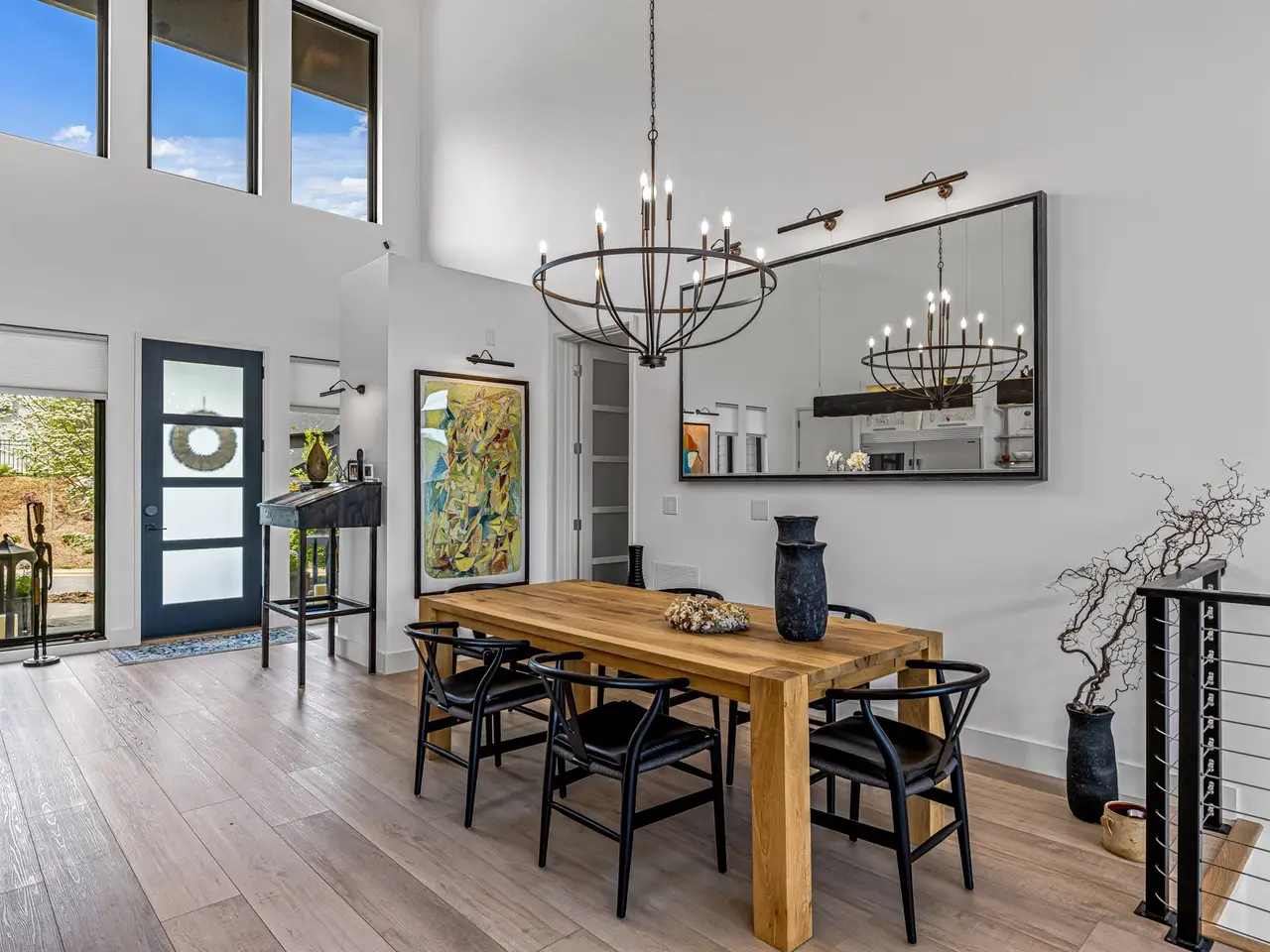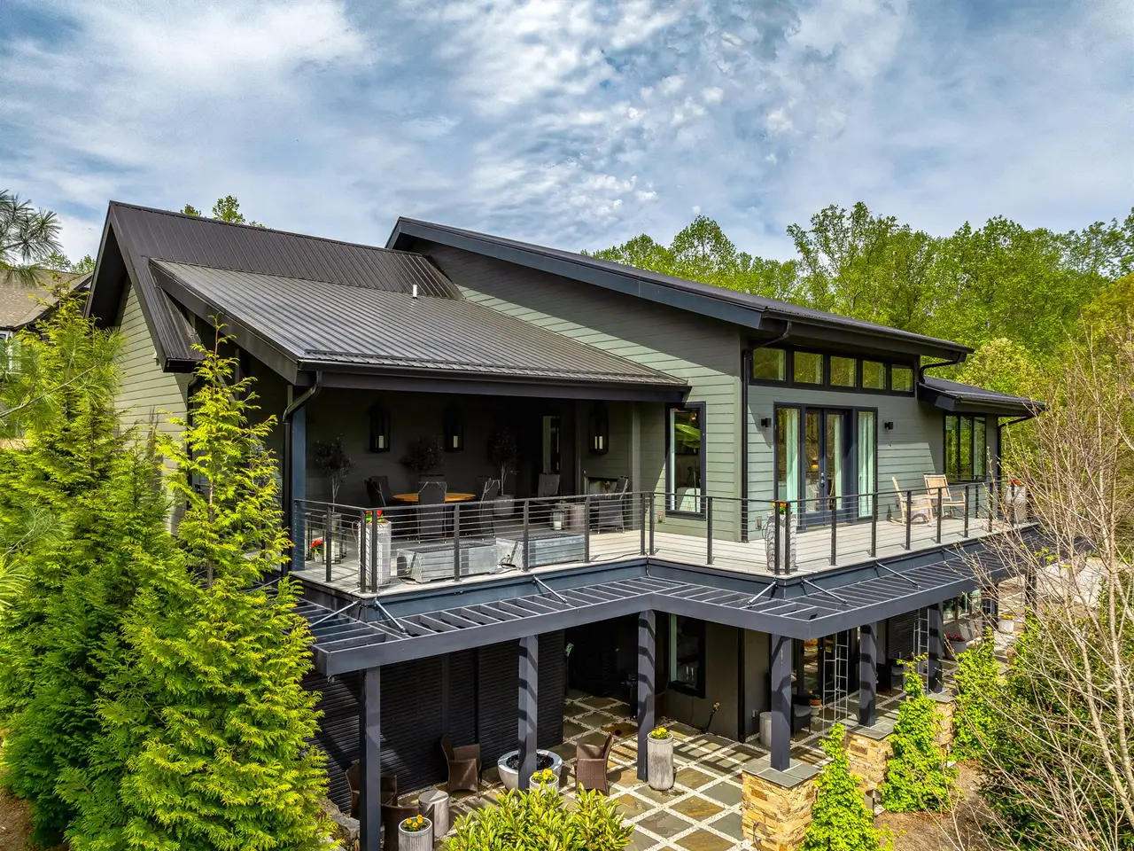 Timeless modern elegance combines seamlessly with the finest in lighting and technology in this custom mountain home located in gated Thoms Estate. Sleek metal surfaces, endless natural light, and earthy wood tones create a magical atmosphere curated by the movement of the sun. Relax in the living/great room with soaring ceilings or entertain on the covered and open decks surrounded by candle lanterns and raised fire boxes. Enjoy a spectacular Chef's kitchen with internally lit drawers, an LED lit Schott Ceran cooktop, and a column refrigerator and freezer. The main level primary suite entices with its privacy and delicious spa bath. The terrace level offers modern stained concrete floors, a wine gallery, fabulous home office/craft room, two guest bedrooms and a bright family room that opens to the terrace patio with concealed storage. Energy efficiency and sustainable living are maximized in this N.C. Green Built Certified home with HERS score of 57. Spectacular, luxury living awaits!