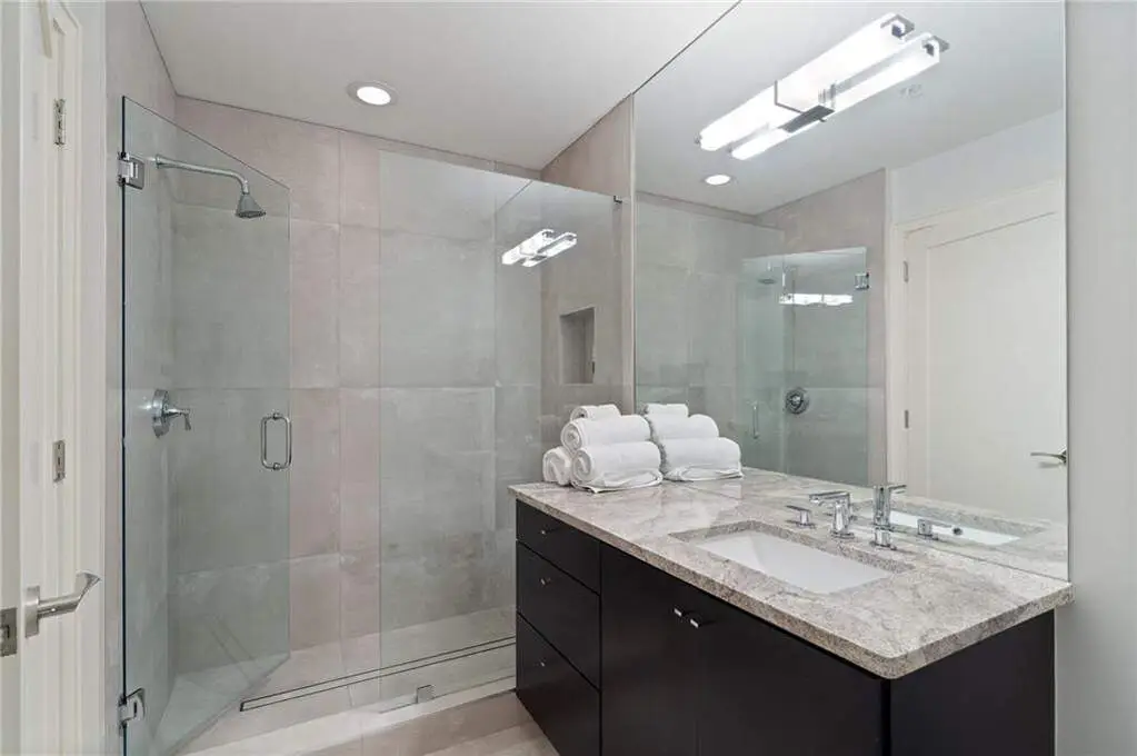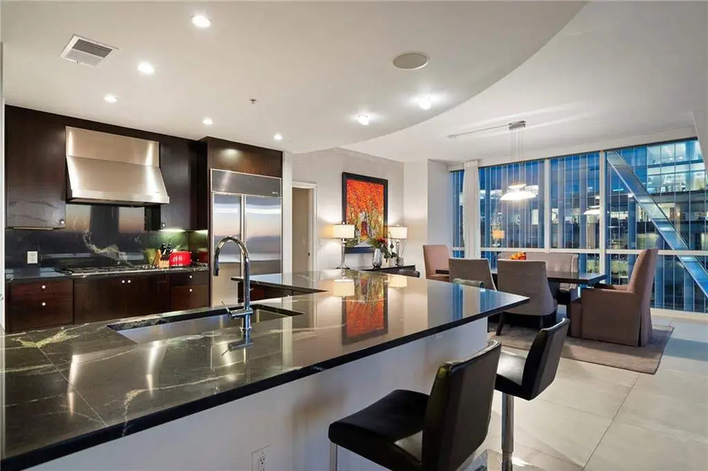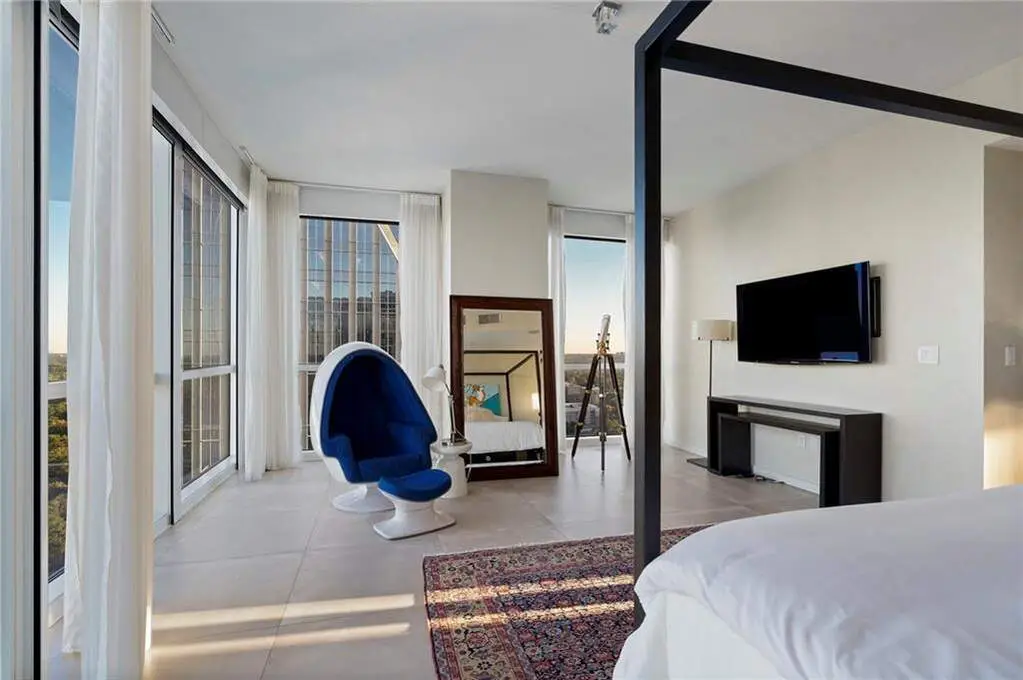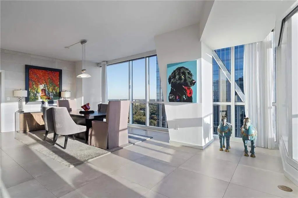 A rare offering in highly sought-after Terminus - one of only three residences with this sexy and coveted floor plan - this impressive corner unit embodies elevated Buckhead living with its expansive layout and nearly 360-degree skyline views from the 3 separate terraces. An entertainer's dream, the open-concept living area features a fireside great room and a sleek bar complete with Sub-Zero wine storage. The adjoining dining and media rooms flow seamlessly into a gourmet kitchen outfitted with top-of-the-line appliances, including Sub-Zero refrigeration, Wolf gas range and warming drawer, and a convenient breakfast bar. A separate catering entrance off the kitchen makes hosting effortless. Step outside to the oversized, covered terrace and take in breathtaking views of both Buckhead and Downtown - the perfect backdrop for dining or entertaining al fresco. Privately situated, the luxurious primary suite with Venetian plaster walls offers a tranquil retreat with a sitting area framed by floor-to-ceiling corner windows, a private covered terrace with views of Stone Mountain and Buckhead, and an expansive custom walk-in closet with a built-in safe. The spa-inspired bath showcases dual vanities and water closets, a soaking tub, and a frameless glass shower - all positioned to capture the home's extraordinary vistas. Two additional guest suites, each with ensuite baths, share a third balcony and are thoughtfully placed off the foyer for privacy. Additional highlights include Famosa Italian tile throughout, motorized shades throughout, leak defense water system, Toto toilets, and a fully integrated Lutron and Control4 smart home system and a 1/2 bathroom. Two deeded, covered parking spaces complete this exceptional offering. Perfectly positioned at Terminus, just steps from Buckhead's finest dining, shopping, and MARTA access.