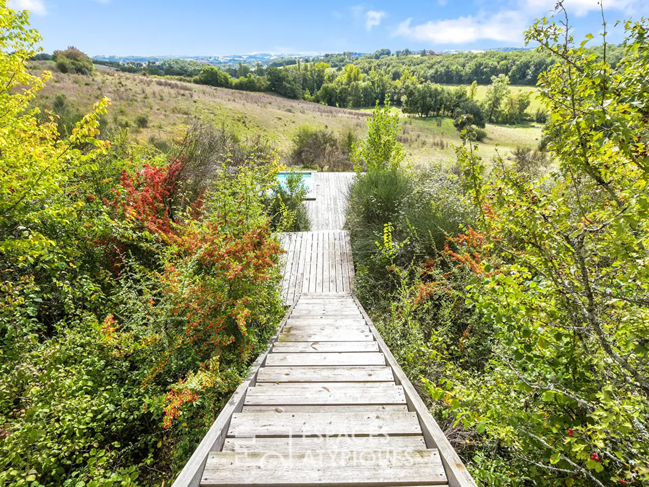 Located a few minutes from the city center of Auch, this contemporary and ecological house of approximately 240sqm impresses with its architecture. This property offers a unique and harmonious living environment, in perfect symbiosis with the surrounding nature. It is nestled in a green setting on a wooded plot of nearly 2 hectares, in the heart of the Gers hills. The avant-garde architecture of this residence, accessible by an intimate path lined with trees, is gradually revealed. With an open plan, on concrete stilts, this architect's house is spread over two floors. Concrete and steel are combined here with wood, in a bias that favors a natural material. It offers, in a simple volume, great spatial fluidity and plays with the slope of the land. Glazed on all sides, it offers a feeling of total immersion in nature, with balconies and terraces allowing you to escape to the garden and enjoy the panoramic view. The ground floor receives the living rooms on 110sqm. The kitchen precedes the many spaces with a strong personality: library, living room, living room and the dining room. A first night space with a bedroom and bathroom finds its place. The first floor, meanwhile, is dedicated to rest. Three bedrooms find their place and, slightly apart, a master suite completes this level. The exteriors are not left out, the naturally wooded land constitutes the ideal setting. Many footbridges lead to a swimming pool below the construction with an unobstructed view. This exceptional house, both modern and integrated into its natural environment, is a rare place to live, combining serenity and proximity to the Capital of Gers. Auch city center: 5 minutes 50sqm cellar, ideal for various development projects: artist's studio, wine cellar, or even a cinema room. for artists, oenophiles, film buffs, : Ecological construction Suspended terraces View of the Pyrenees ENERGY CLASS: A / CLIMATE CLASS: C. Estimated average amount of annual energy expenditure for standard use, established from 2021 energy prices: between EUR1,980 and EUR2,730 Information on the risks to which this property is exposed is available on the Georisques website http://www.georisques.gouv.frREF. 7958Additional information* 6 rooms* 4 bedrooms* 3 bathrooms* Outdoor space : 19000 SQM* Parking : 5 parking spaces* Property tax : 3 837 €Energy Performance Certificate Primary energy consumption : 117 kWh/m2.anHigh performance housing*A*B*117kWh/m2.an3*kg CO2/m2.anC*D*E*F*G Extremely poor housing performance* Of which greenhouse gas emissions a : 3 kg CO2/m2.anLow CO2 emissions*3kg CO2/m2.anA*B*C*D*E*F*GVery high CO2 emissions Estimated average amount of annual energy expenditure for standard use, established from energy prices for the year 2021 : between 1980 € and 2730 €Agency fees The fees include VAT and are payable by the vendor Mediator Mediation Franchise-Consommateurswww.mediation-franchise.com29 Boulevard de Courcelles 75008 Paris Information on the risks to which this property is exposed is available on the Geohazards website : www.georisques.gouv.fr