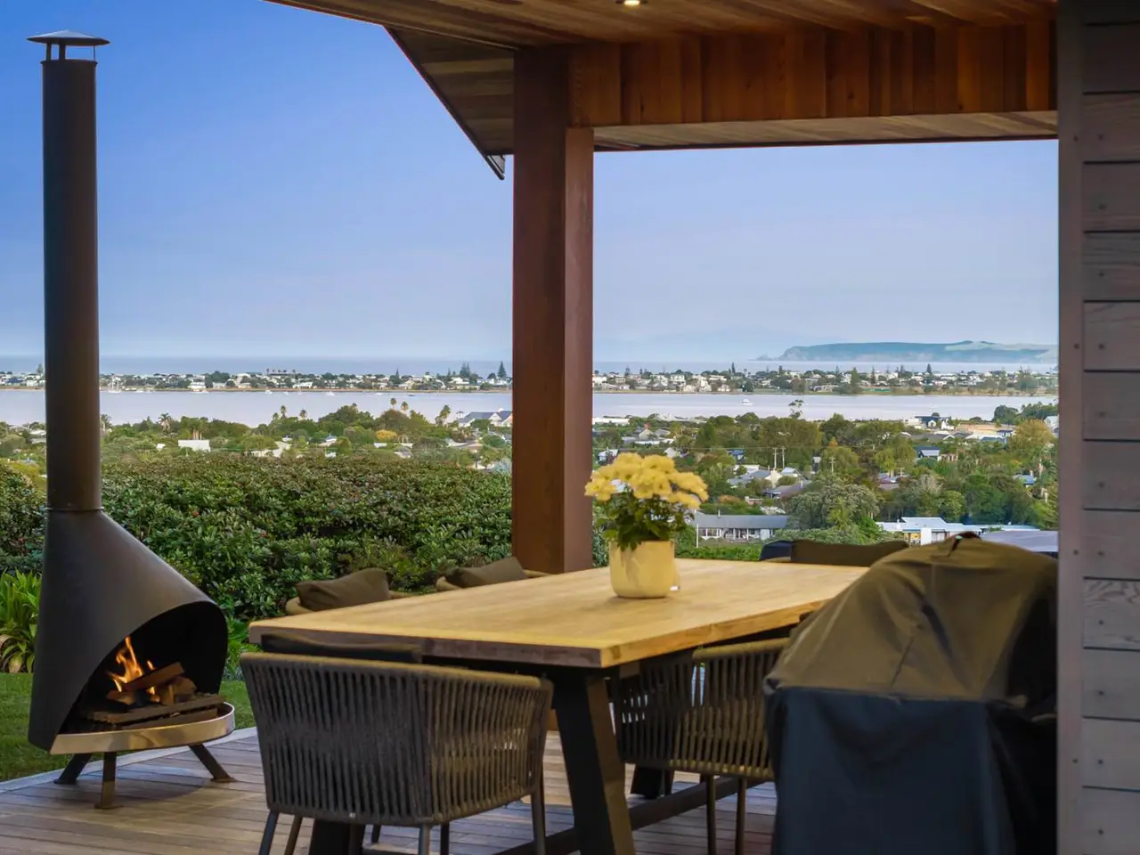 Covered outdoor dining and sun-washed decks