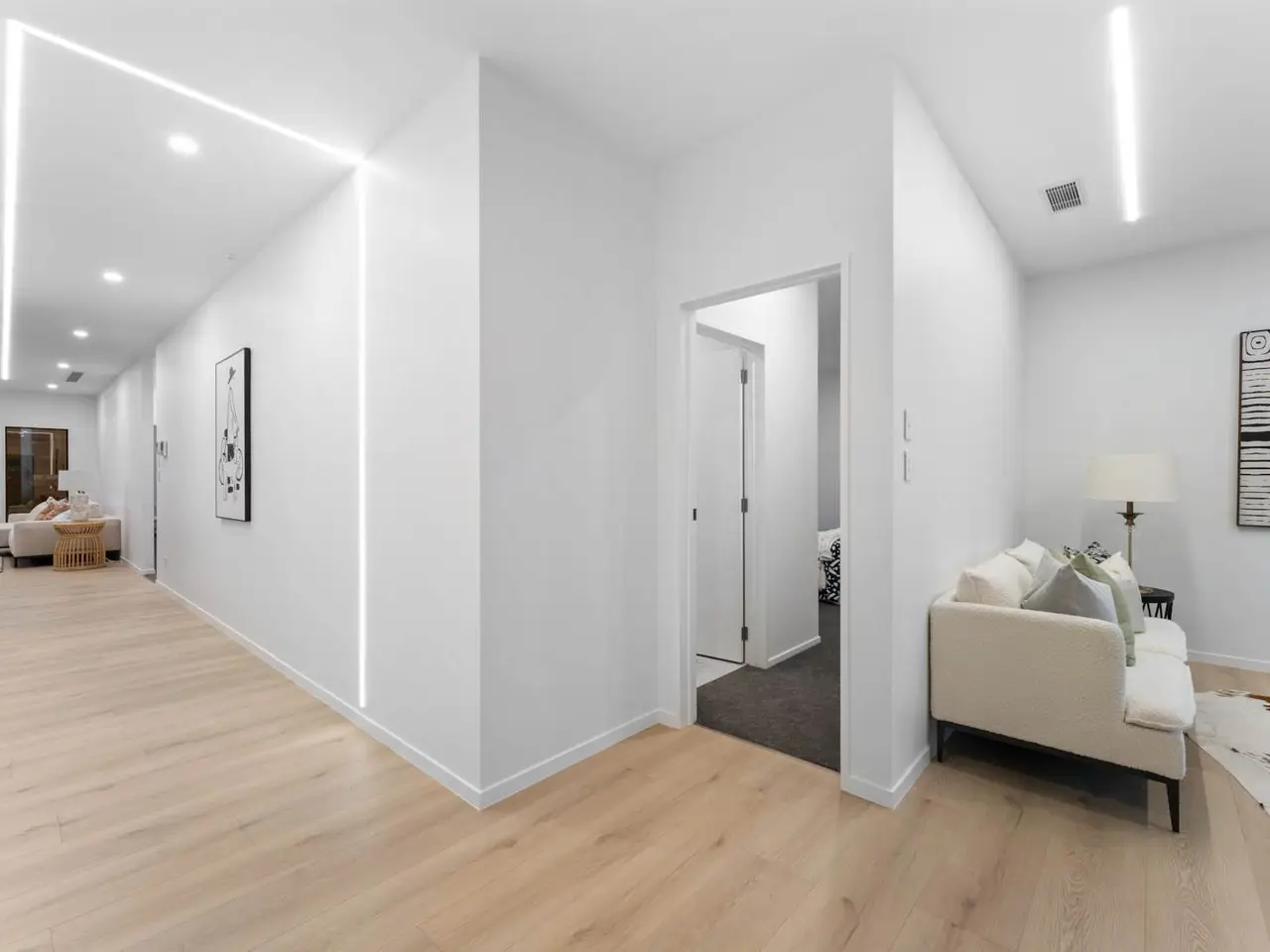 Soaring cathedral ceilings with recessed LED lighting