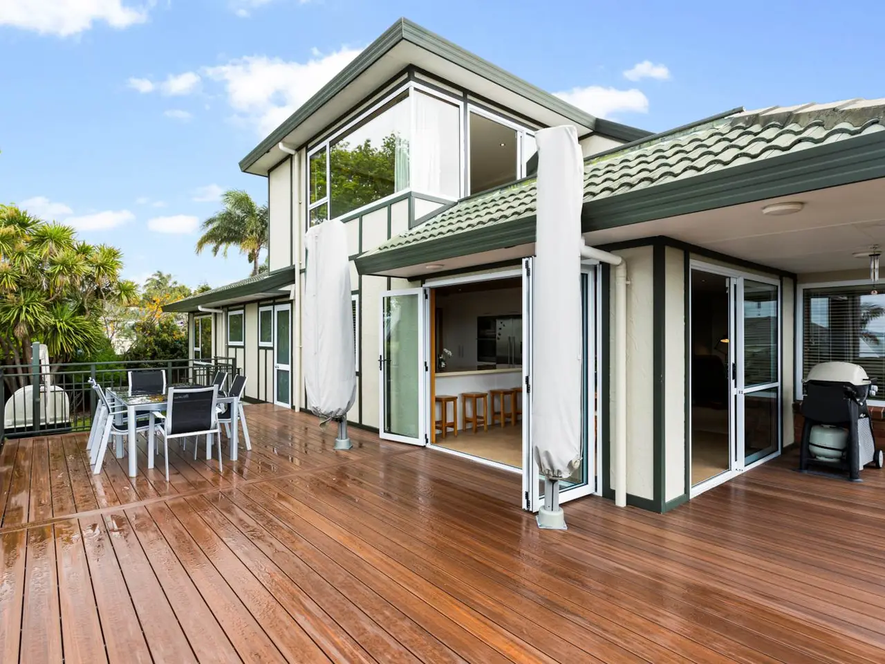 - Sprawling sun-drenched deck with modern umbrellas