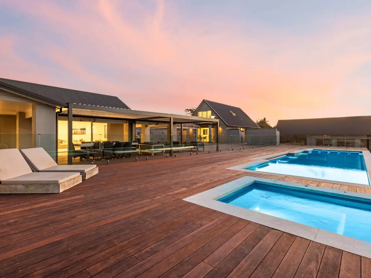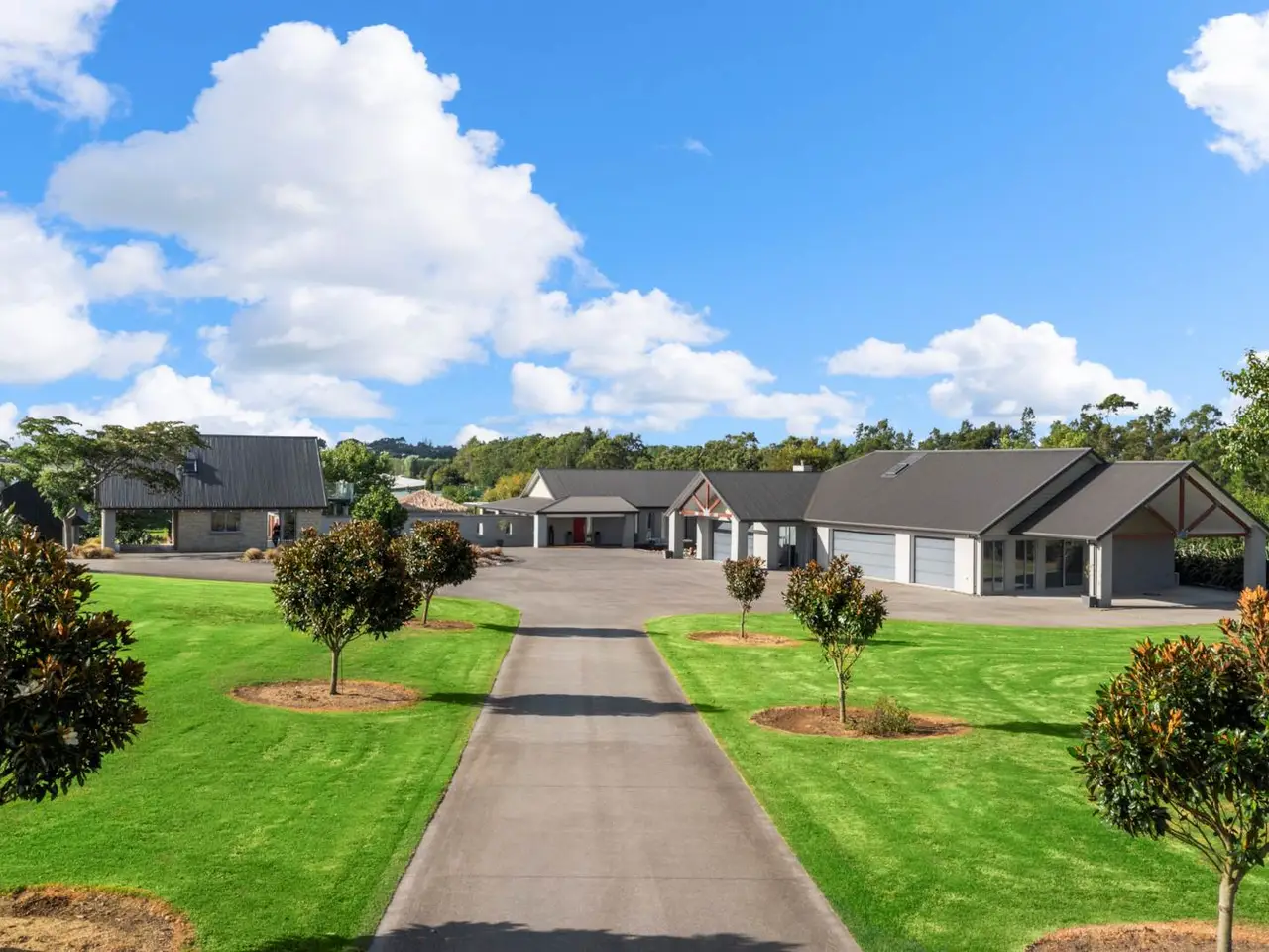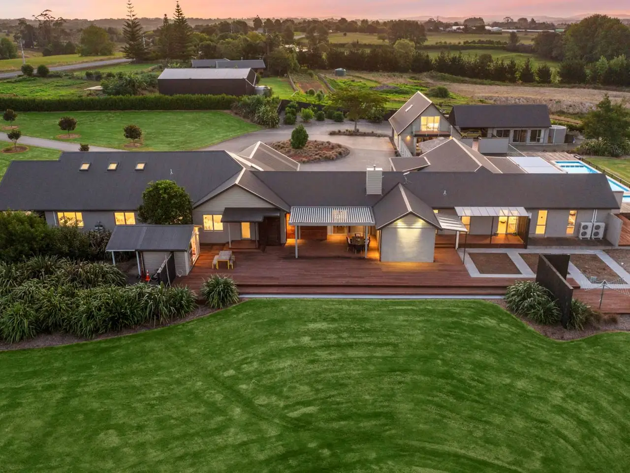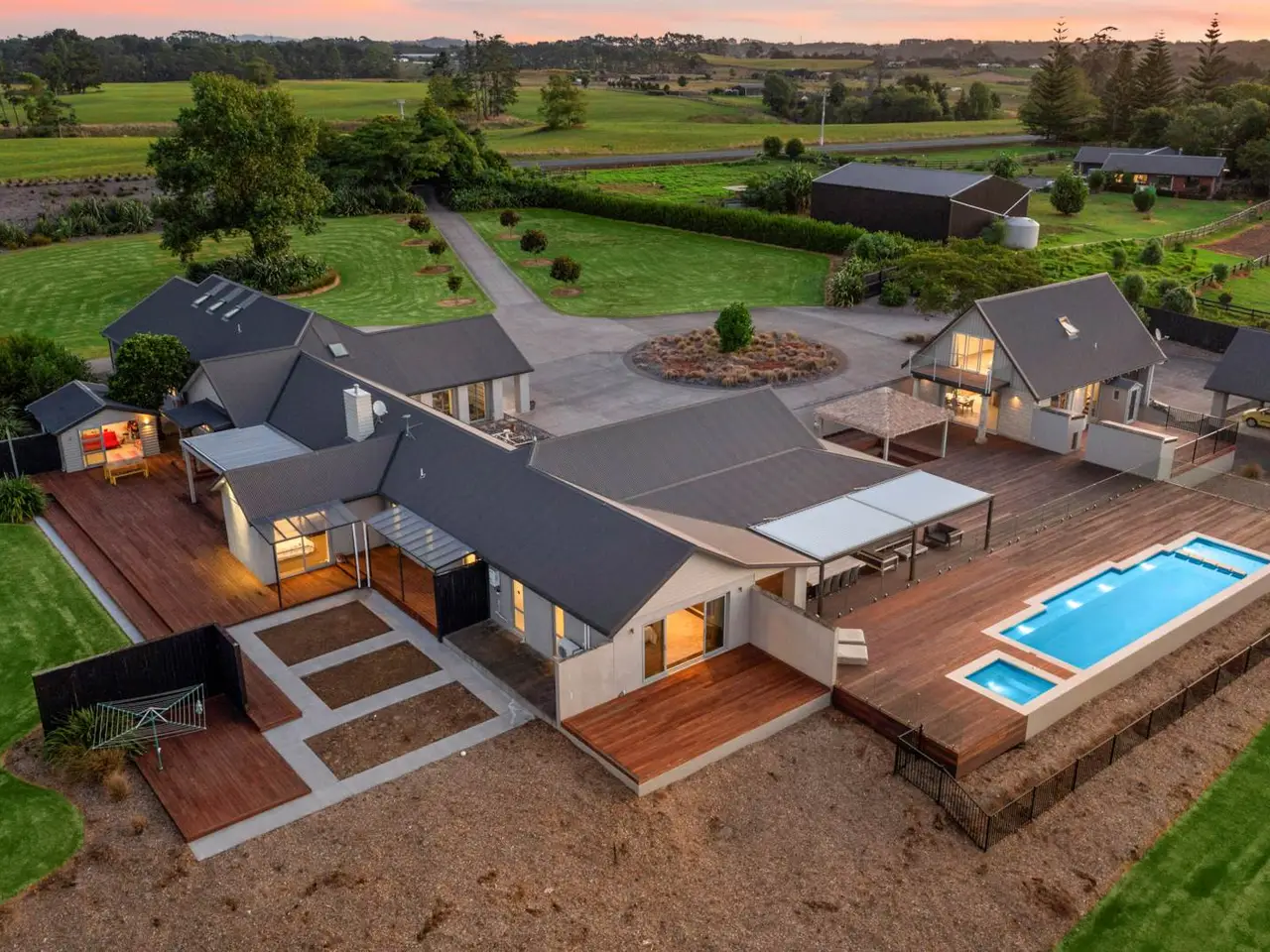 Located in the quiet Franklin community of Kingseat, neighbouring Karaka & Patumahoe village, no detail has been overlooked or expense spared in the creation of this magnificent north-facing solid masonry home of grand proportions and its additional independent living facilities. Set on 3.48 hectares/8.6 acres in a sought after locale and boasting fine fittings and fixtures, this huge premium quality 596 square metre (approx) residence incorporates six bedrooms comprising the sumptuous, privately positioned master bedroom with large walk-in robe, chic ensuite and access to two decks, scenic vistas and gentle evening breezes. The further five sunlit bedrooms, all with built-in wardrobes and tranquil views, share a bathroom with free-standing bath and shower. Thoughtful design is evident with one living room strategically placed in the dormitory wing for use as a study/rumpus room for the youngsters. There’s a separate powder room, a large well-appointed laundry with outdoor access and excellent storage provision. Centrally located, the modern kitchen basks in light-filled reflective surfaces with glossy tiled floors, granite benchtops, expansive cabinetry and quality stainless steel appliances. Super-spacious sophisticated family living and dining adjoin unsurpassed entertaining facilities with a massive media/entertainment room spilling out to ultra-large louvre-covered pergola and Kwila decks wrapping around idyllic leisure in the heated mineral swimming pool and spa and around the covered fire-pit. There’s a carport plus internal entry garaging for six cars with a man cave plus bar and bathroom above and, on the opposite side of the pool, an impeccable 155 square metre (approx) fully equipped two bedroom pool house stands ready to lavishly accommodate visitors. Further along the property there’s also a 130 square metre (approx) barn with a gym room, a living room with shower and an implement shed and still so much space for further development if desired. Ducted air conditioning, security system, water tanks etc. There’s absolutely nothing to need in this super-sized, superbly equipped modern mansion.• Massive north-facing 596m2 (approx) mansion set on 3.48 ha/8.6 acre• Impressive gated entry. Security system. Prestige locale• Ducted air con. Fine fittings & fixtures throughout• Rumpus/study/ lounge room adjoining dormitory zone• Sunlit open plan living & dining spilling out to Kwila decks• Chic quality modern kitchen with granite benchtops• Huge entertainment room opening to Kwila decks• Lavish master bedroom, walk-in robe, ensuite & deck access• + 5 scenic spacious bedrooms, some flowing outdoors• Sleek family bathroom with free-standing bath & shower• Powder room. Large laundry + outdoor access. Storage• Vast expanse of Kwila decks. Motorised louvred pergolas• Stunning heated mineral pool & spa + covered fire pit• 6 car garaging. Internal entry. Man cave with bathroom• Impeccable fully self-contained 2 bedroom pool house• 130m2 (approx) shed. Gym room & bathroom. Storage room• 4 carports. Extra parking. 3 phase power. 84,000L tanks• 13 km to Southern motorway on-ramp• Just 12 km to Pukekohe township & community facilities• Close proximity to Patumahoe School & Strathallan bus route Auction: 177 King Street, Pukekohe (Branch Office) on Thursday 20 November 2025 at 2:00PM (unless sold prior)