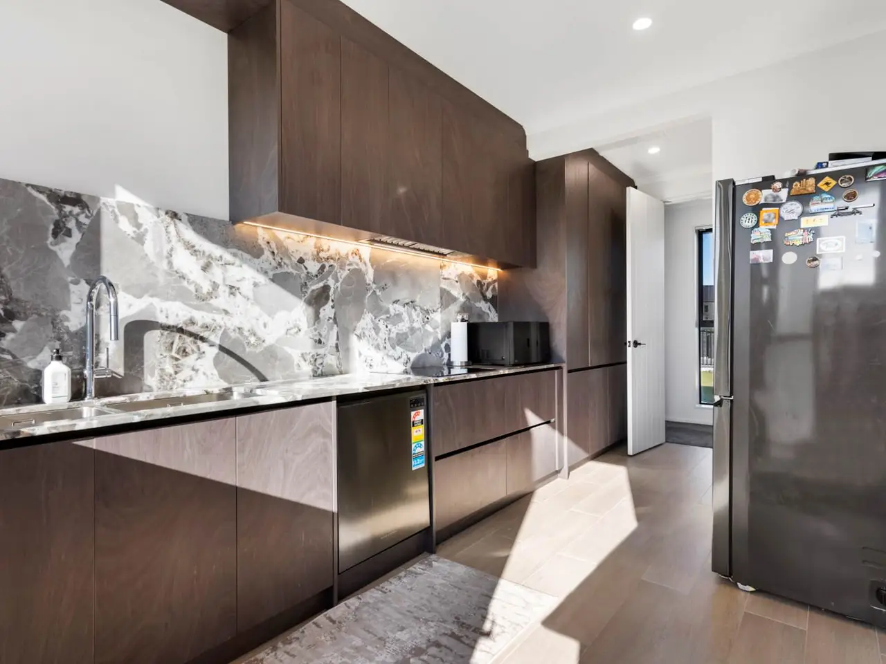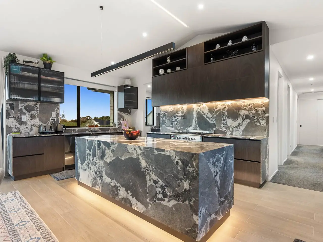 Open plan kitchen with engineered stone bench
