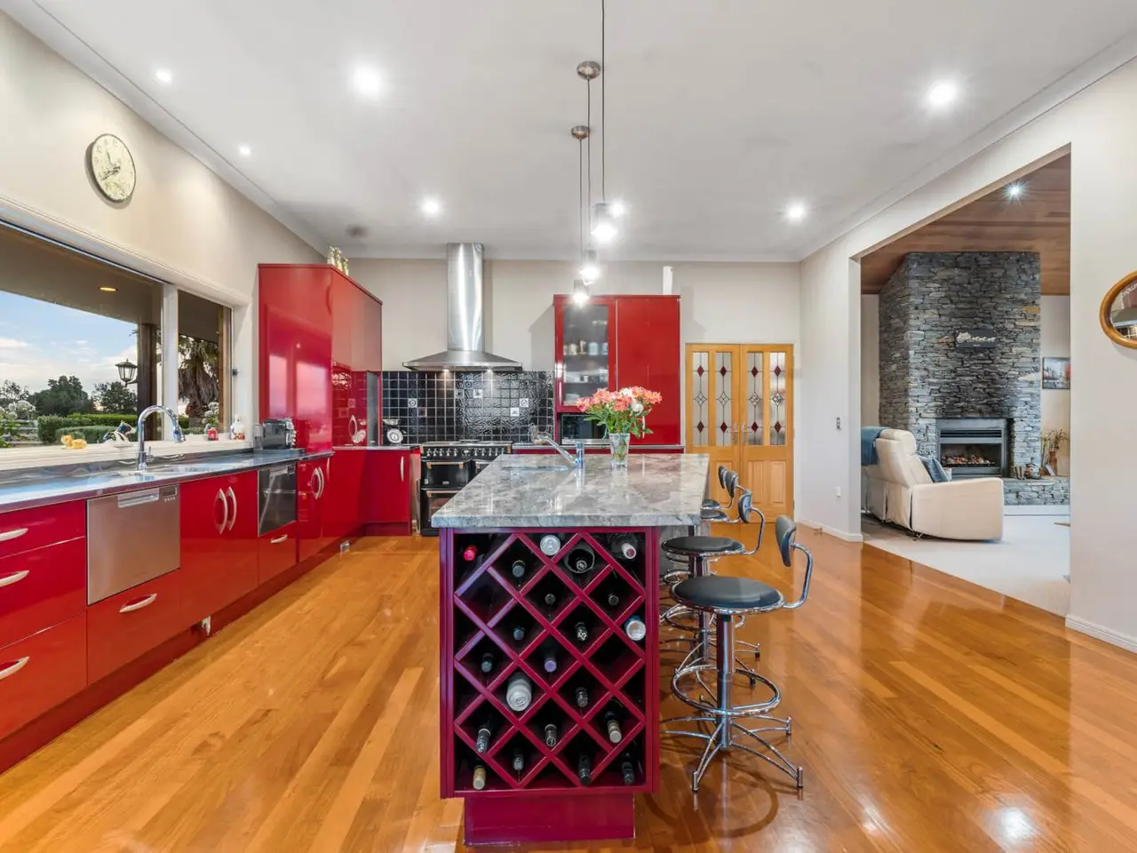 Generous granite kitchen with schist fireplace