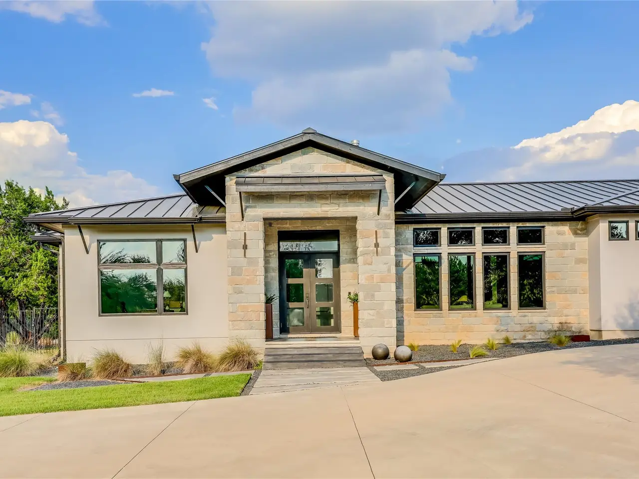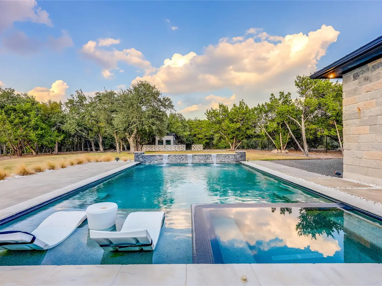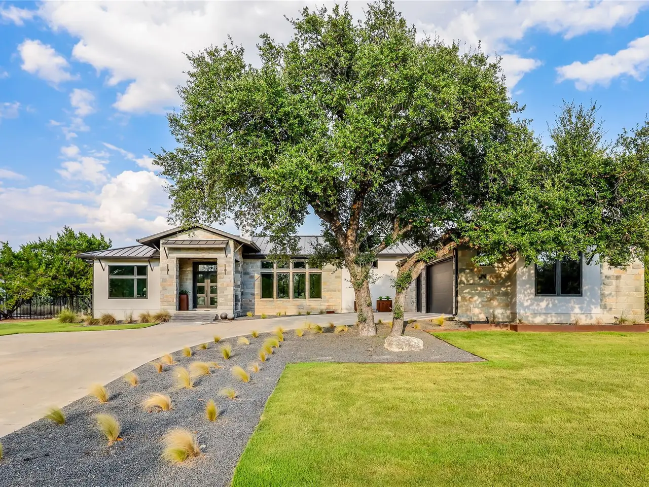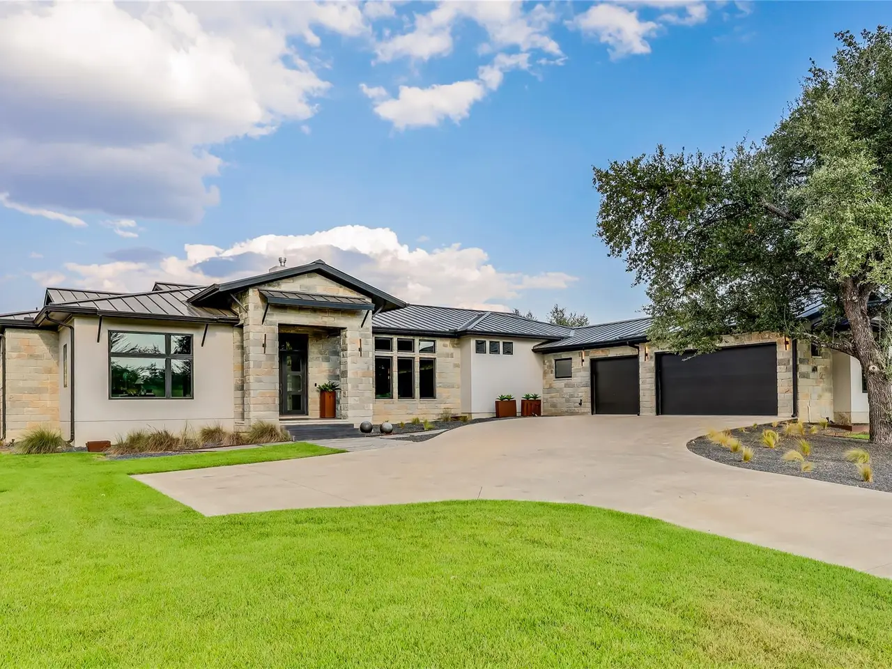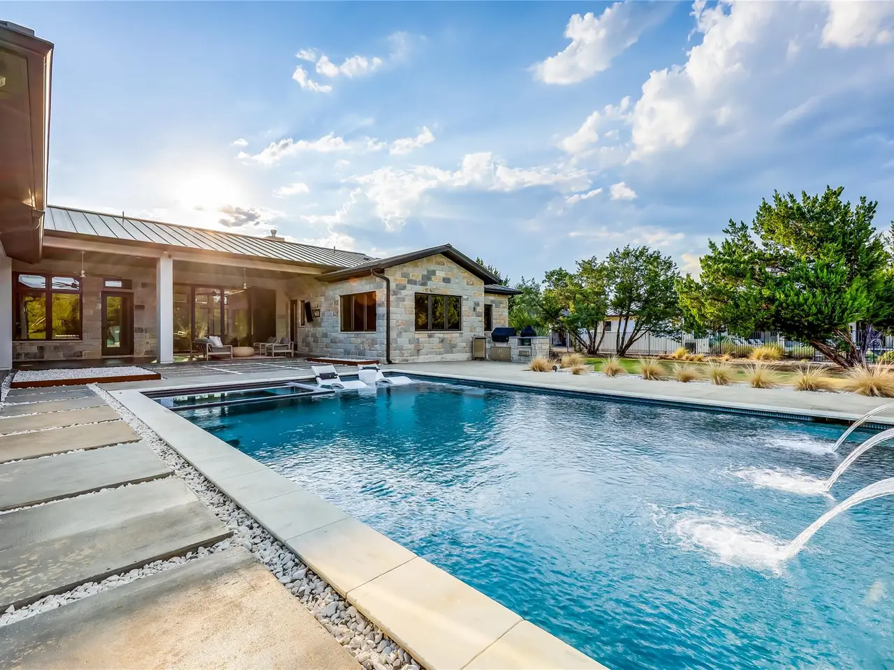 Beautifully Refreshed - With new wood floors, updated bathroom tile, fresh paint, and more! This modern single-story residence in the coveted Meridian community by Nalle Homes combines thoughtful architecture with refined craftsmanship for elevated indoor-outdoor living. A rare lot spanning both Hays and Travis counties provides families with unique flexibility and options for schools--an incredible advantage in addition to custom luxury and lifestyle. The distinctive U-shaped floor plan creates two private wings housing 4 spacious bedrooms, ensuring tranquility for both owners and guests. Expansive sliding glass doors frame views of the resort-style backyard oasis, featuring an oversized heated pool and spa designed by Athena Pools--perfect for both sun-drenched days and starlit evenings. Inside, versatile living spaces flow seamlessly from the study with stained French doors to the airy great room designed for gathering. The chef's kitchen stands as the heart of the home, showcasing Thermador appliances, granite counters, and a sculptural honed marble island that invites both conversation and culinary creativity. Sophisticated enhancements include tinted Andersen 100 windows, a whole-house water softener and filtration system, a central vacuum, and a soundproofed media room that doubles as an additional office or bedroom for evolving needs. The oversized three-car garage features epoxy flooring and built-in storage by Garage Experts, while a fully finished private studio--climate-controlled and fully wired--offers space for creativity or work. The outdoor experience continues with a built-in grilling station featuring a Napoleon grill, a mini-fridge, and a Big Green Egg smoker, all set against lush landscaping with greenbelt views. Located just 15 minutes from downtown Austin within the Meridian master-planned community, residents also enjoy access to a private 10-acre lake, community pool, and walking trails.