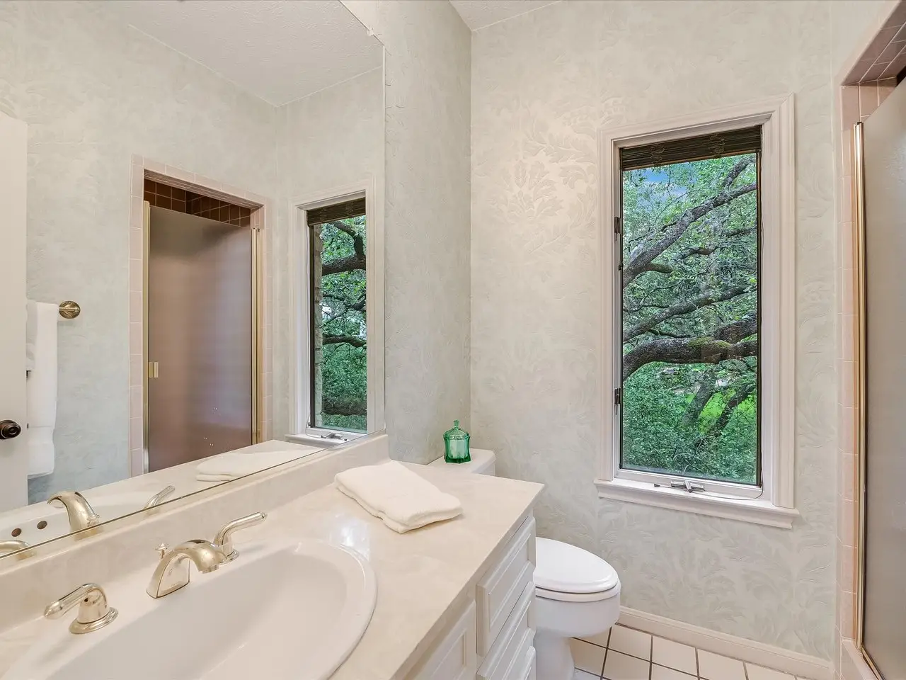 Come live in the treetops of this uniquely contemporary style home in the West Rim subdivision. Situated on a .78 acre lot and surrounded by magnificent oak trees, large picture windows capture the outside beauty from every angle. The second level entry opens to a stunning view of greenery which gives the feeling of living in the treetops. Cathedral ceilings and a dramatic fireplace highlight the upstairs living space. The spacious kitchen includes a center island, cozy breakfast seating, tons of storage. The formal dining space includes a wet bar and beverage refrigerator. A formal living area overlooks the front yard while a cozy seating arrangement by the fireplace looks out to the back yard. Also included on the second level are two secondary bedrooms, one full bath and one half bath. The downstairs area features an expansive primary bedroom which includes a living/study area with a fireplace, both looking out to the tree shaded back yard. A massive walk in closet and large primary bathroom provide everything needed for comfortable living. A large additional secondary bedroom and bath is also located downstairs. The home has been meticulously maintained and updated over the years. It is ready to be moved into or remodeled as desired. The private backyard is large enough for a pool with plenty of space to play. There is a "secret" garden at the back of the property with a patio and water feature. Upstairs and downstairs decks provide covered spaces for enjoying nature. West Rim subdivision enjoys an enviable park on Lake Austin just a short walk from this property. Owned by the HOA, the park includes boat slips, day dock, gazebo with barbeque, picnic tables, tennis court, sport court and separately gated playground.