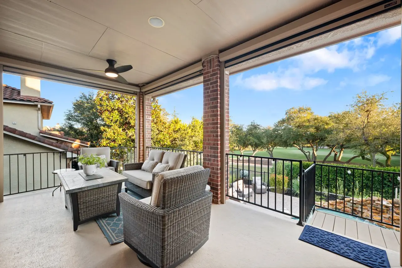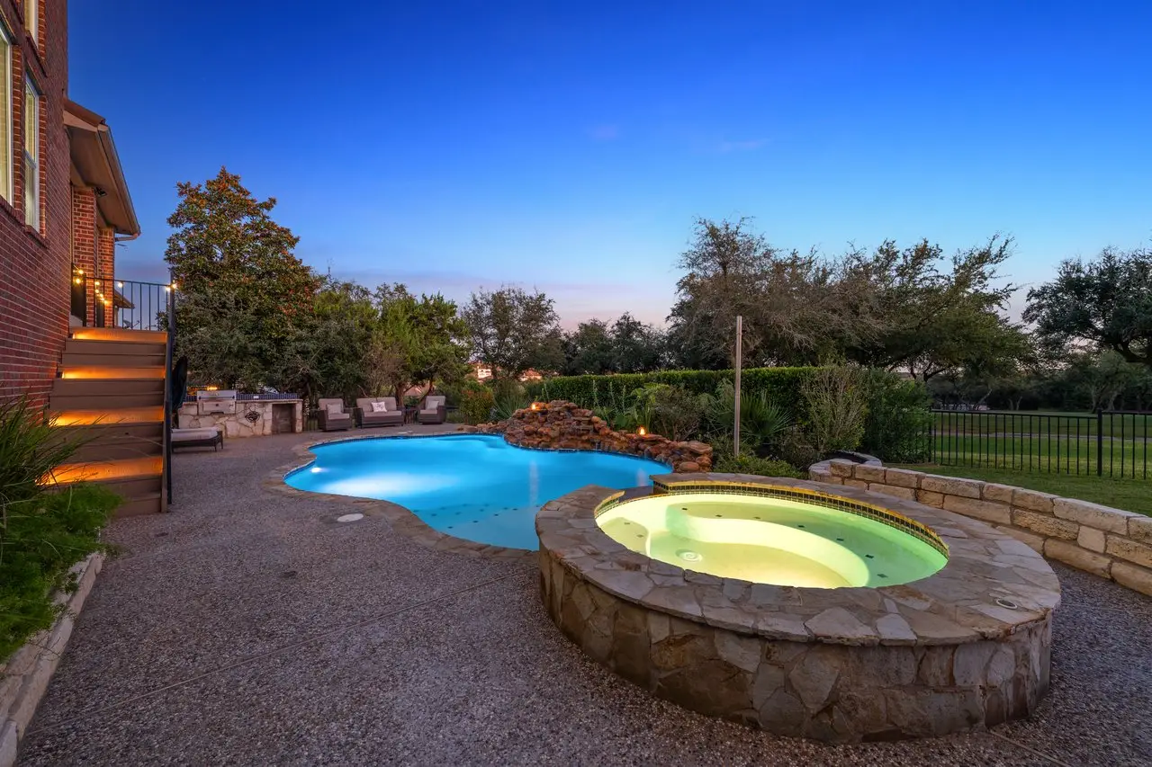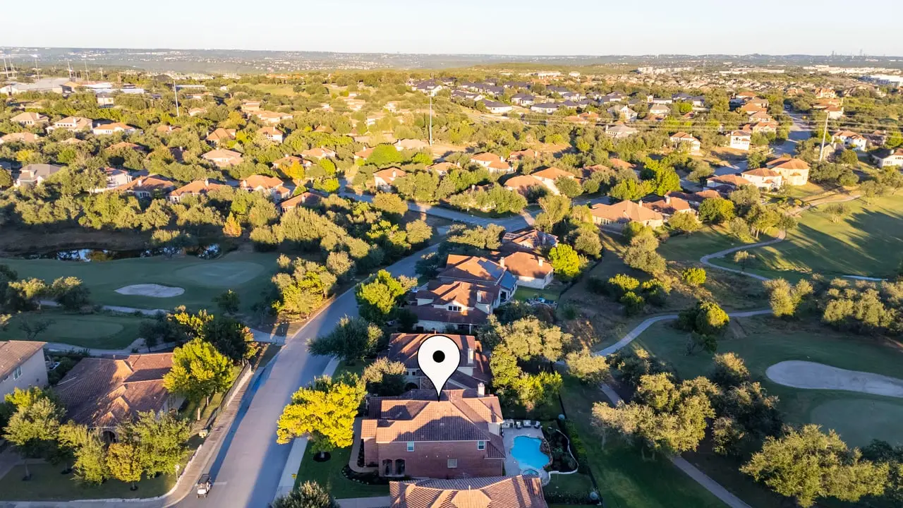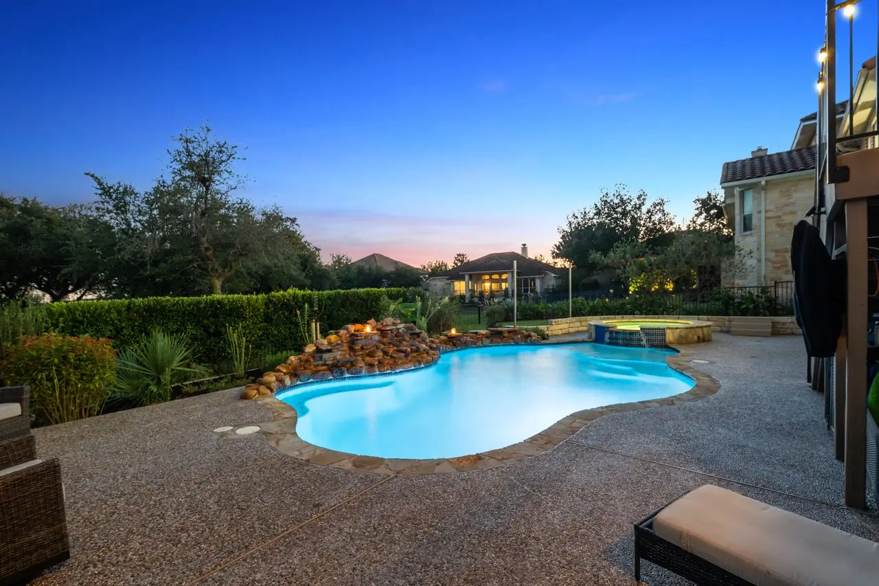 Discover elevated living in Falconhead with expansive GOLF COURSE views, a beautiful saltwater POOL and SPA, and thoughtfully designed outdoor living areas that make this home feel like a private retreat. Enjoy a welcoming covered front porch overlooking mature landscaping, a spacious covered back porch with remote-control shades, and multiple poolside lounging and entertaining areas perfectly positioned for relaxing, dining, or taking in the breeze—all overlooking Falconhead’s 13th hole. Inside, natural light pours through all new windows from Andersen and Pella, illuminating warm hardwood floors on the main level and the newly added wood staircase leading to the second floor. A tile roof adds timeless appeal and long-term durability. The refreshed kitchen feels bright and current with white painted cabinetry, a center island, and a new dishwasher and refrigerator, all opening seamlessly to the family room. The main-level primary suite is a private retreat with an updated spa-style bathroom and custom closet, plus a dedicated study/home office with no carpet on the entire first floor. Upstairs you’ll find a spacious game/media room with wood floors, three secondary bedrooms (all with brand-new carpet), and an additional office nook—ideal for homework, gaming, or a second workstation. Owners have thoughtfully upgraded the home with all new high-end fans, remote-control window coverings in the family room and back patio, a new water softener and purification system, and a charming butterfly garden. The pool has been well maintained with equipment improvements and updates, offering ease of use and peace of mind. This home is truly move-in ready with minimal ongoing maintenance needed, making it ideal for those who want to enjoy the Falconhead lifestyle from day one. Set on Spillman Ranch Loop within the established Falconhead community, residents enjoy easy access to Falconhead Golf Course, two neighborhood parks, and miles of hike-and-bike trails. With quick access to both Hwy. 620 and Hwy. 71, this is one of the most centrally located pockets of Lake Travis ISD—known for having some of the lowest property tax rates and HOA fees in the district—while still being minutes from golf, dining, shopping, and Lakeway/Bee Cave conveniences.