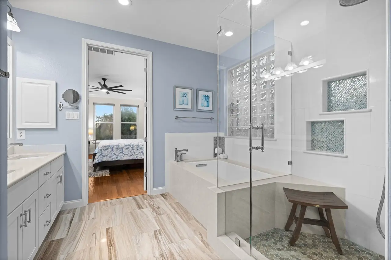 Tile roof for timeless appeal Updated spa-style bathroom with custom closet