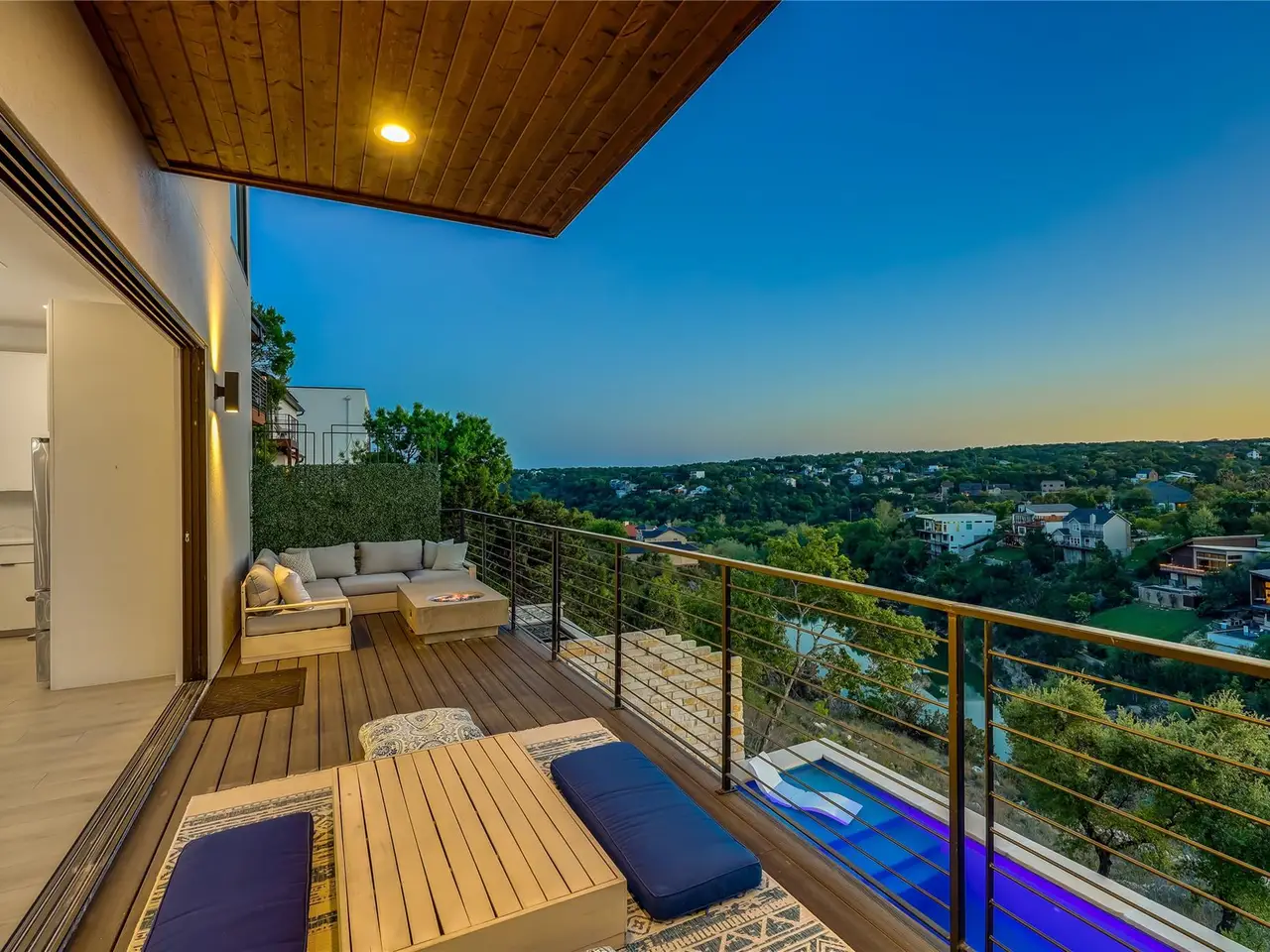 Nestled in the serene enclave of Apache Shores, Firefly Canyon is a breathtaking modern retreat offering panoramic views and a coveted setting backing onto Apache Shores Lake, a tranquil, creek-fed oasis. This stunning home boasts five spacious bedrooms and four luxurious bathrooms, designed with an open-concept layout that seamlessly blends style and functionality. The chef's kitchen features high-end stainless steel appliances, expansive quartz countertops, a waterfall island, and sleek European-inspired cabinetry. The generous dining area is framed by elegant sliding glass doors, opening onto a sprawling outdoor patio that invites effortless indoor-outdoor living.Designed for both relaxation and entertaining, this home offers a private rooftop deck, a cozy fire pit, and a heatable pool and spa--all set against the backdrop of breathtaking lake views. The primary suite is a true retreat, featuring a private balcony and a spa-inspired bathroom.Perfectly situated just 10 minutes from Lakeway and 20 minutes from downtown Austin, Firefly Canyon balances privacy with convenience. Its prime location and luxurious amenities make it an outstanding investment opportunity, offering top-tier rental potential year-round in Austin's thriving vacation market. With easy access to Lady Bird Lake, Lake Travis, top-ranked schools, medical facilities, scenic hiking trails, and premier shopping and dining, this exceptional property delivers an unparalleled lifestyle in one of Austin's most sought-after communities.