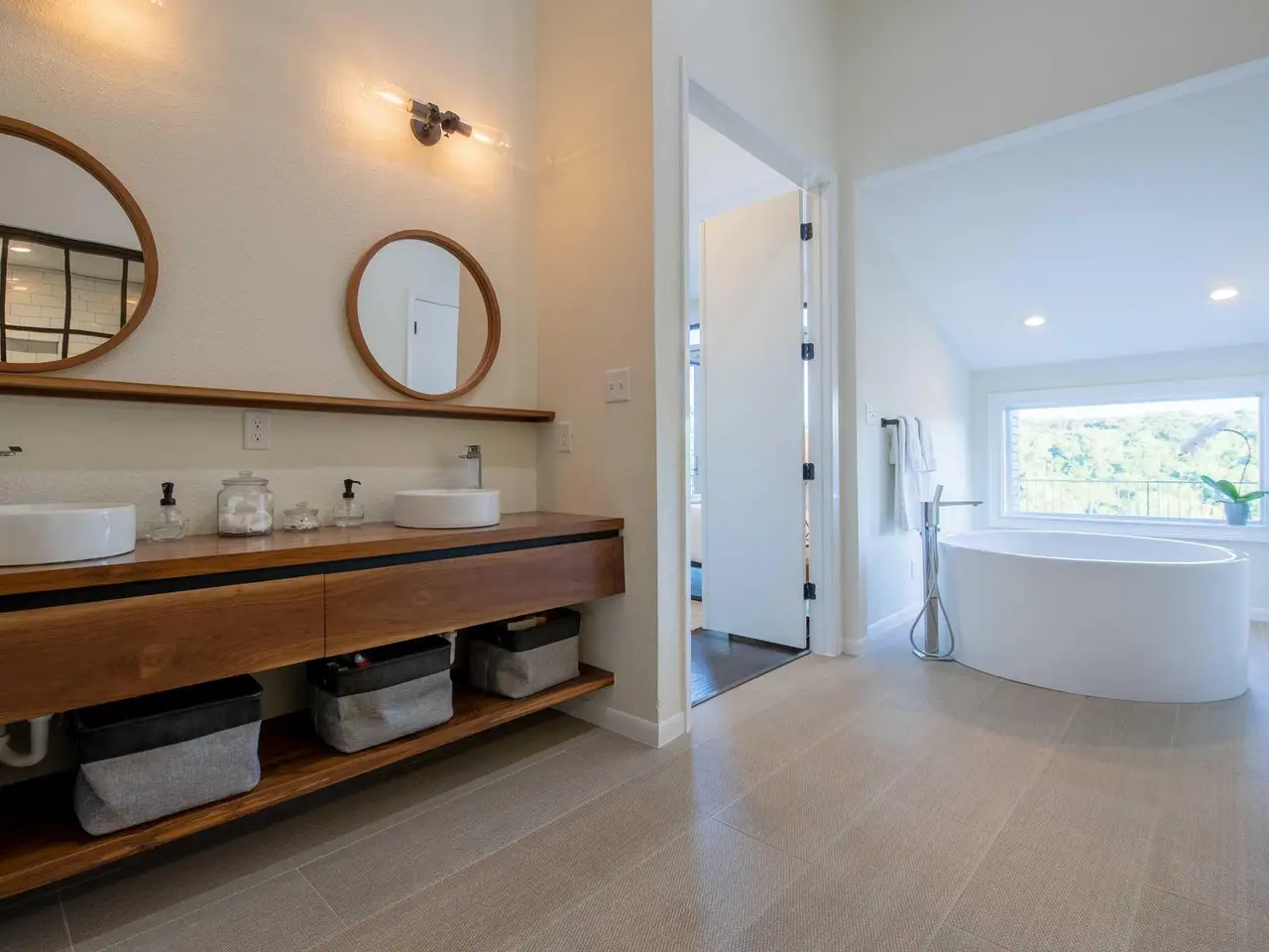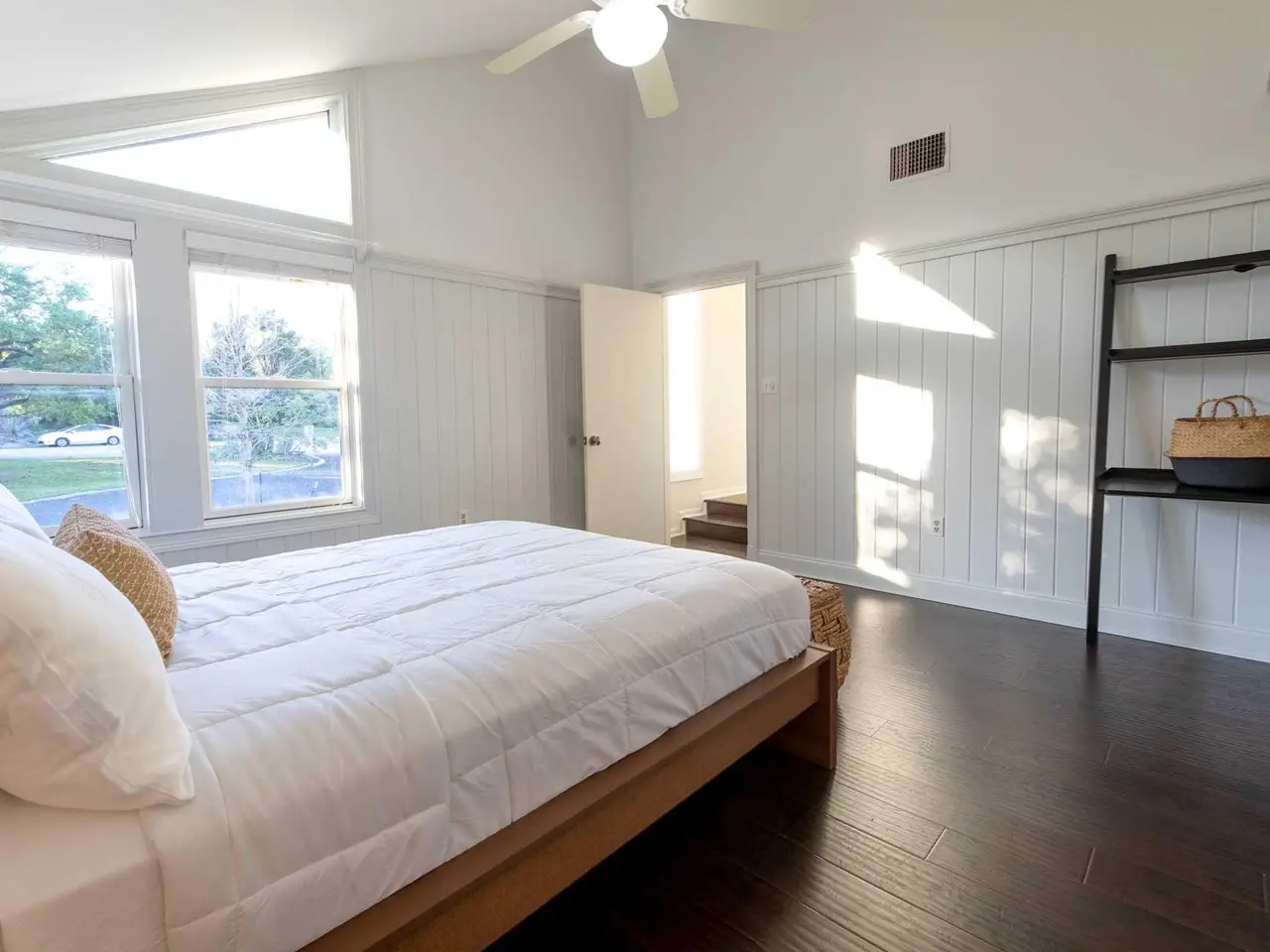 Luxe primary suite with lake views