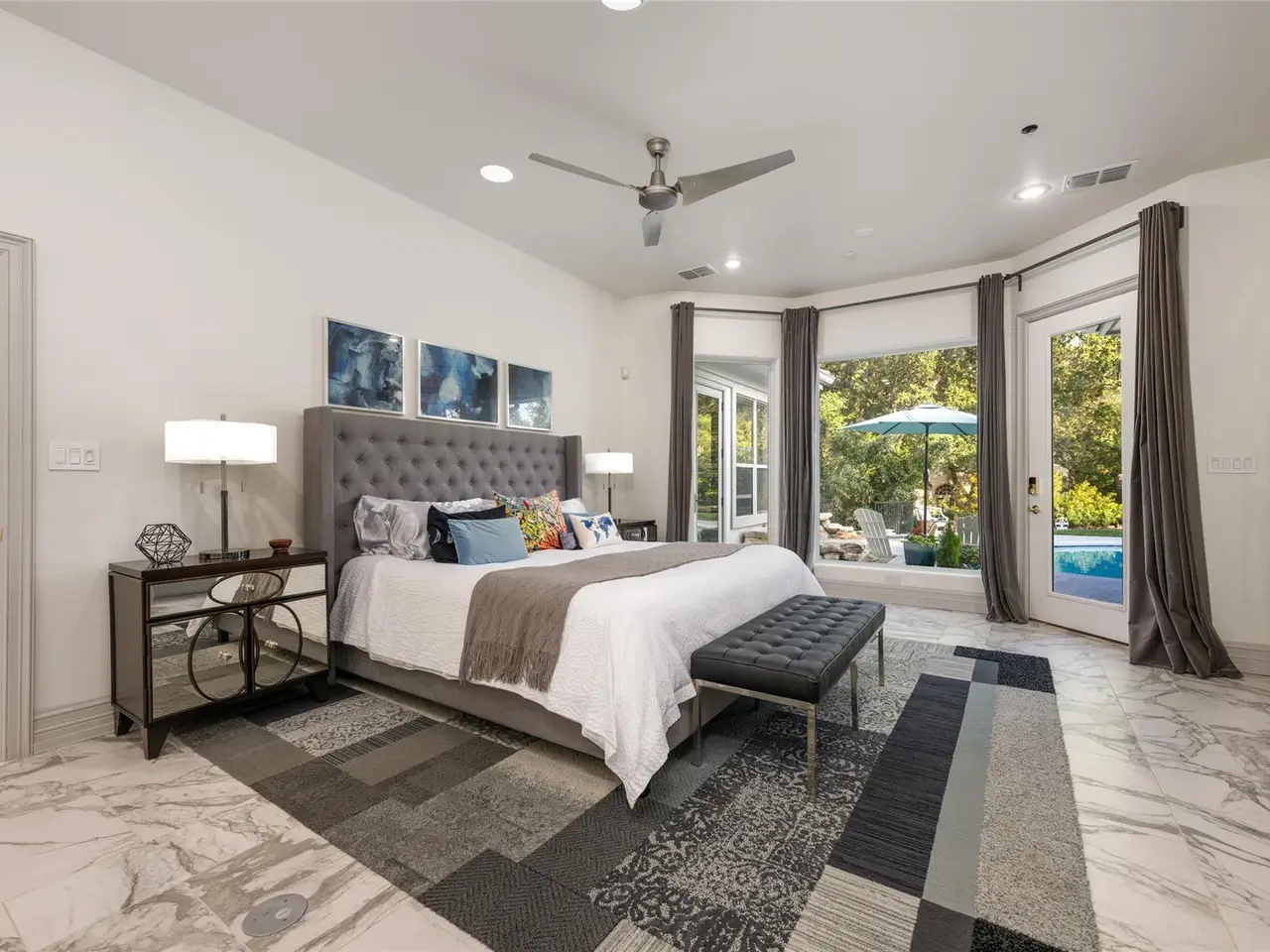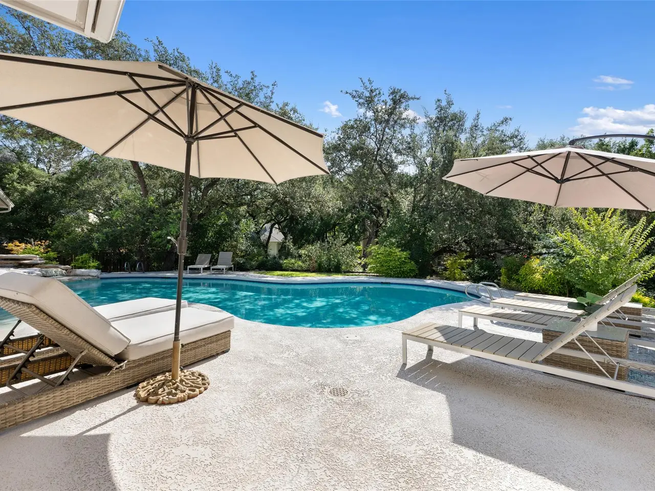 Spanish-style architecture meets contemporary luxury at this 4-bedroom, 3.5-bathroom home nestled in a quiet cul-de-sac. The beautifully curated interiors impress the moment you enter the residence, with gorgeous tile floors and a double-height rotunda. The resort-style pool is the home's focal point, with ample windows that invite picturesque views of the backyard inside. Enjoy the open-concept floor plan across multiple living and dining areas, including a living room with a fireplace, formal dining, a rounded breakfast nook, and a family room. The kitchen is outfitted with high-end stainless steel appliances by Viking, bar seating, a coffee bar, and a center island. The expansive media room boasts floor-to-ceiling bookshelves for your personal library, as well as stunning arched windows that provide the space with abundant natural light. Escape to luxury in the primary suite with backyard access and a spa-inspired bathroom with a soaking tub, heated floors, a walk-in shower, dual vanities, a walk-in closet, and a highly desirable indoor therapy pool. Guests will enjoy spacious bedrooms and upgraded bathrooms, including a second primary en-suite with a soaking tub, walk-in shower, and heated floors. In the backyard, tranquility and relaxation abound, with a resort-style pool and waterfall. Dine al fresco on the covered patio with a view of the landscaped backyard. The home has a pre-wired sound system, allowing you to easily connect your devices. A 3-car garage with a workshop and an EV charging station provides additional storage. The home is part of The Courtyard community, which offers access to a private park on Bull Creek featuring trails, playgrounds, and a dock for canoeing, kayaking, and other recreational activities, as well as access to Lake Austin. This home has perfected single-story living in a coveted Austin neighborhood. Tax and assessed values are estimates for illustration purposes only. All figures should be independently verified.
