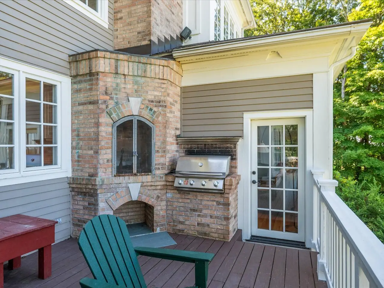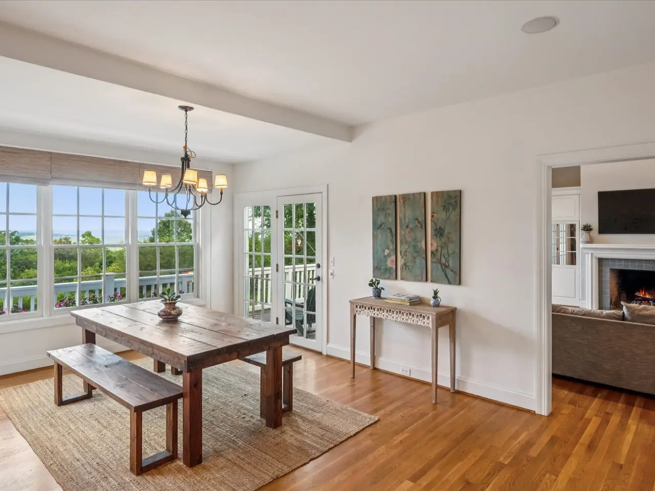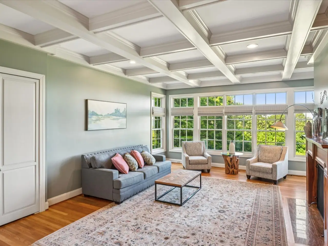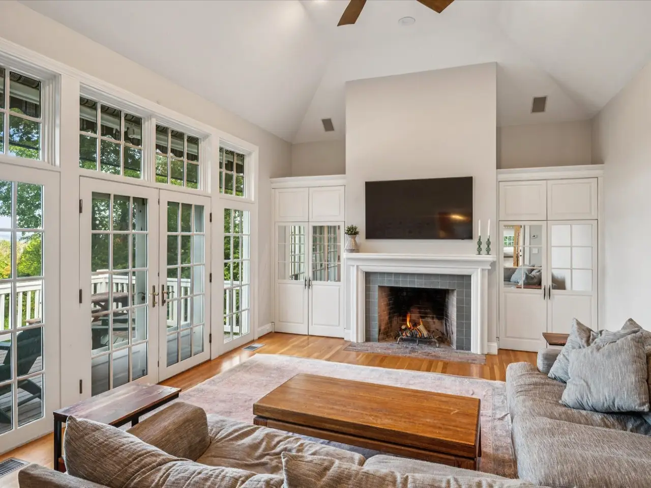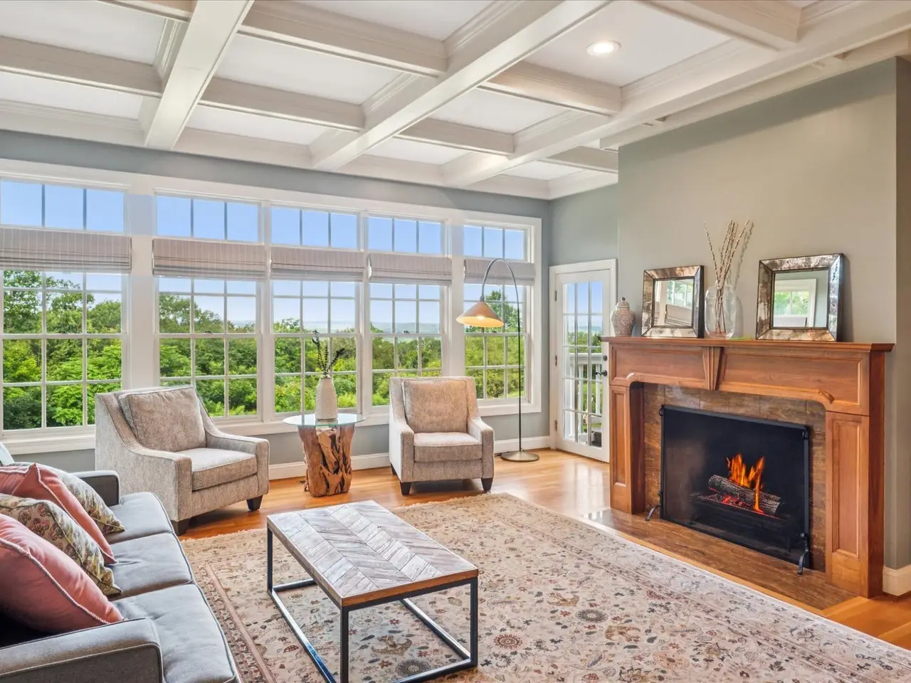 Window-filled living room with fireplace