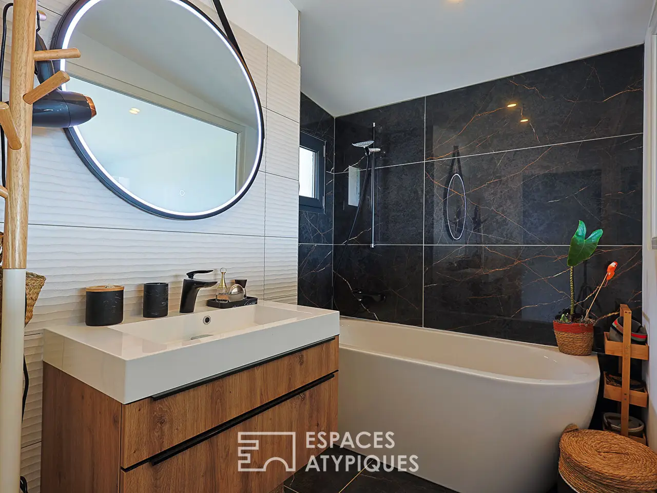 Villa moderne Built overlooking the Bay of Bandol, in the Var, this villa, completely renovated in 2023, combines design, functionality, and the Mediterranean art of living. Nestled in the heart of a quiet and secure residential area, it offers 180 sqm of spaces redesigned down to the smallest detail, enhanced by architecture with pure lines and constant brightness. From the entrance, the living room seduces with its generous volumes, its fluid ambiance, and its open kitchen with high-end finishes. The sliding bay windows erase the boundaries between interior and exterior, letting the sea view become a permanent tableau. The terrace of more than 100 sqm hosts a perfectly integrated infinity pool. On this same level, the villa offers an elegant master suite with private bathroom and custom-made dressing room, and its breathtaking view. Upstairs, two other bedrooms share a refined bathroom, while one of them opens onto a private panoramic terrace. The lower level, which can be adapted as desired, offers a separate studio with a kitchenette and shower room, a gym or cinema room as desired, as well as a laundry room and a large storeroom. The exterior is a true haven of relaxation overlooking the Bay, the landscaped garden hosts a 6-seater jacuzzi, a summer kitchen and an outdoor shower, all on a carefully landscaped 600 sqm plot with automatic watering and remote control. Parking is facilitated by a double carport and two additional spaces. From the outside, a second independent studio completes the whole. Home automation, ducted air conditioning, water softener, electric charging station: every detail has been thought of for optimal living comfort, without constraints. An ideal villa for year-round living or a turnkey second home, just a few minutes from the town center, the beaches and the typical pleasures of Bandol. Information on the risks to which this property is exposed is available on the Georisques website: www.georisques.gouv.fr Practical information ENERGY CLASS: B (106) / CLIMATE CLASS: A (3). Estimated annual energy expenditure (2021): between 1033 and 1397 euros. Marie Julie Astruc REF. 10827-cpy Additional information * 6 rooms * 5 bedrooms * 1 bathroom * 3 shower rooms * Outdoor space : 600 SQM * Parking : 4 parking spaces * Property tax : 2 610 € Energy Performance Certificate Primary energy consumption b : 75 kWh/m2.year High performance housing