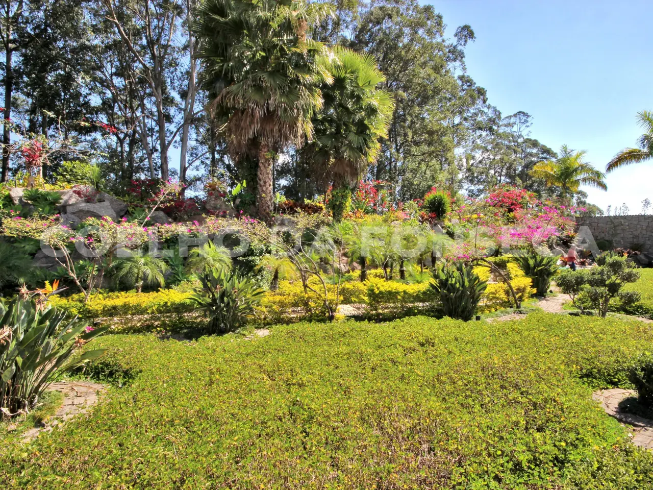 Vista exuberante e paisagismo com cascatas